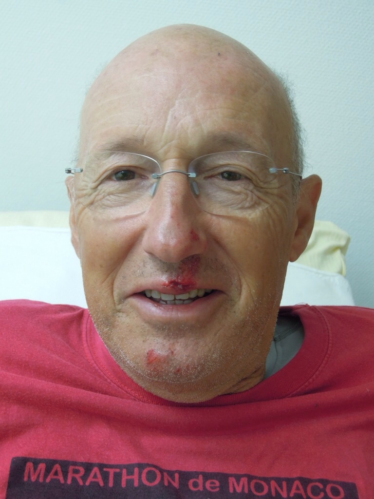 Yves par terre la tête la première d'un côté, le vélo de l'autre. Ça saigne, une voiture s'arrête, elle appelle les secours, la police passe et s'arrête … On parle en Anglais !!! Les secours arrivent enfin.