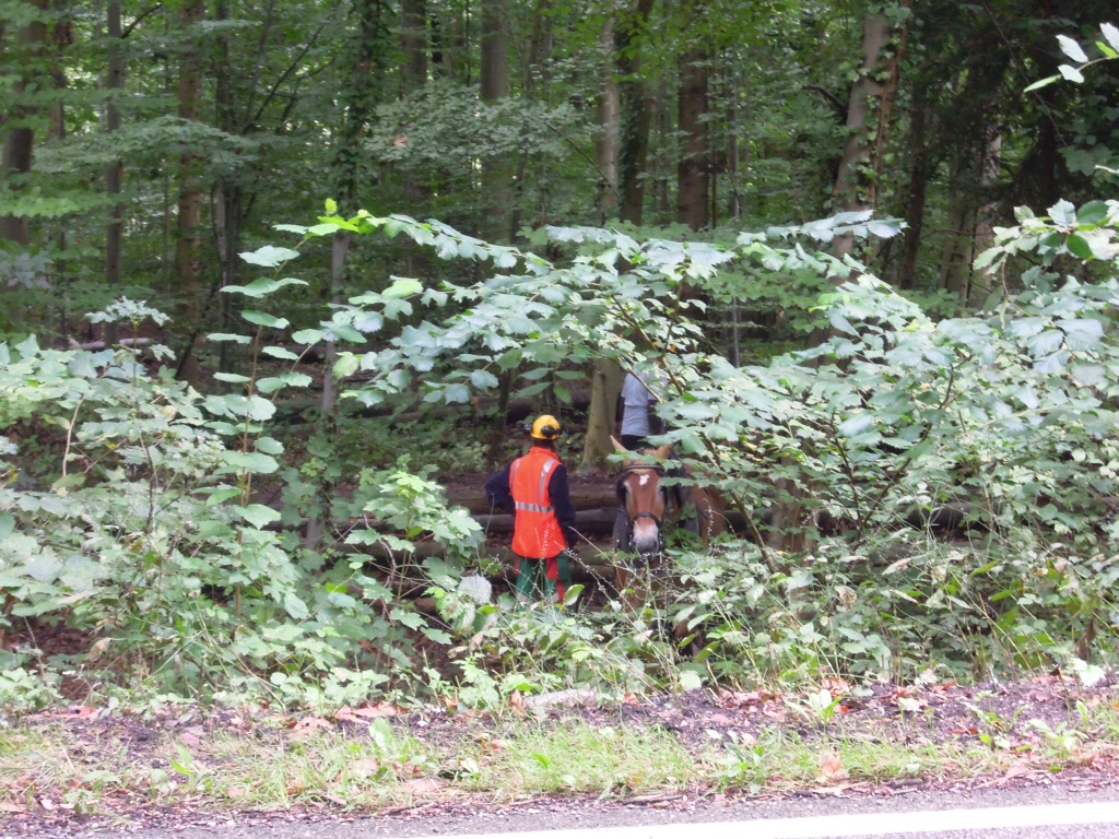 Des bûcherons qui transportent le bois avec un cheval.