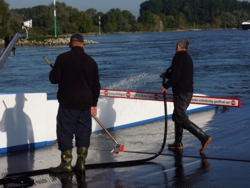 Pendant que les voitures descendent et que nous montons, grand lessivage du bateau… De vrais marins.