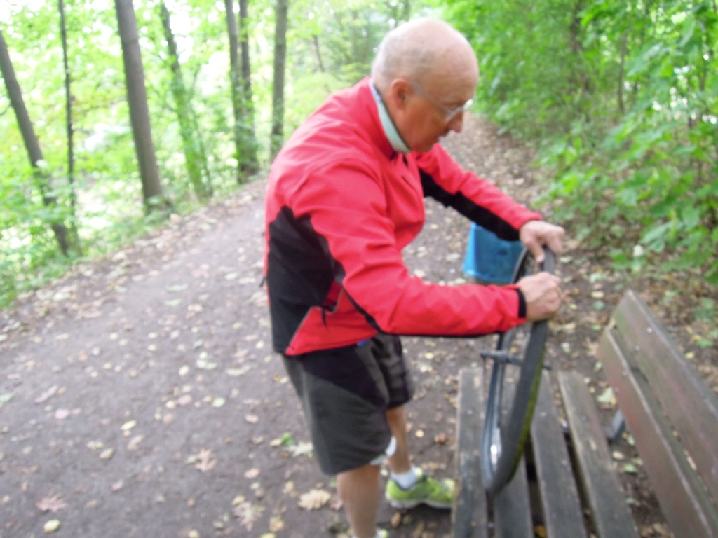 J'étais devant, j'ai attendu, attendu et il n'est pas venu !!! Mais que fait-il ? Pas de possibilité de se tromper, nous traversons un bois … Je me décide enfin à faire demi tour et là le vélo demonté. Avec ça vous voulez qu'on batte notre record de distance dans la journée !!!!!!!!!