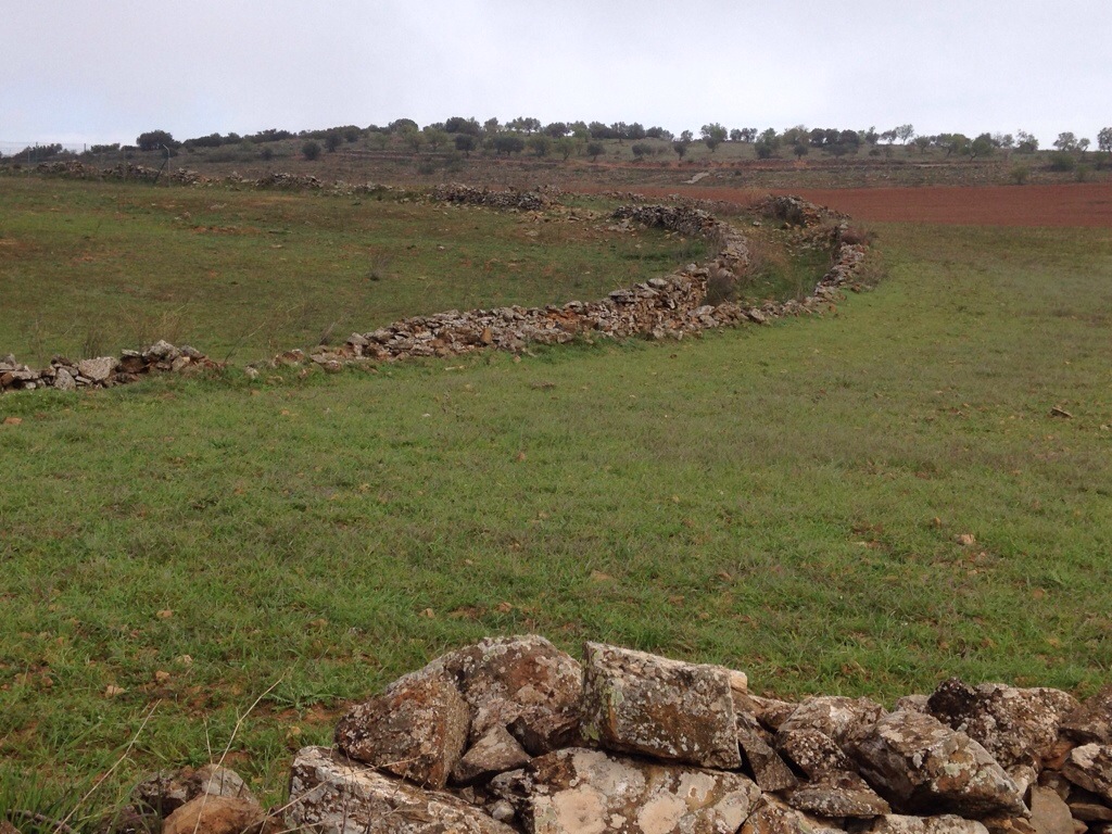 Mur en pierre sèche, draille et après des oliviers à perte de vue.
