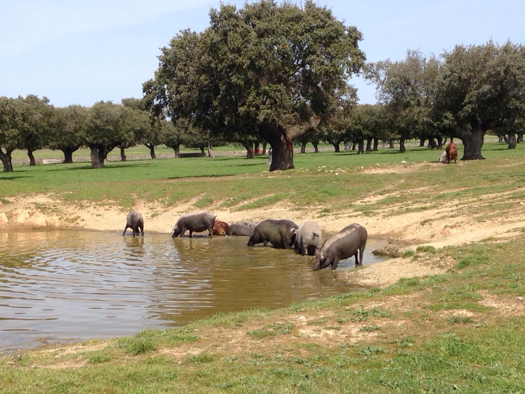 Étape de montagne avec le Pico de la Dueña 1200 m. Aucune difficulté, nous partons de 978 m. De longues et larges drailles, des chênes, et on retrouve nos cochons noirs. De vastes plateaux et toujours le soleil de plus en plus chaud à partir de 12 h.
