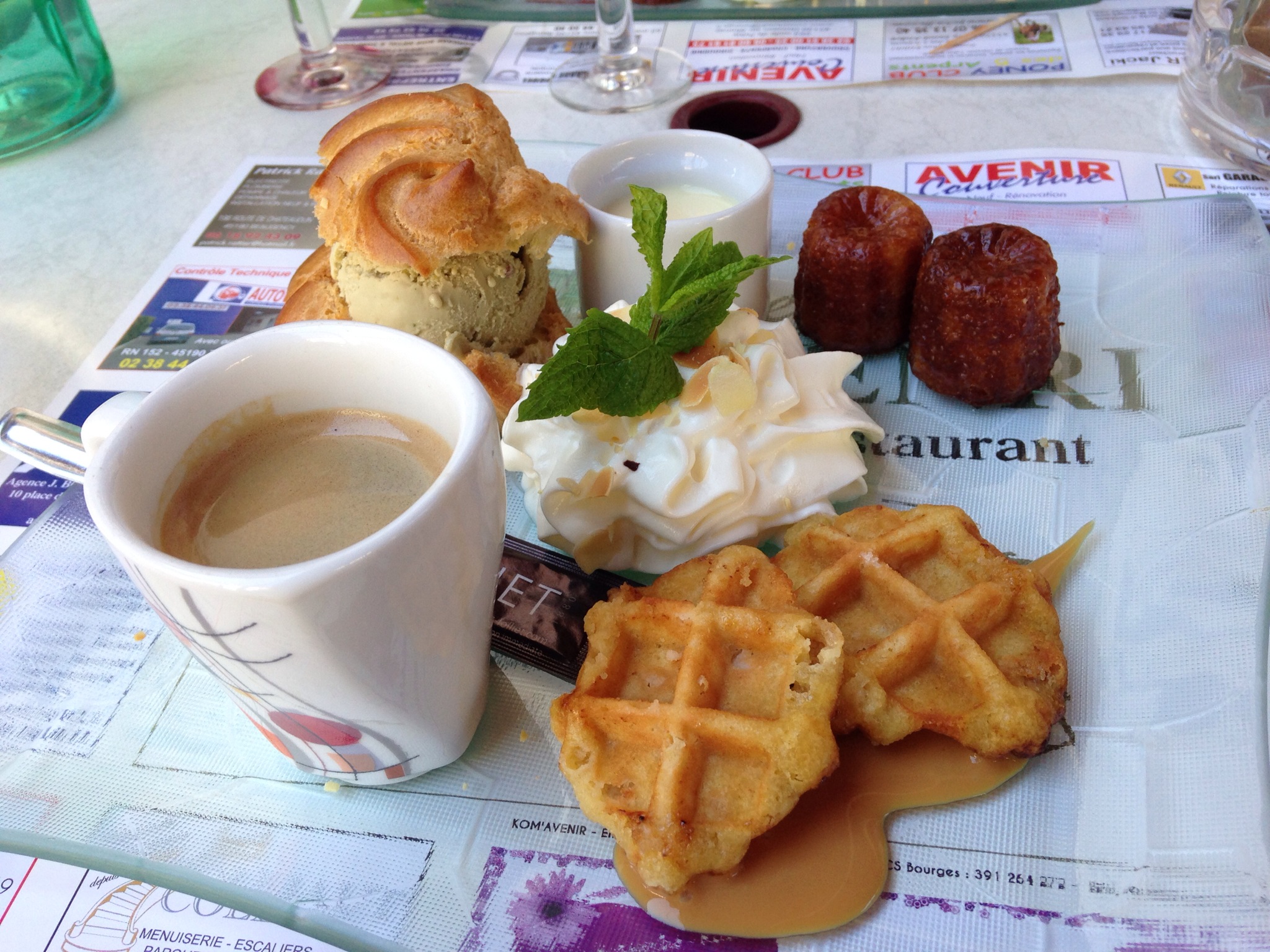 Entrée, plat du jour, dessert, verre de vin et café le tout pour 13 €. Le plat : andouillette frites que j’ai eu de la peine à finir et en plus on pouvait choisir la couleur du vin.