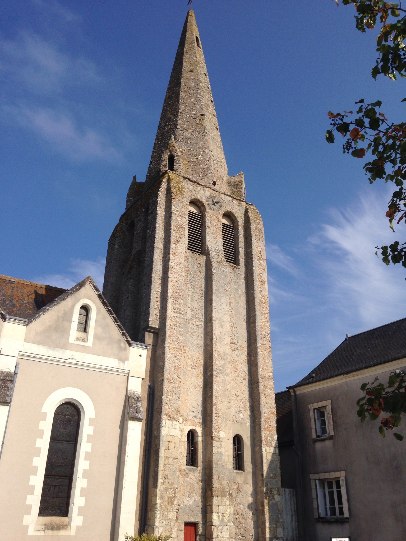 Veigné : église St-Brice avec un clocher à six pans de pierre.