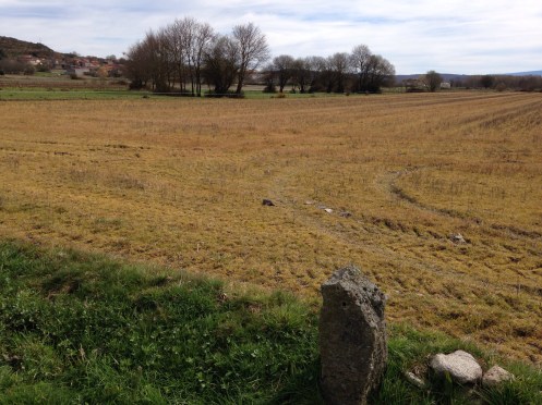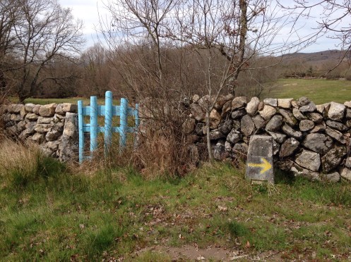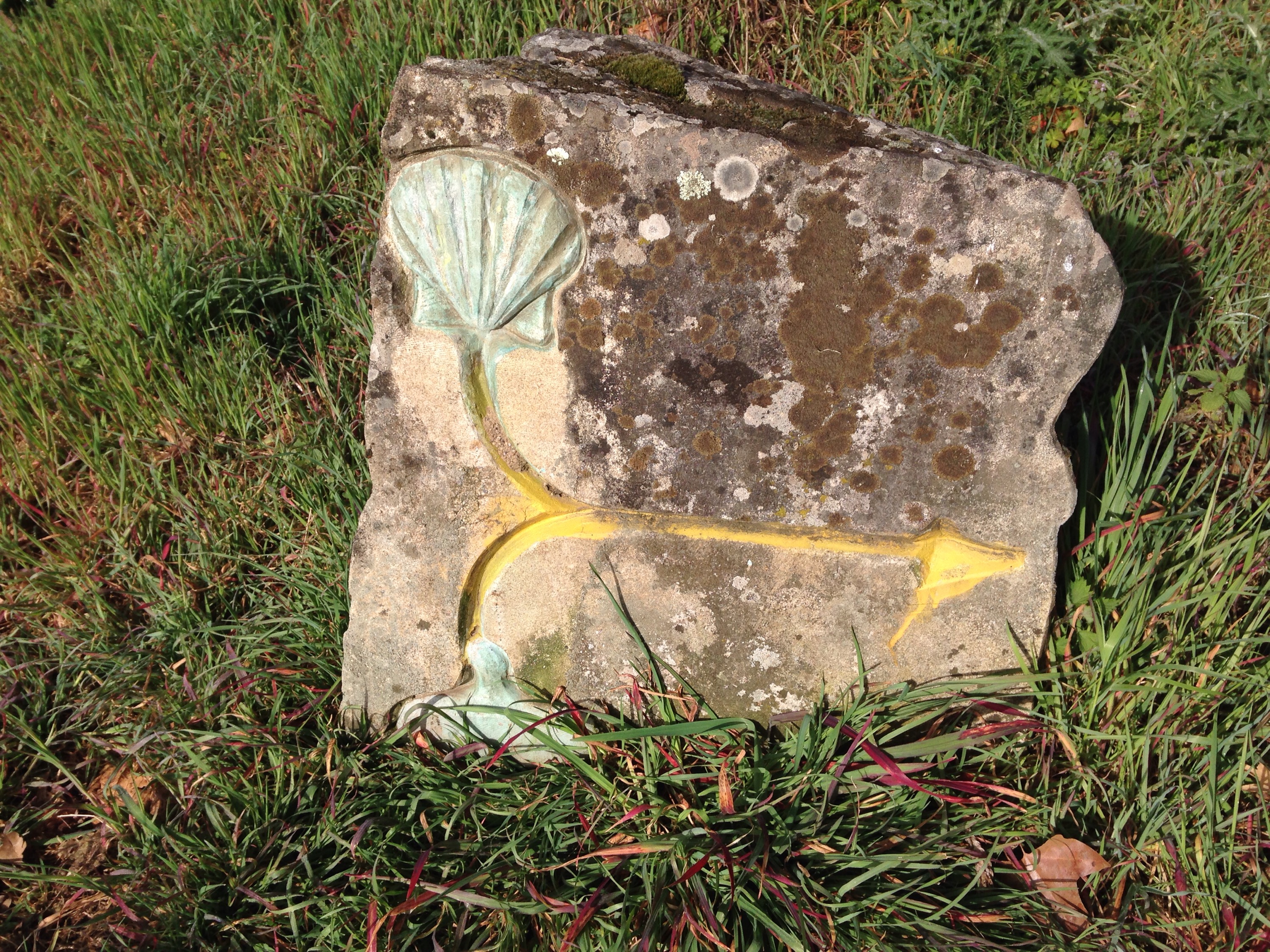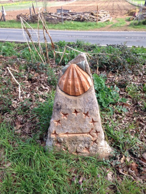 Enfin une borne qui n’a pas été détériorée. Depuis que nous sommes en Galice ces bornes portent le kilométrage exact qu’il nous reste jusqu’à Santiago. Il est enlevé partout. C’est la deuxième que je vois entière. Les gens ne respectent rien partout dans le monde.