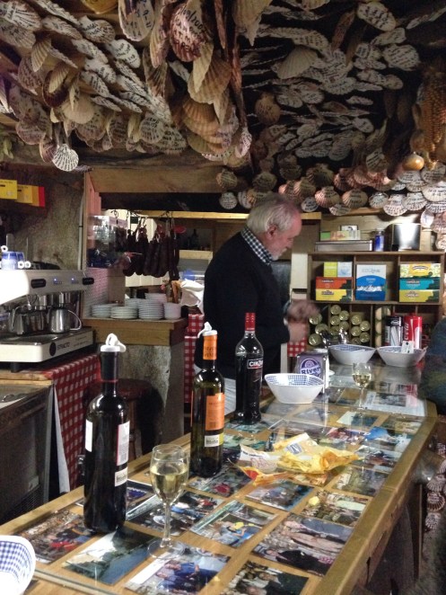 Albergueria. Le bar le plus photographié du Camino. Tous ceux qui s’arrêtent écrivent leur nom sur une coquille qui ira décorer les murs.