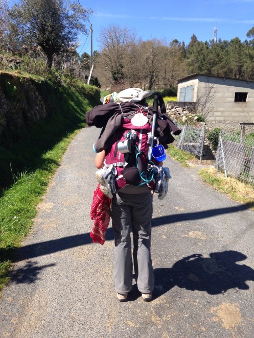 Le sac à dos bohème d’une Portugaise avec chaussettes, chaussures, quart, etc … qui pendent et brinquebalent !!!