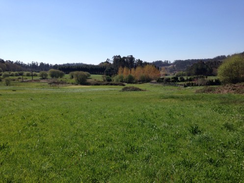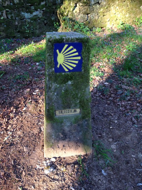 Sortie rapide de la ville et nous voici 10 mn plus tard dans la campagne devant une borne qui nous annonce Fisterra à 88,022 km. Juste 3 ou 4 jours de rando. Ça va dépendre de notre condition physique et de la chaleur.