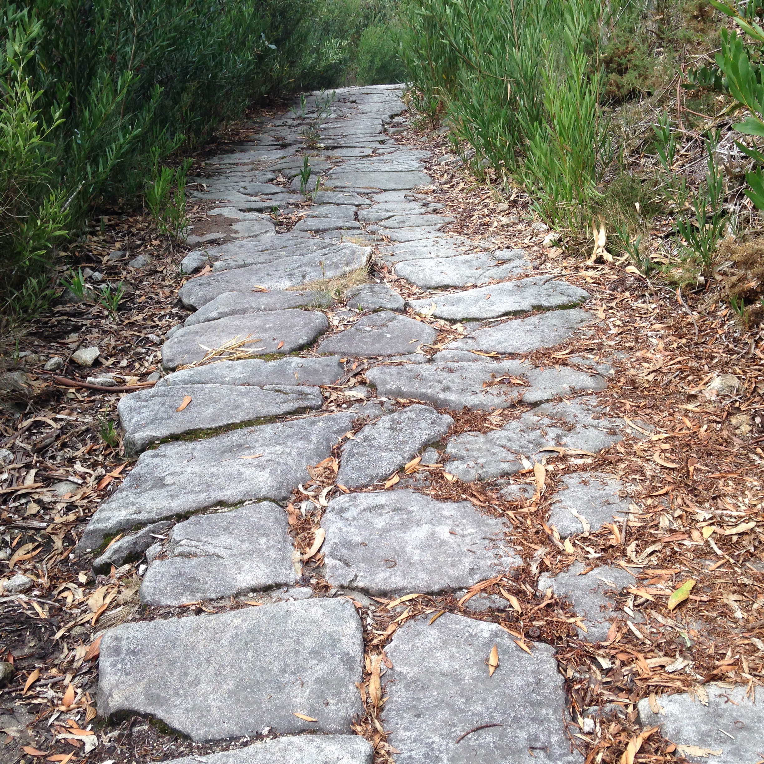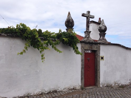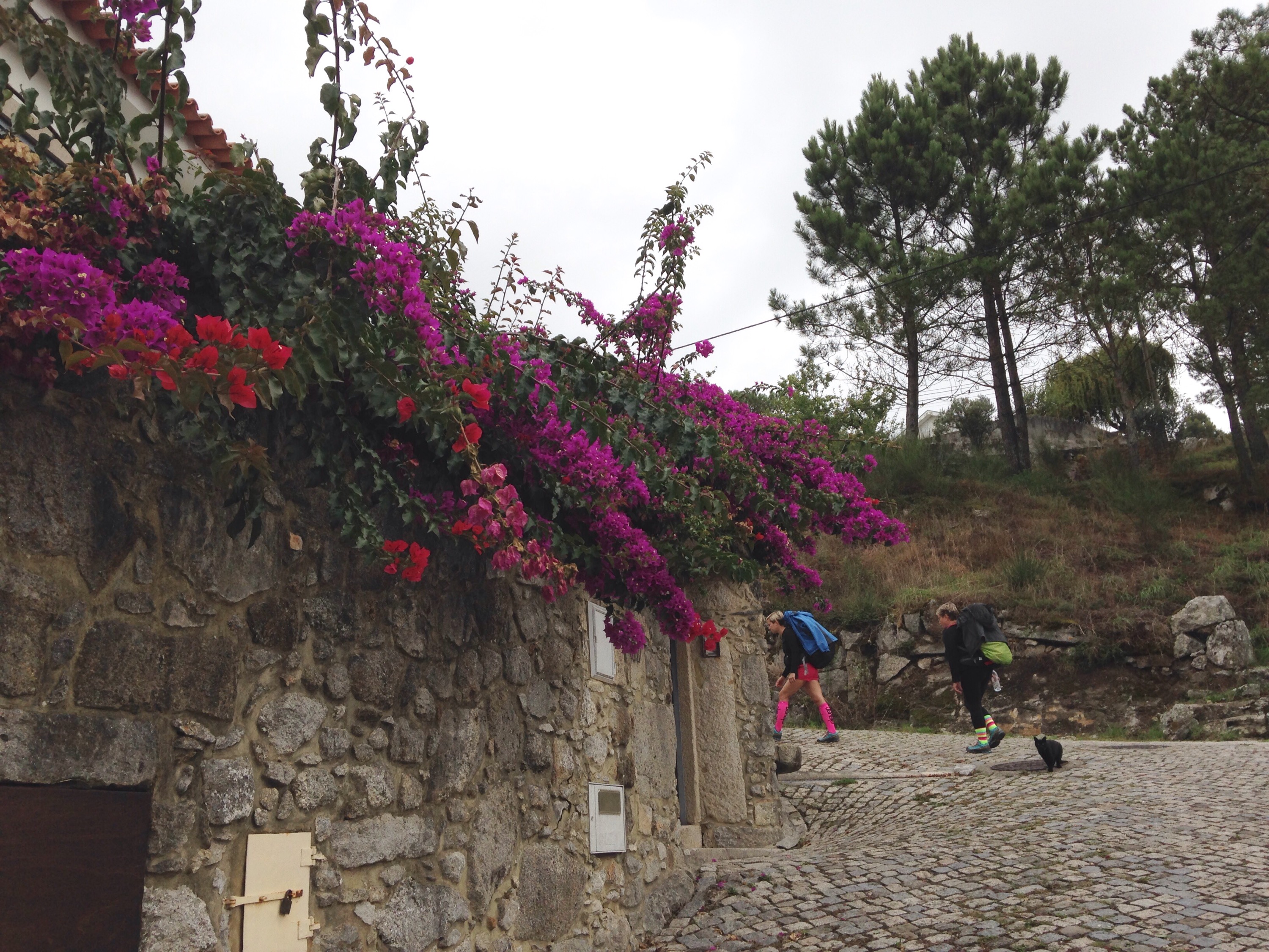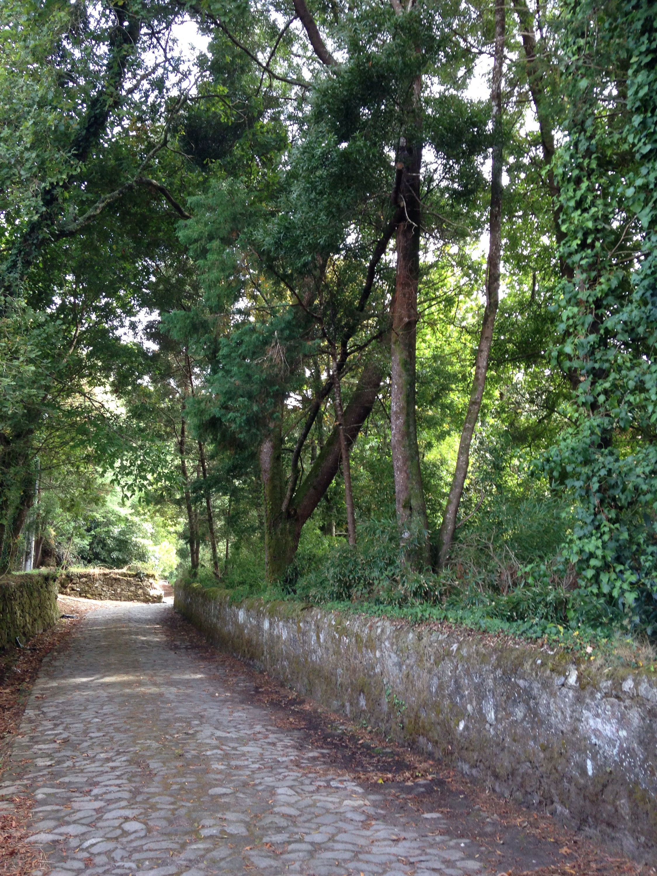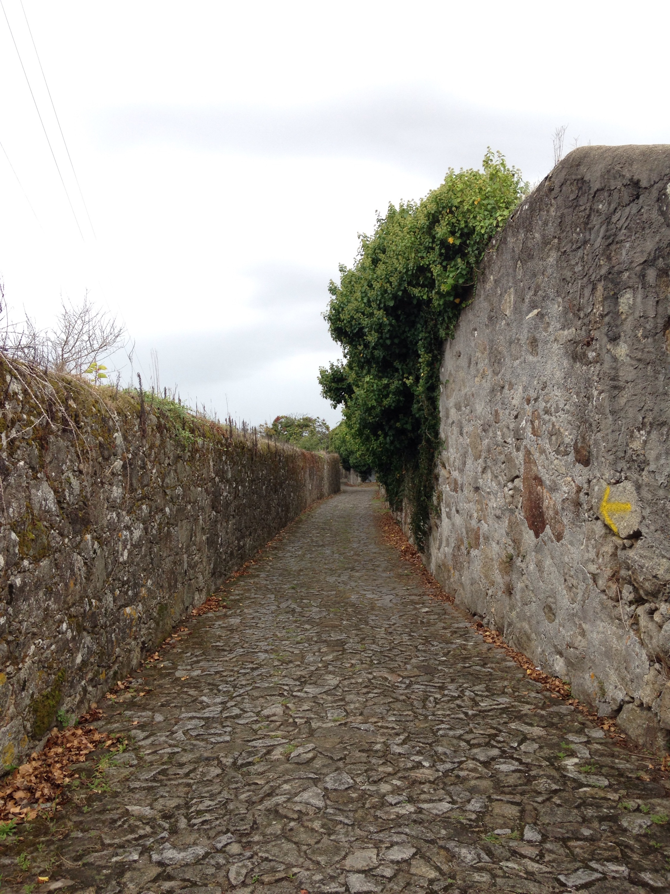 Après une montée rapide dans la ville nous trouvons des rues pavées bordées de hauts murs.