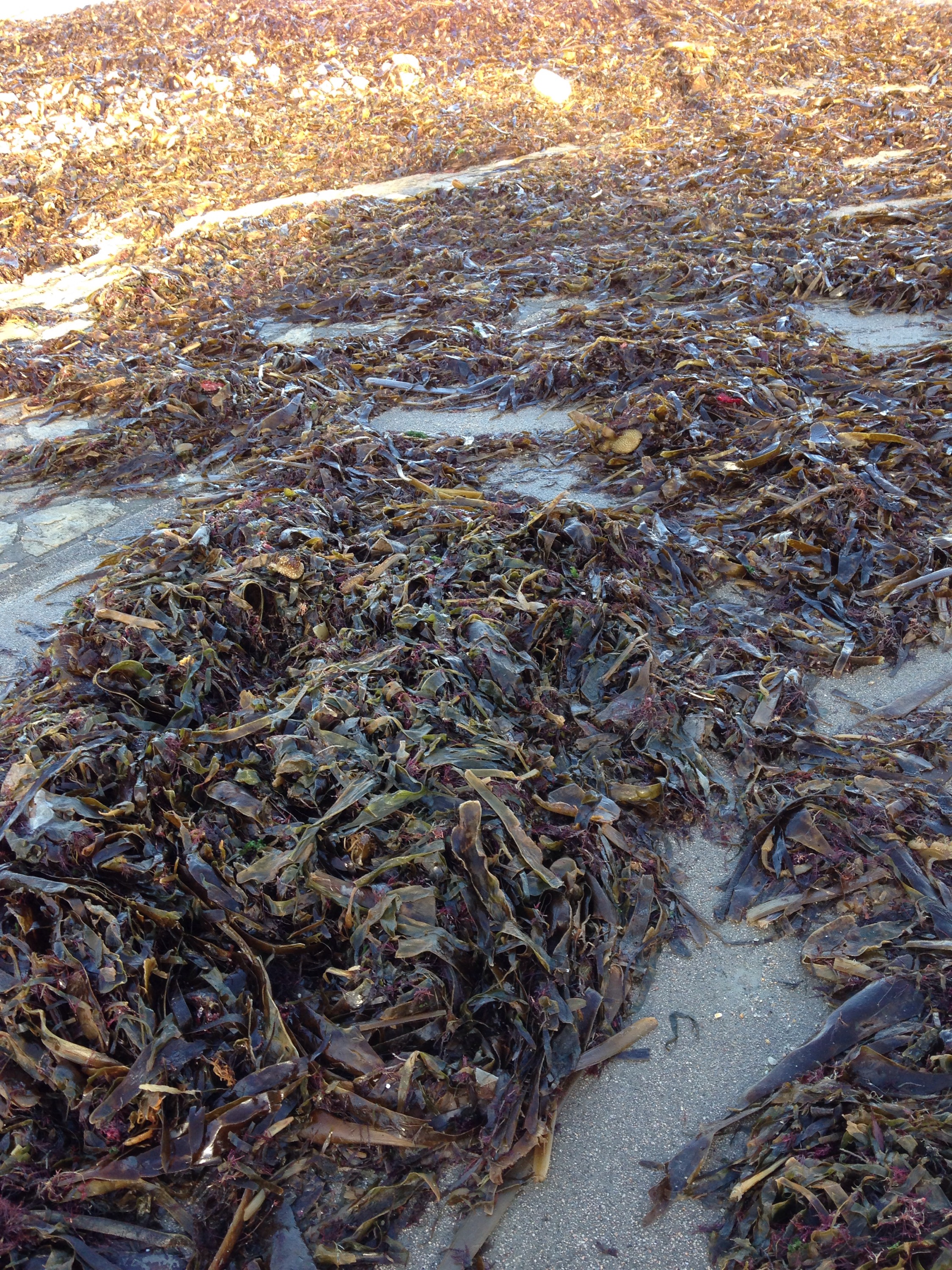 Hier soir, nous nous sommes promenés le long du port au-dessus de ce trottoir. De temps en temps, les vagues l’arrosaient mais il était propre. Ce matin, il est rempli d’algues !!!