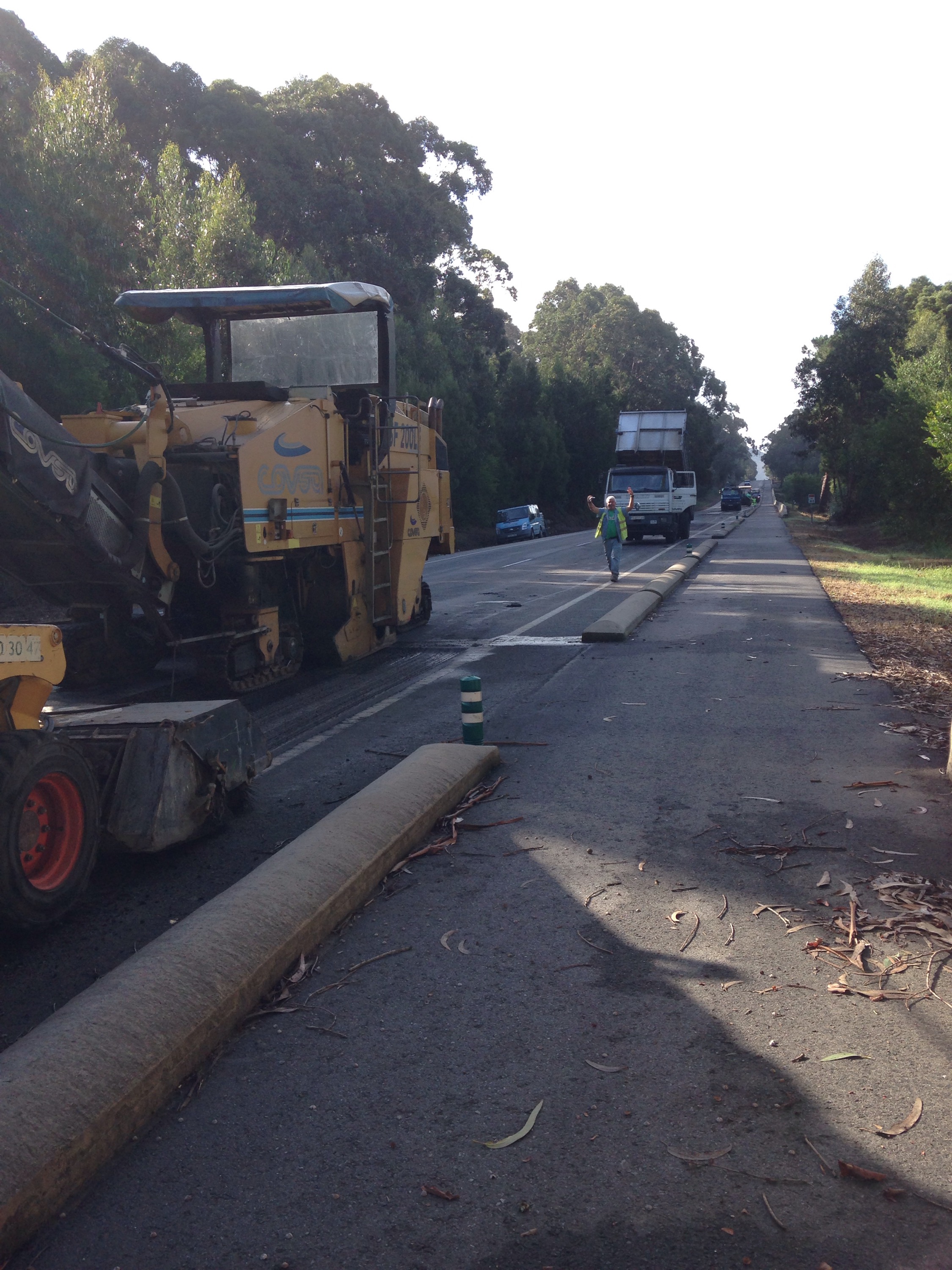 La route avec sa piste cyclable et le regoudronnage de la chaussée par endroits.