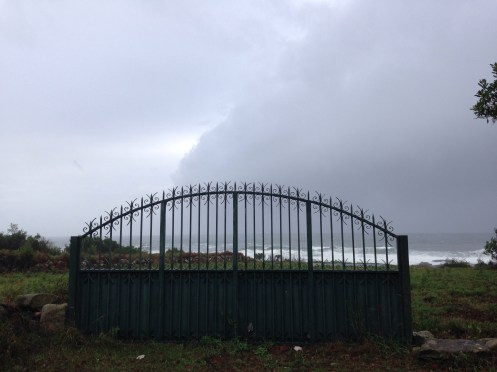 Un grand portail face à un champ qui donne sur la mer. Étrange !!!