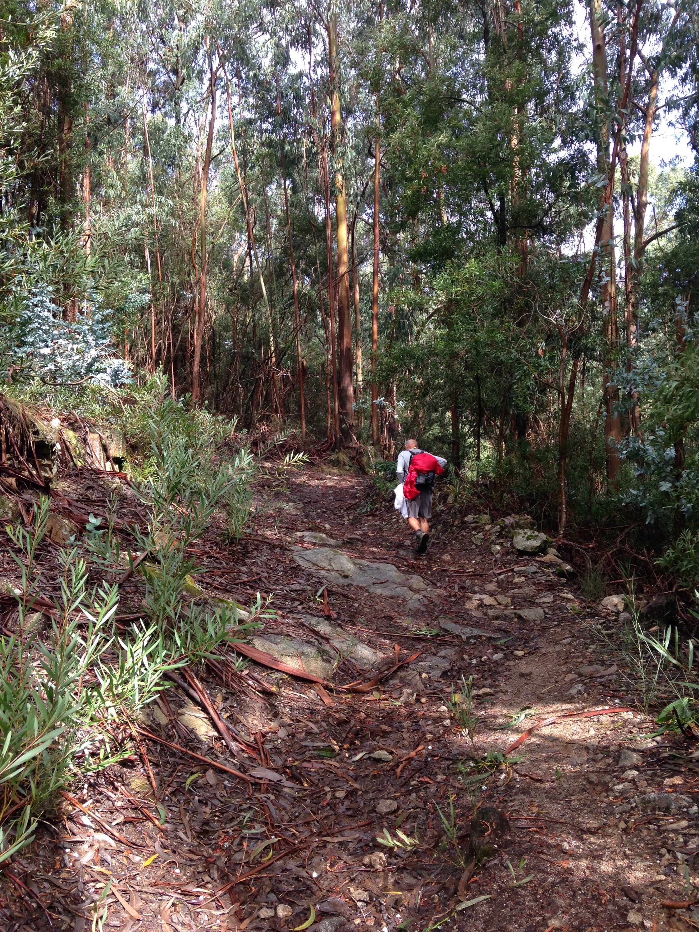 Nous grimpons sur la colline et traversons une immense forêt d’eucalyptus.