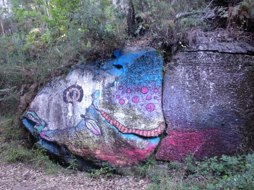 Votre ciel a été digne du notre ( toujours pb d’accent, j’enrage ), j’aime bien ce rocher peint !! Notre journée feria et visite de Nîmes s’est très bien passée et s’est terminée pour eux par un passage à la Guillaumette. Aujourd’hui Maryse reçoit une amie commune de Nîmes et les Rouget et moi comme chauffeur et cerise sur le gâteau …espérons qu’il fera bon dans son jardin ! Bonne route, je vois que vous approchez de Santiago !