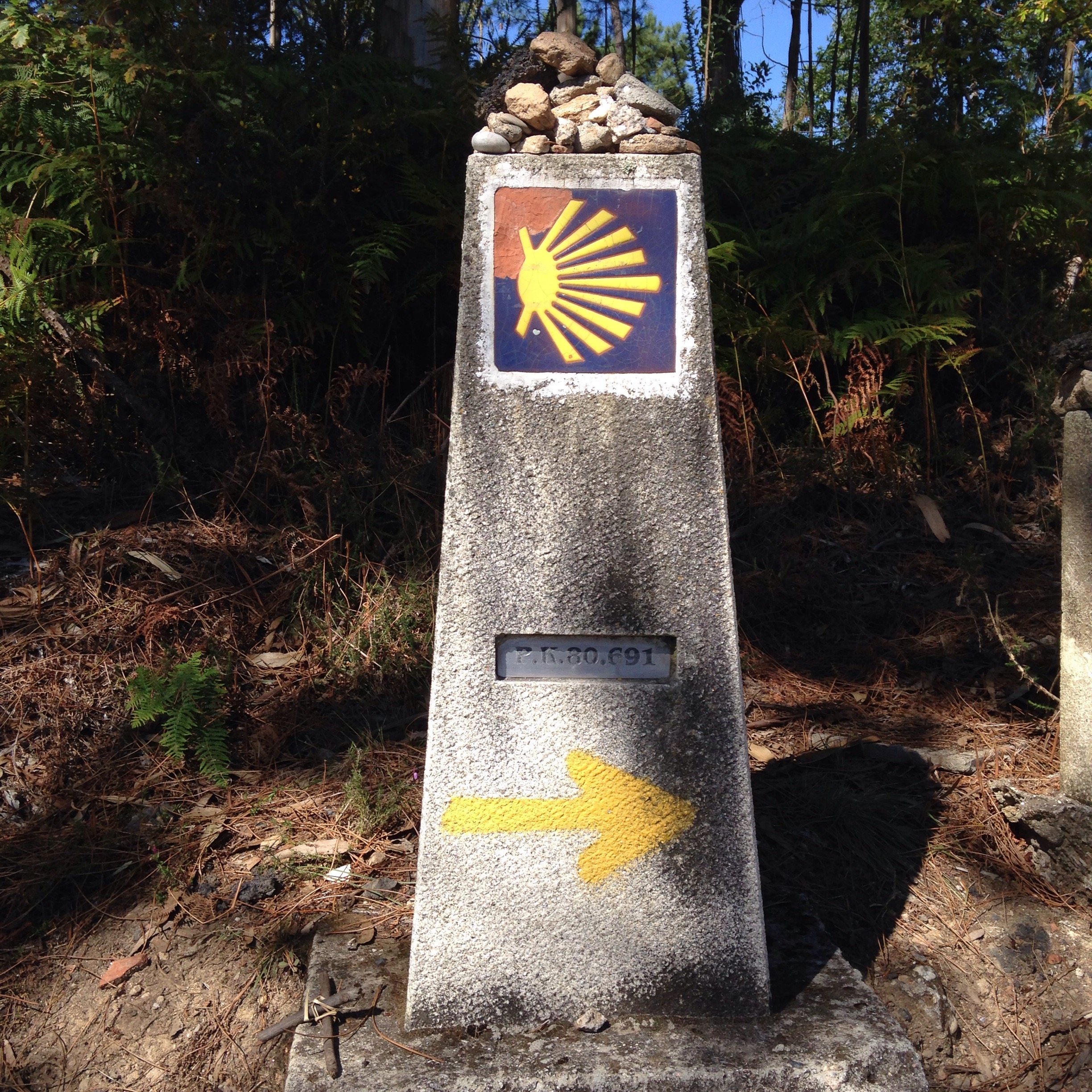 Les bornes que nous avions rencontrées en Galice sont à nouveau là. Cette fois-ci le kilométrage n’a pas été enlevé. 80,691 km sur celle là. J’adore 691. Comment font-ils pour être aussi précis ???