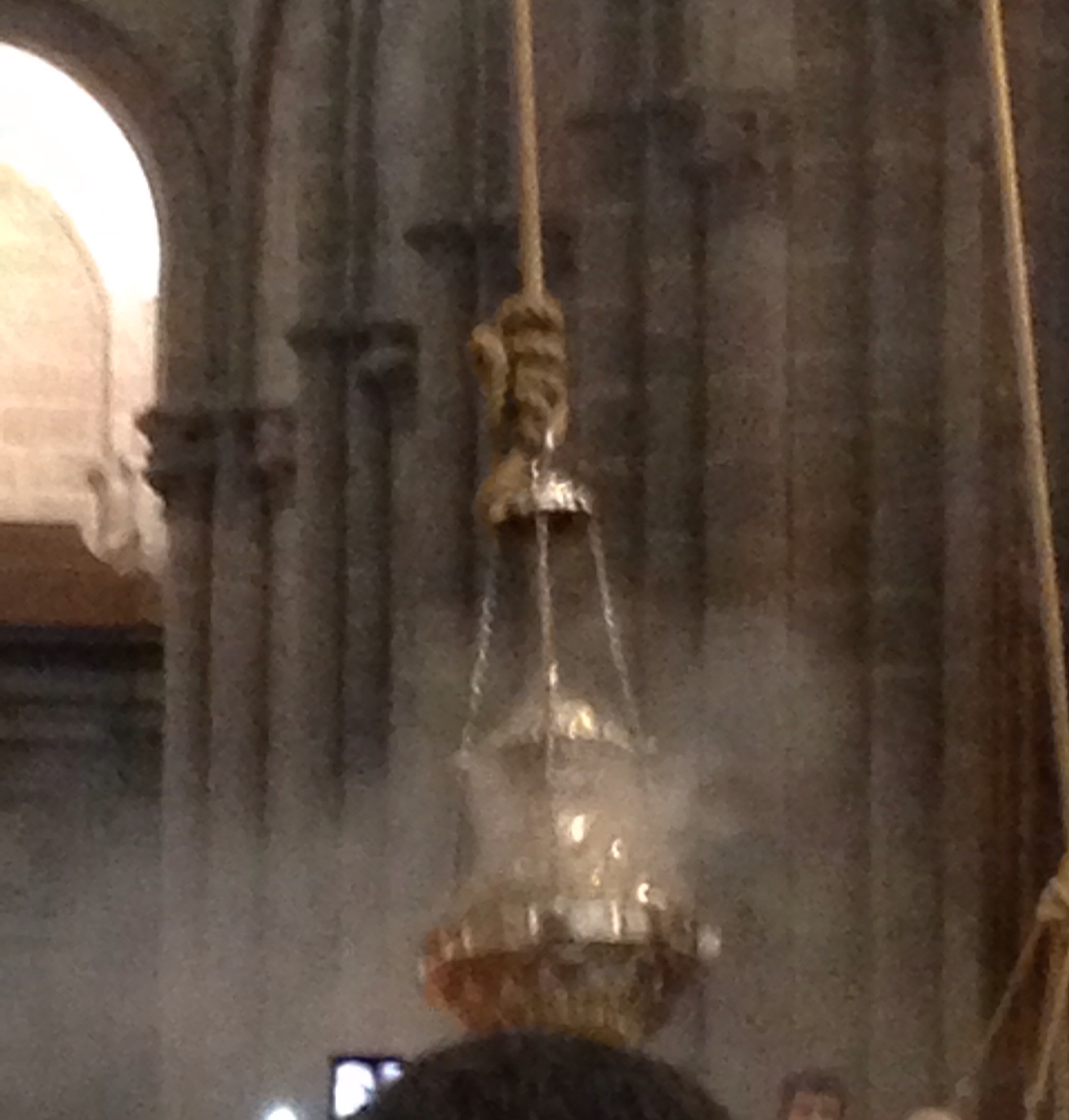 Le botafumeiro en action. Nous sommes allés à la messe du vendredi à 19 h30 pour le voir.