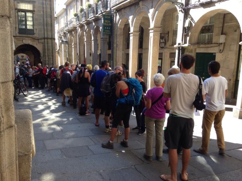 Comme tous les jours il y a la queue devant le bâtiment où l’on délivre la Compostela.