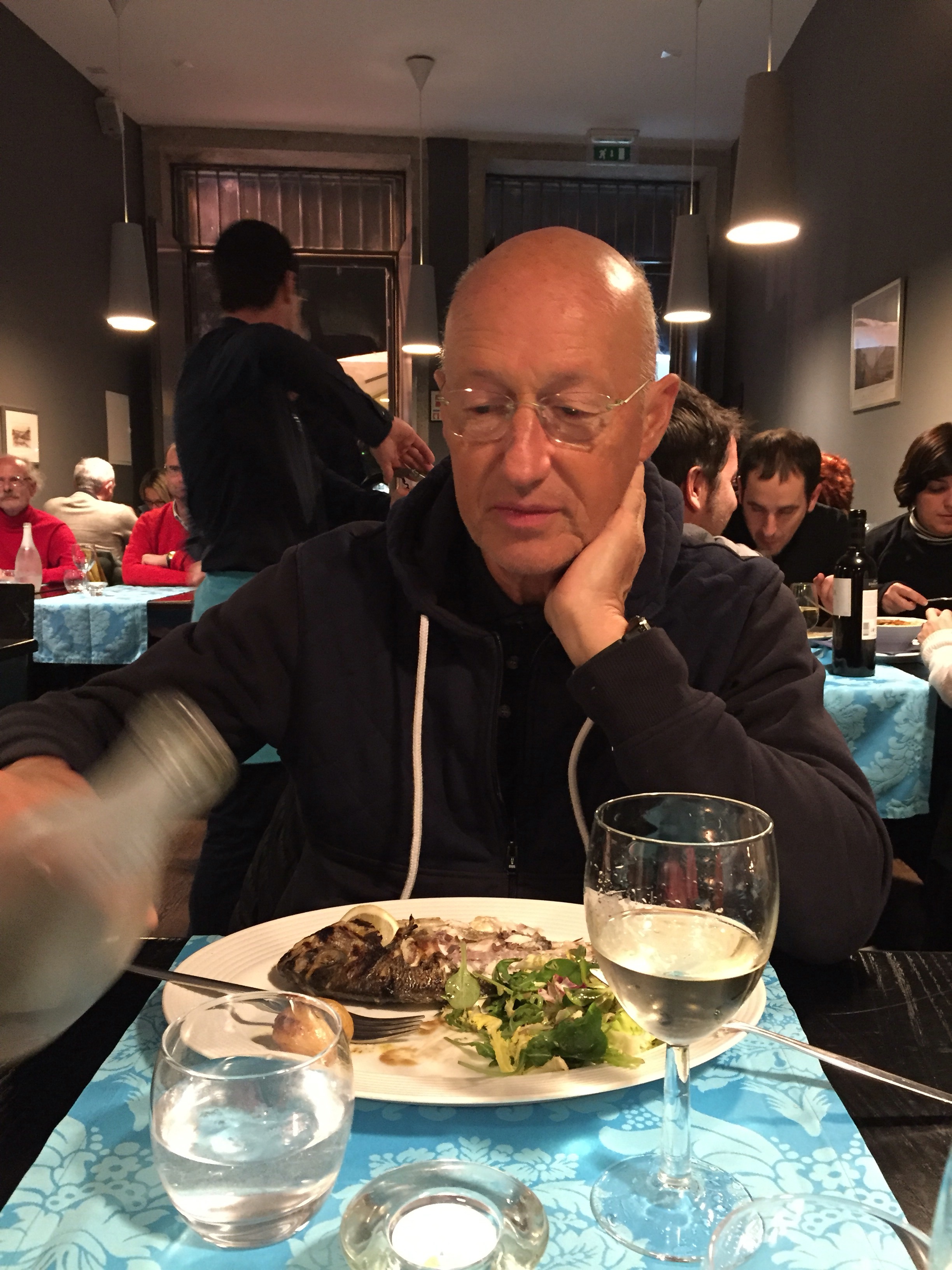 Retour près du port pour le repas du soir. Nous n’avons trouvé qu’une place à l’extérieur sur la terrasse du restaurant qui est plein.