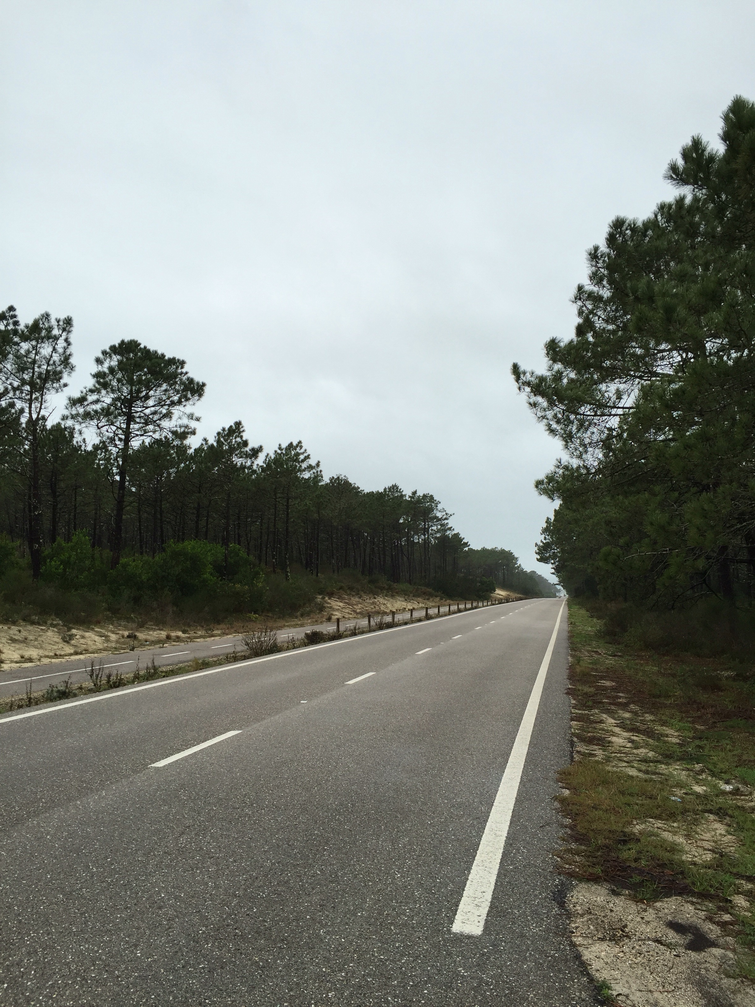 Petite route tranquille au milieu des pins. C’est droit, droit et bien agréable.