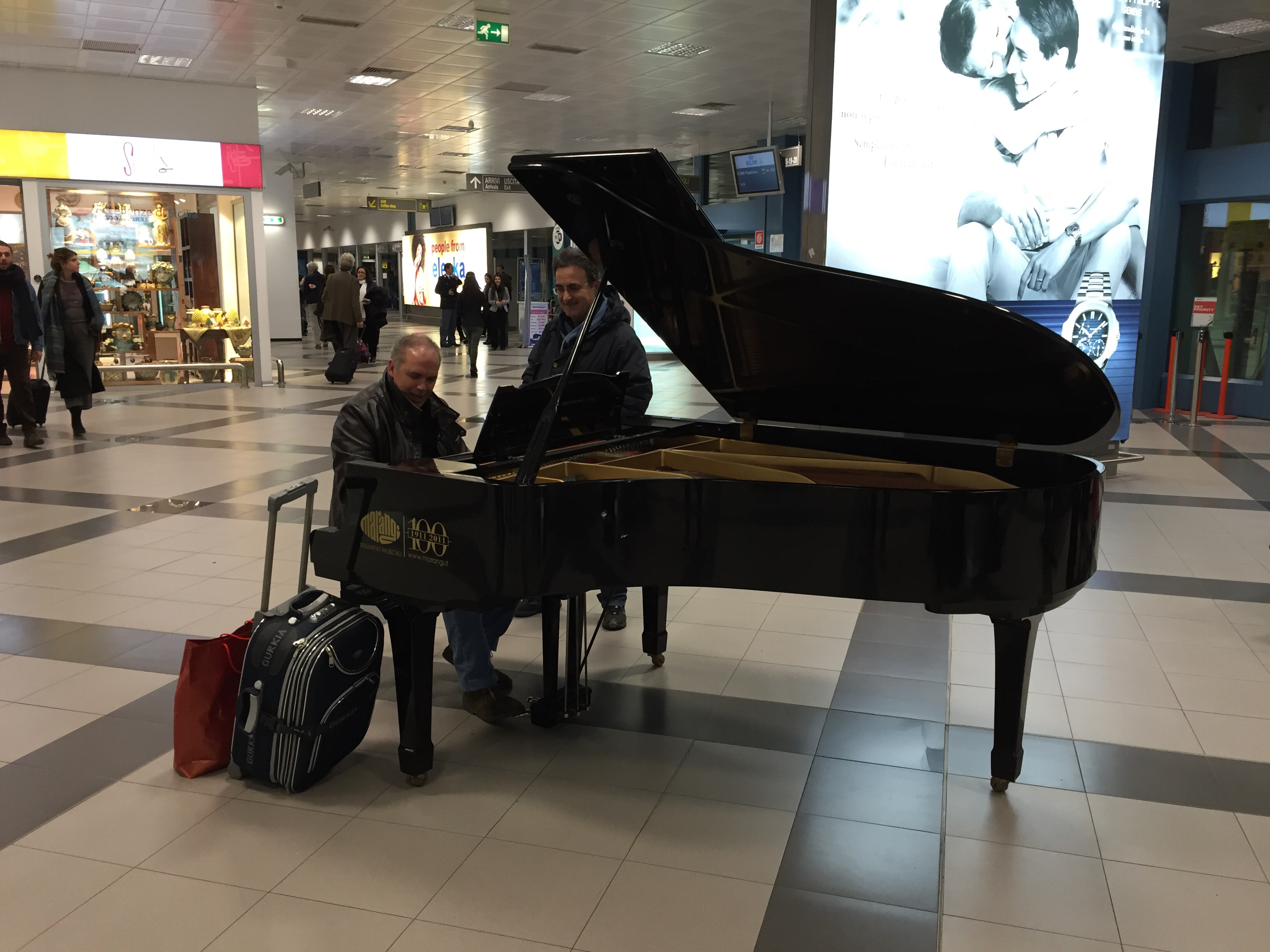 Et voilà l’aéroport. Nous avons la chance d’entendre jouer 2 morceaux par un passager, c’est le seul qui osera ou qui saura suffisamment bien jouer pour s’asseoir devant ce piano qui est à la disposition de tout le monde. Il a vraiment mis de l’ambiance !!!