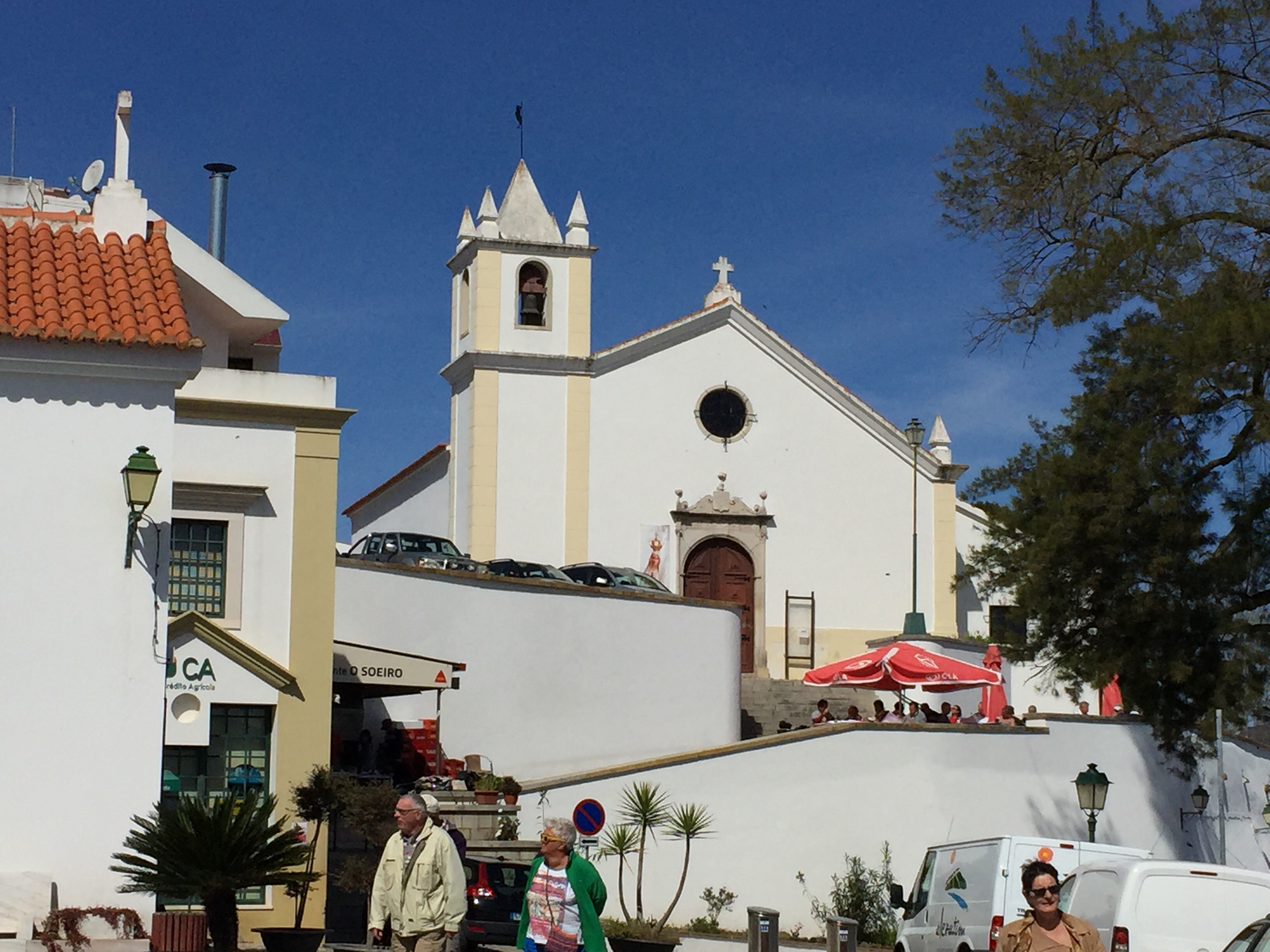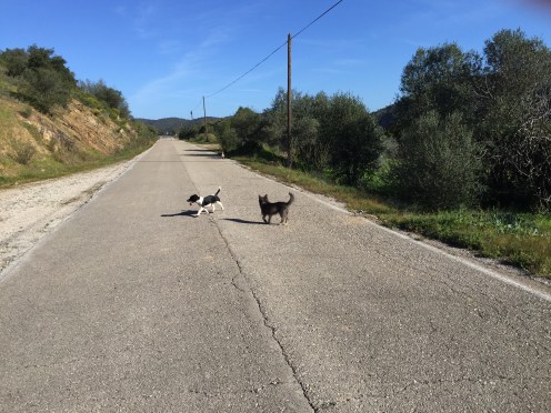 Un sujet très important au Portugal : les chiens. D’habitude ils ne sont pas au milieu de la route mais chaque fois que nous passons devant des maisons isolées nous sommes accueillis par un concert d’aboiements. Il y a toujours un minimum de 2 chiens et très souvent 3 ou 4. Ils ne sont jamais en liberté. La photo est une exception.