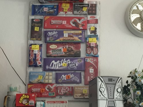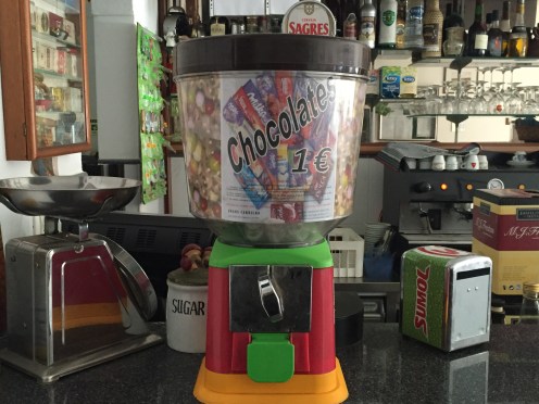 Pas question de choisir. Il faut mettre 1 €, tourner la manette et il sort une boule avec un numéro. Nous avons eu droit à du chocolat au lait !!!
