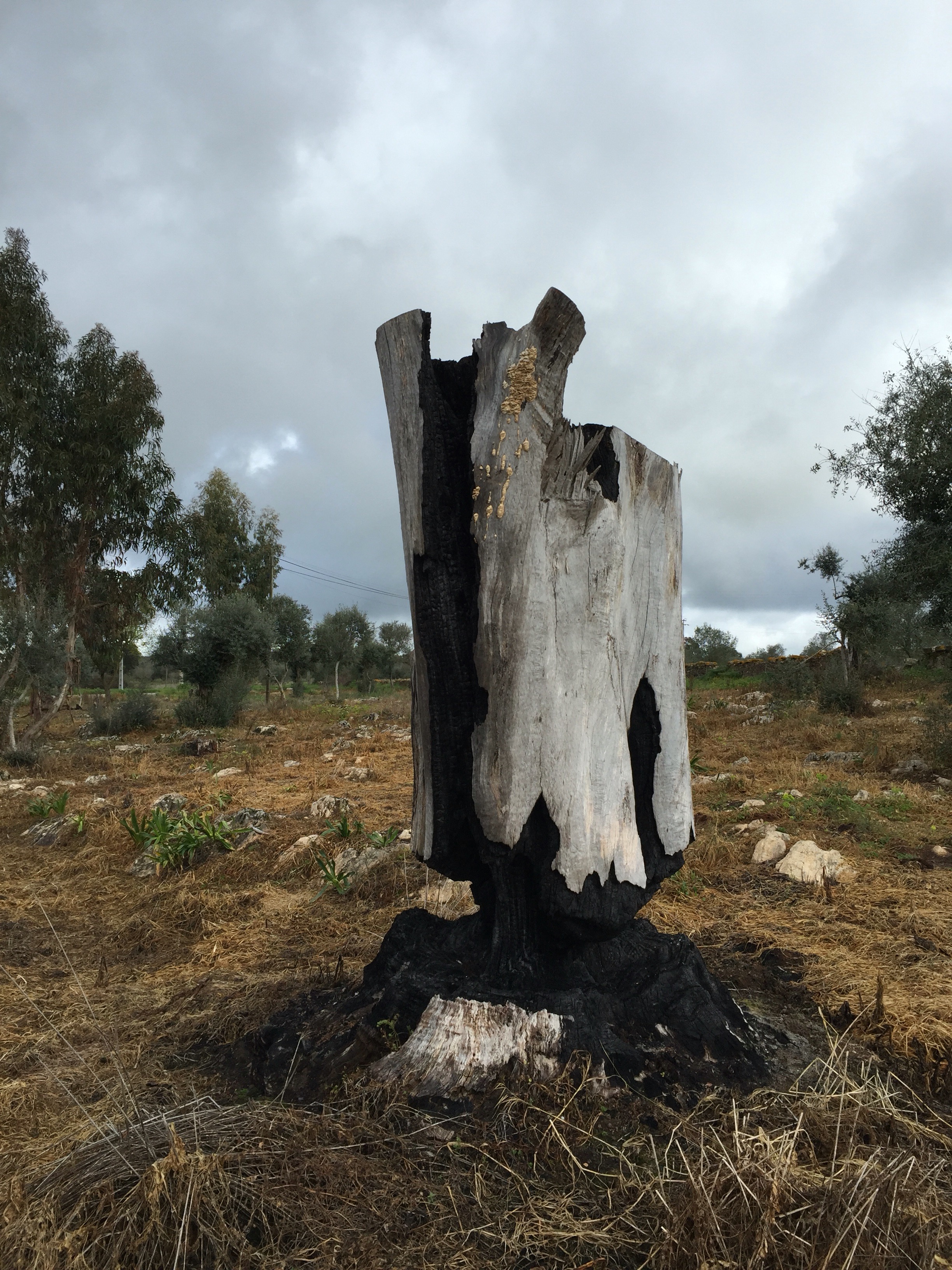 Tronc d’eucalyptus brûlé, on dirait une sculpture.
