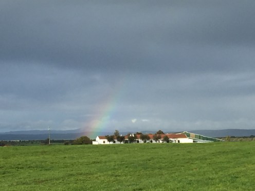 C’est le côté gauche qui a gagné, une forte averse suivie d’un joli petit soleil et d’un bel arc-en-ciel. C’est notre deuxième averse de la journée. La première, par chance, est tombée juste lorsque nous nous sommes arrêtés pour manger. Très forte et bien longue
