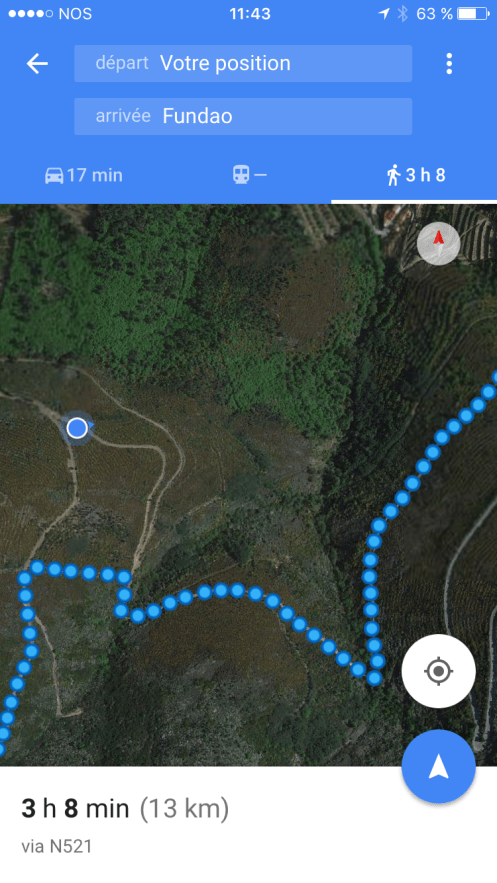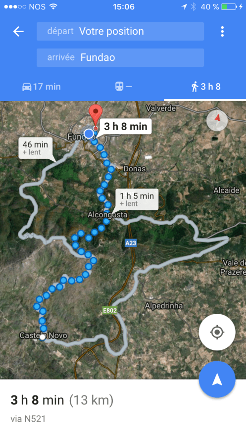Là j’ai demandé à Google Maps comment aller à pied de Castelo Novo à Fundão. Il m’a donné 3 trajets. Nous prendrons le plus court. Celui qui est en points bleu.