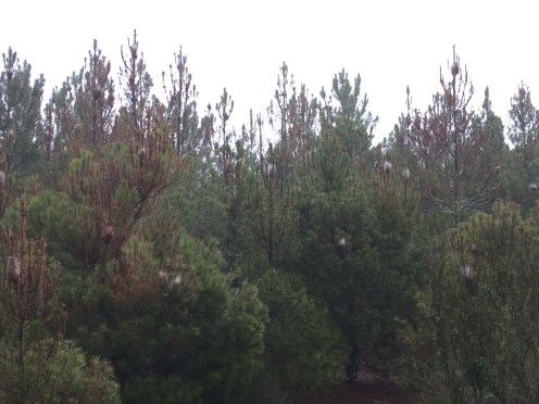 À nouveau des pins dévastés par les chenilles. C’est toujours cette variété de pins pointus qui est la plus attaquée. Ça fait mal au cœur.