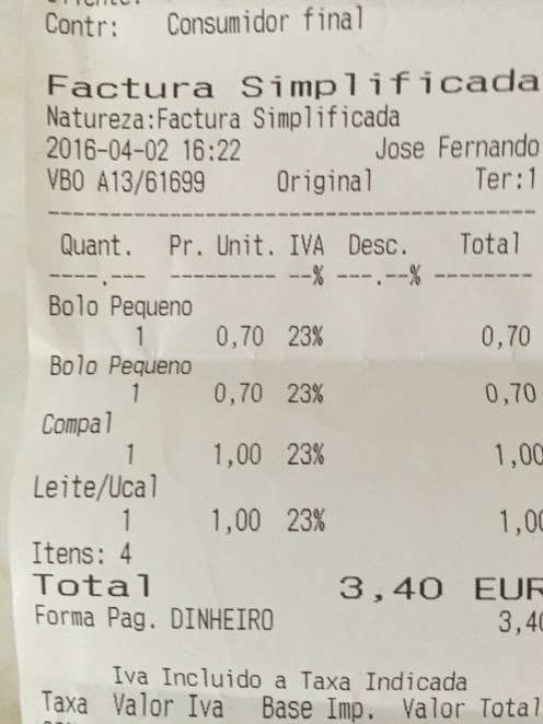 C’était mieux qu’hier à Vale Verde où nous avons trouvé un bar sinistre dans lequel il n’y avait que des filles qui fumaient dans le bar et où nous avons mangé un sachet de frites et perdu à la boule du chocolat (le distributeur où on met une pièce pour avoir le numéro du chocolat qu’on a gagné). Nous avons eu deux fois la même chose, une barre style gaufrette au chocolat. Elle est loin notre plaque de 300g de Milka !!!