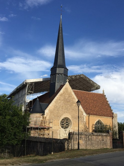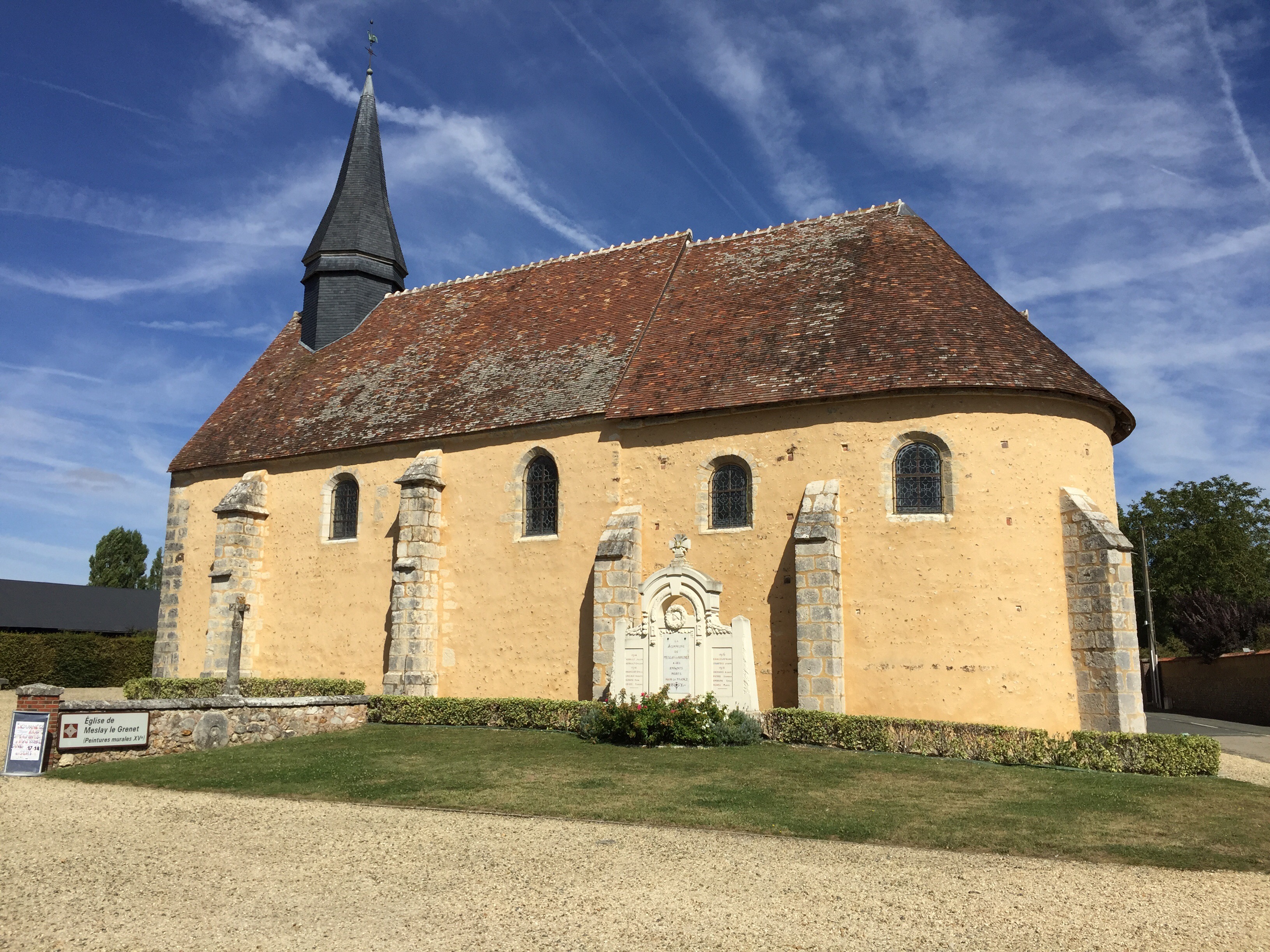 L’Eglise de Meslay-le-Grenet avec ses peintures murales du XVème siècle. Nous nous contenterons de l’extérieur, c’est fermé, pas de panneau avec des horaires.