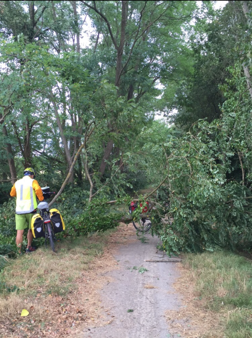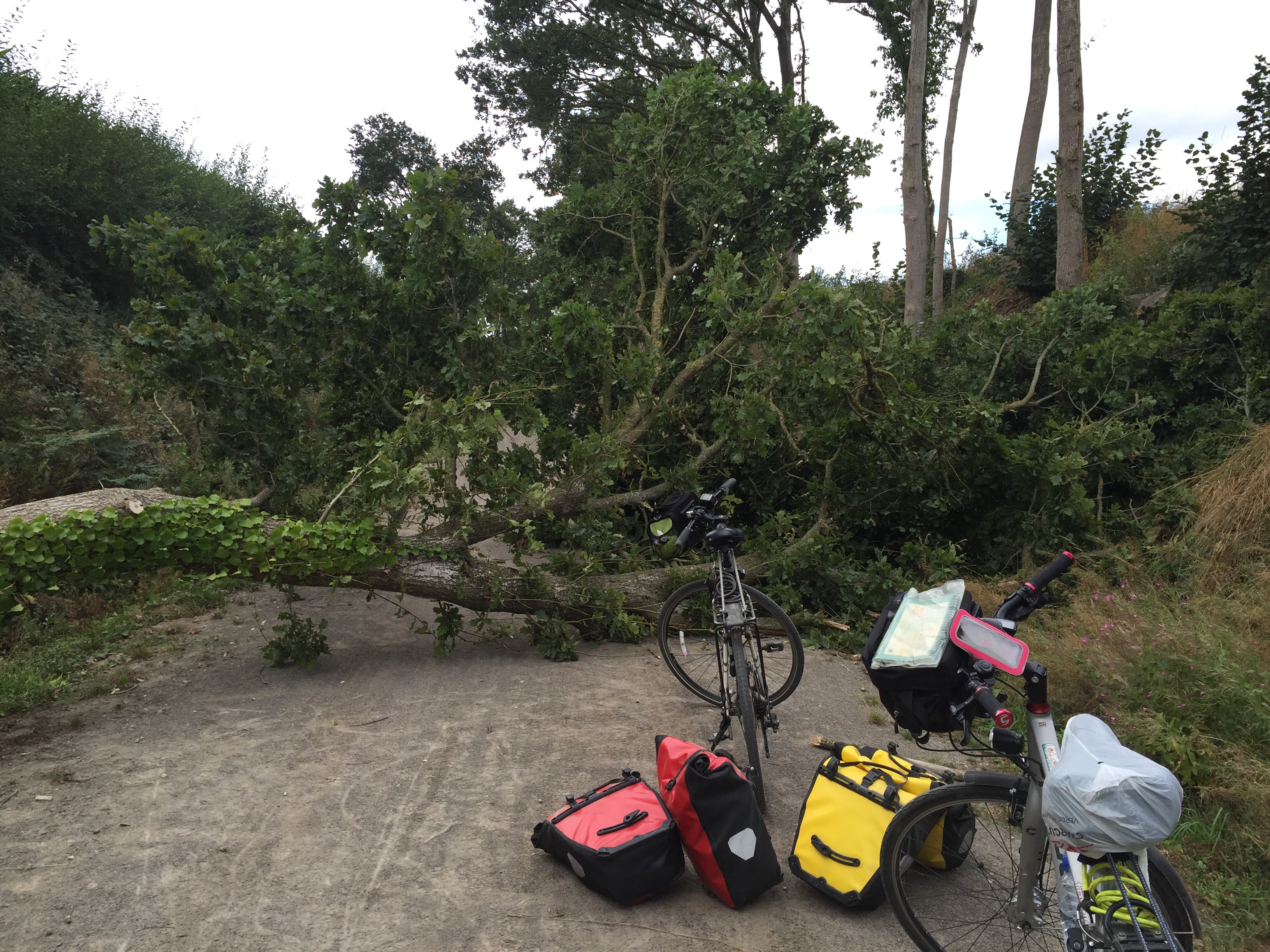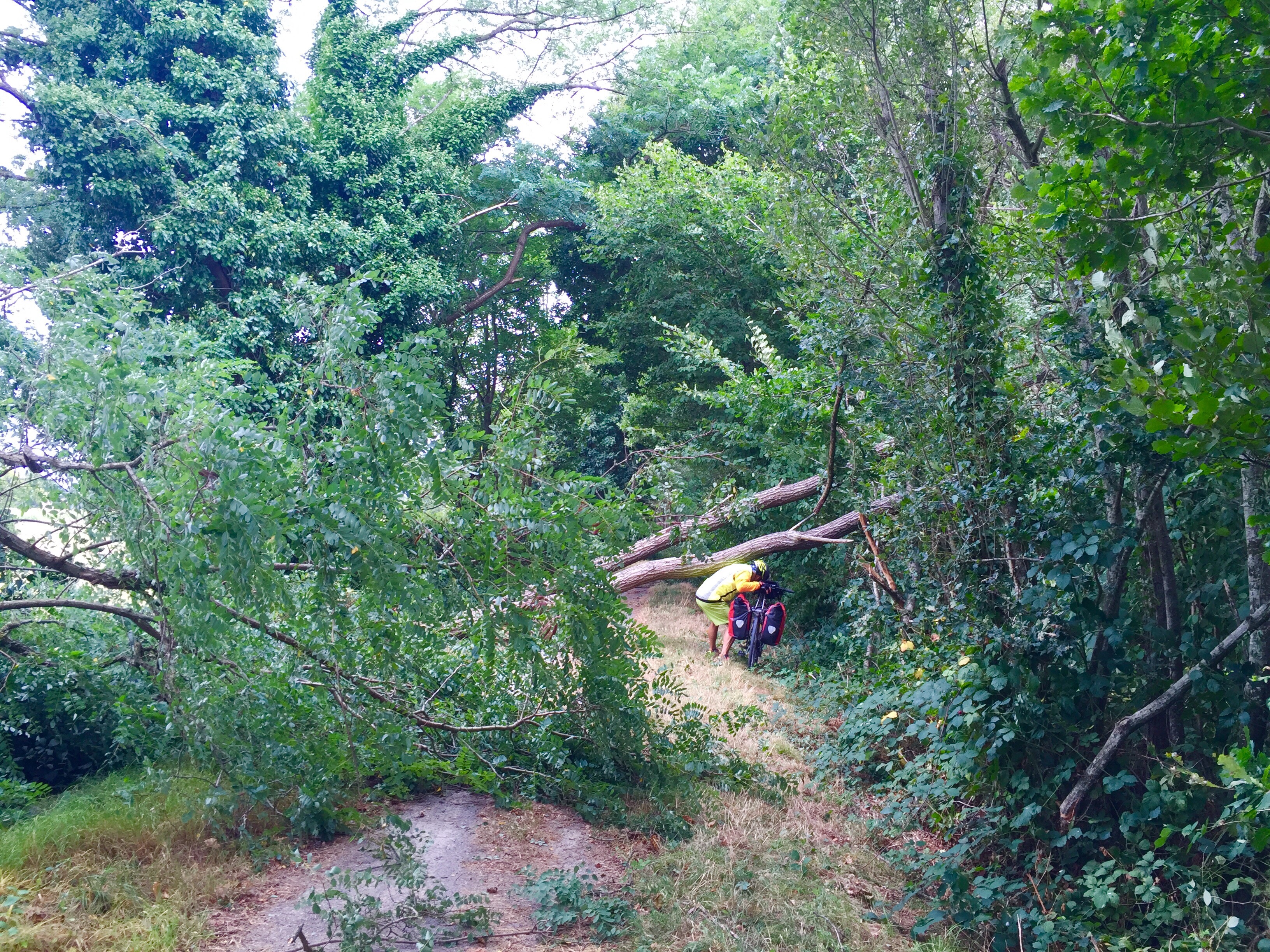 Et là, plus question de passer. Il doit y avoir au moins une dizaine d’arbres couchés. Notre parcours du combattant sur la voie verte de rêve s’arrête là !!!