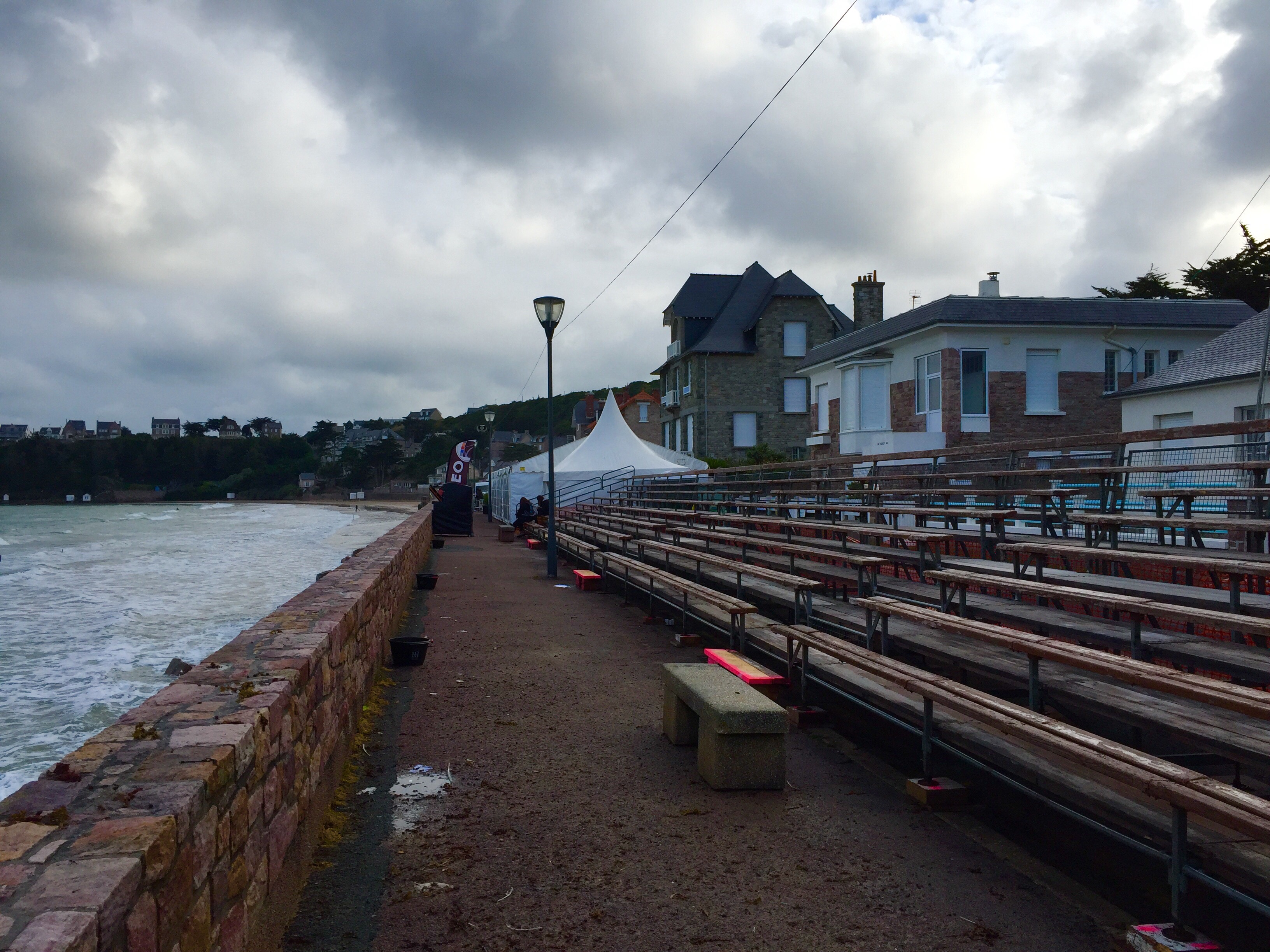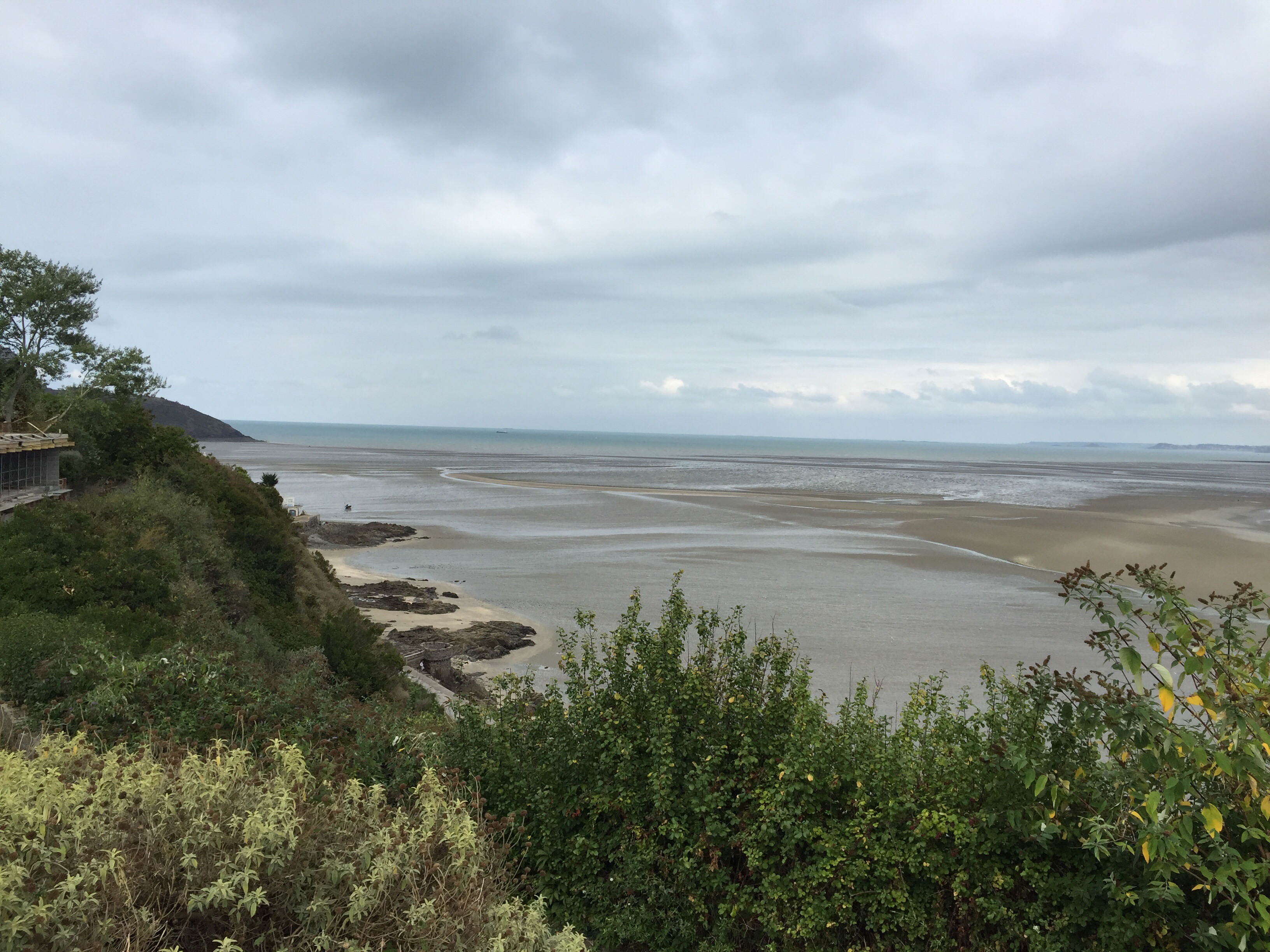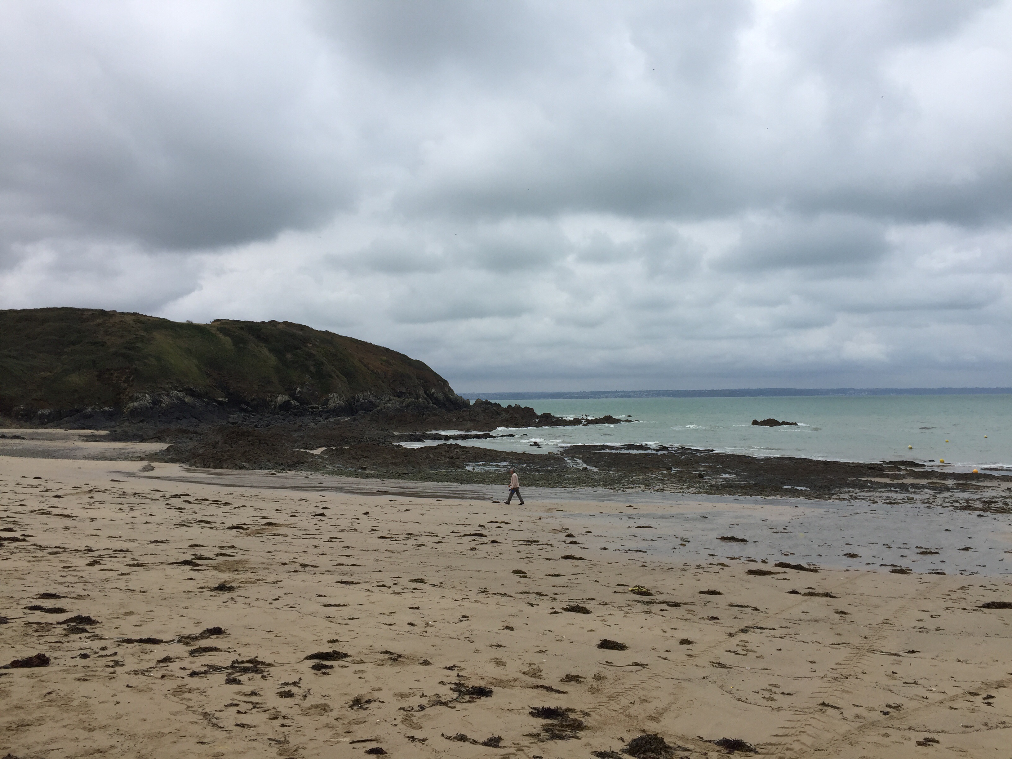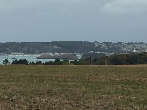 Erquy au loin, le ciel est sombre mais il fait bon et le vent dort encore, conditions idéales sauf pour les photos qui manquent de luminosité.
