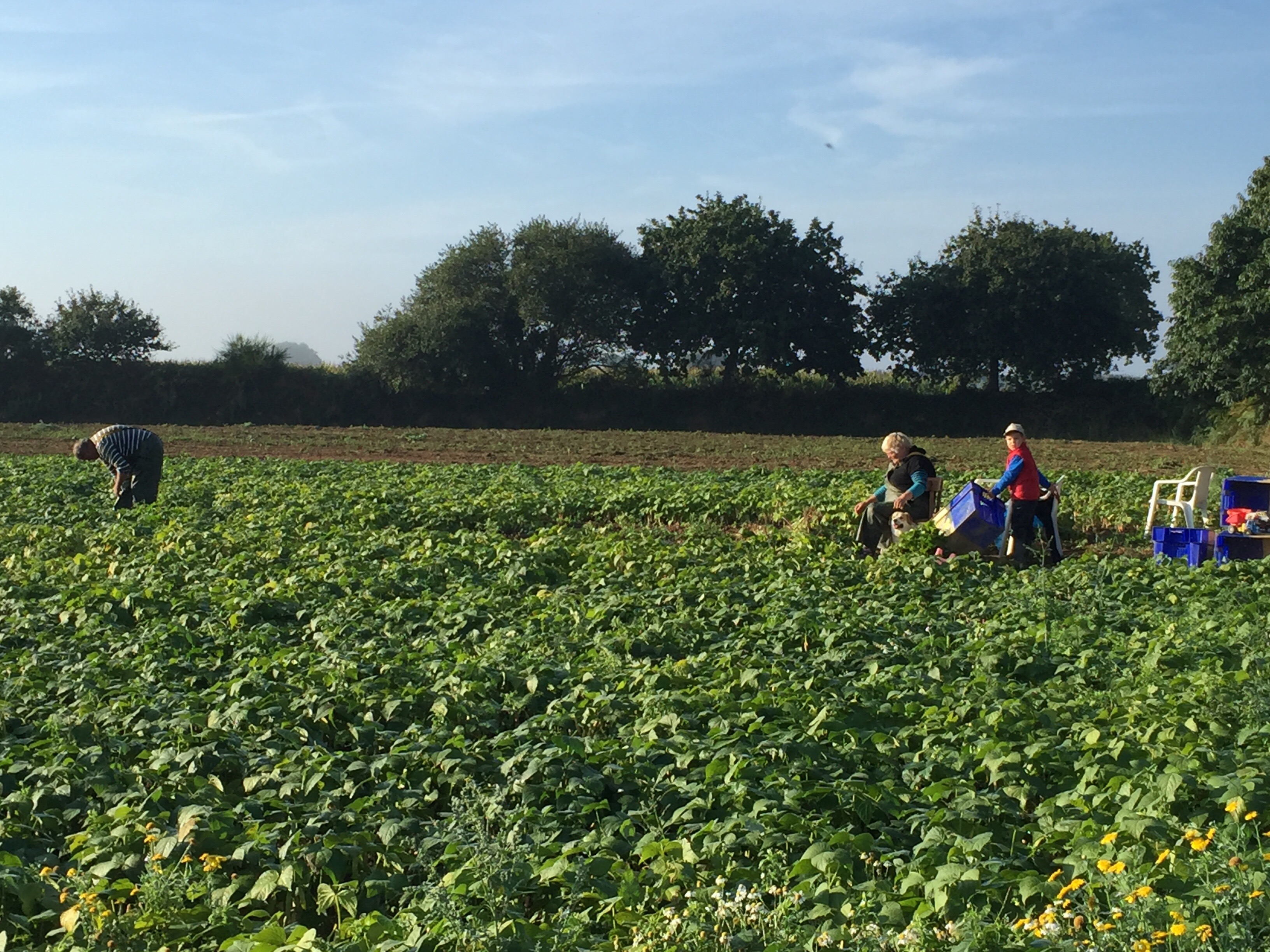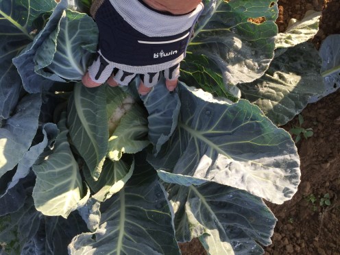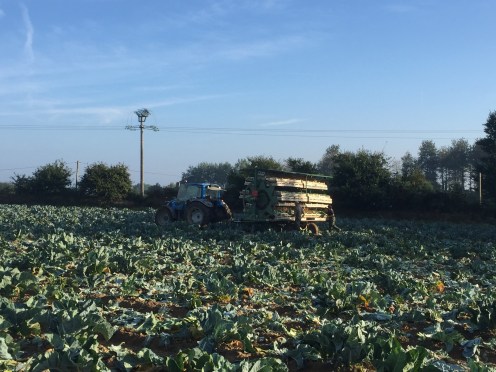 Ramassage des choux-fleurs. Le tracteur avance tout seul, les cagettes sont sur la remorque et les 2 personnes qui suivent les remplissent.