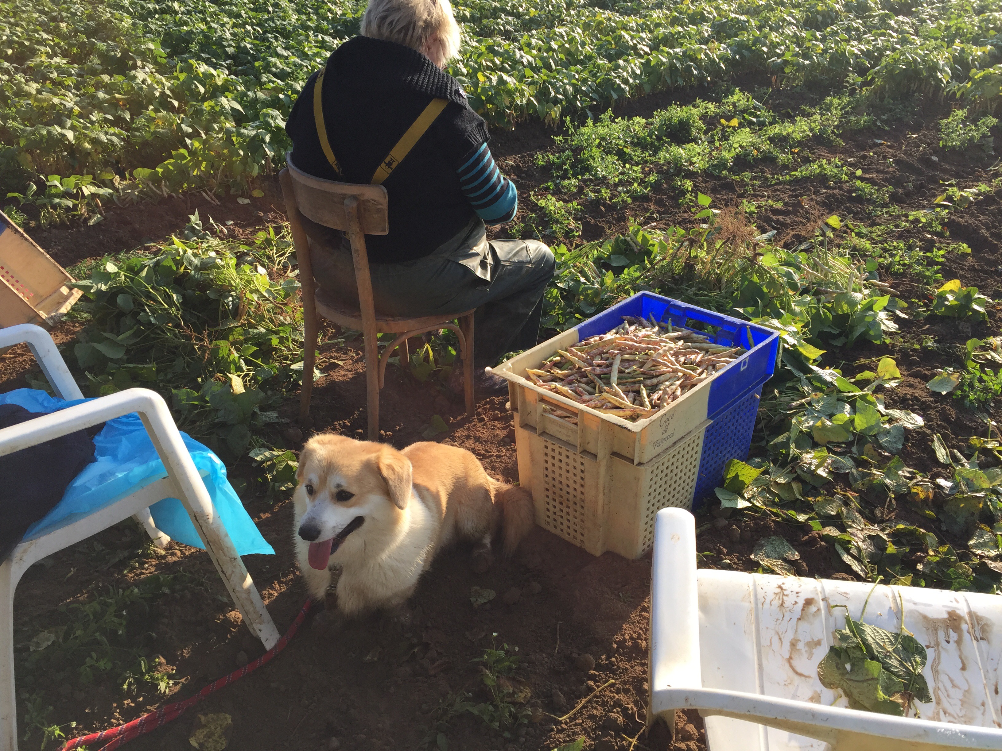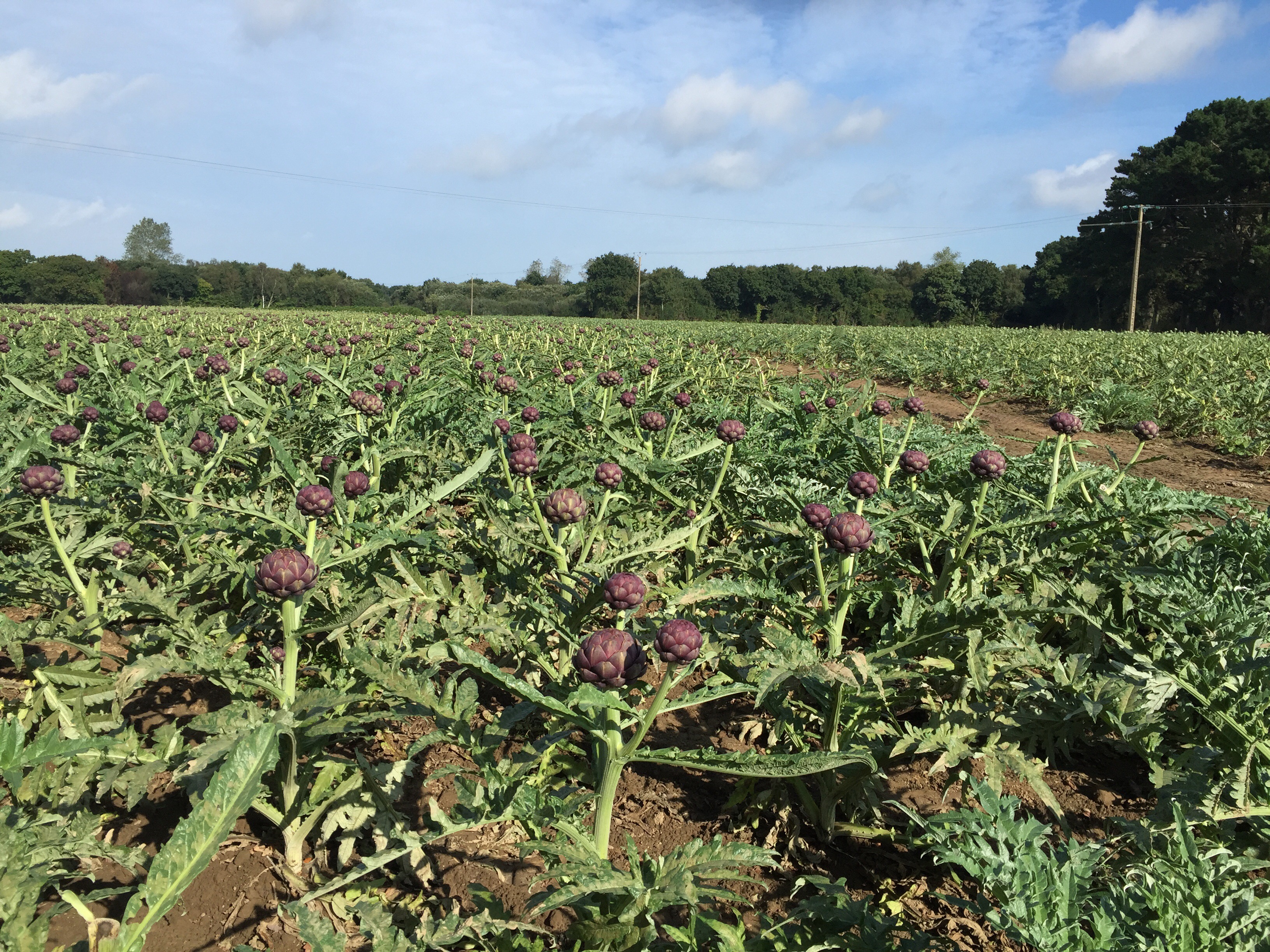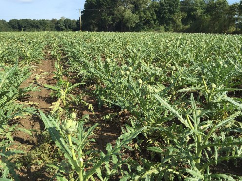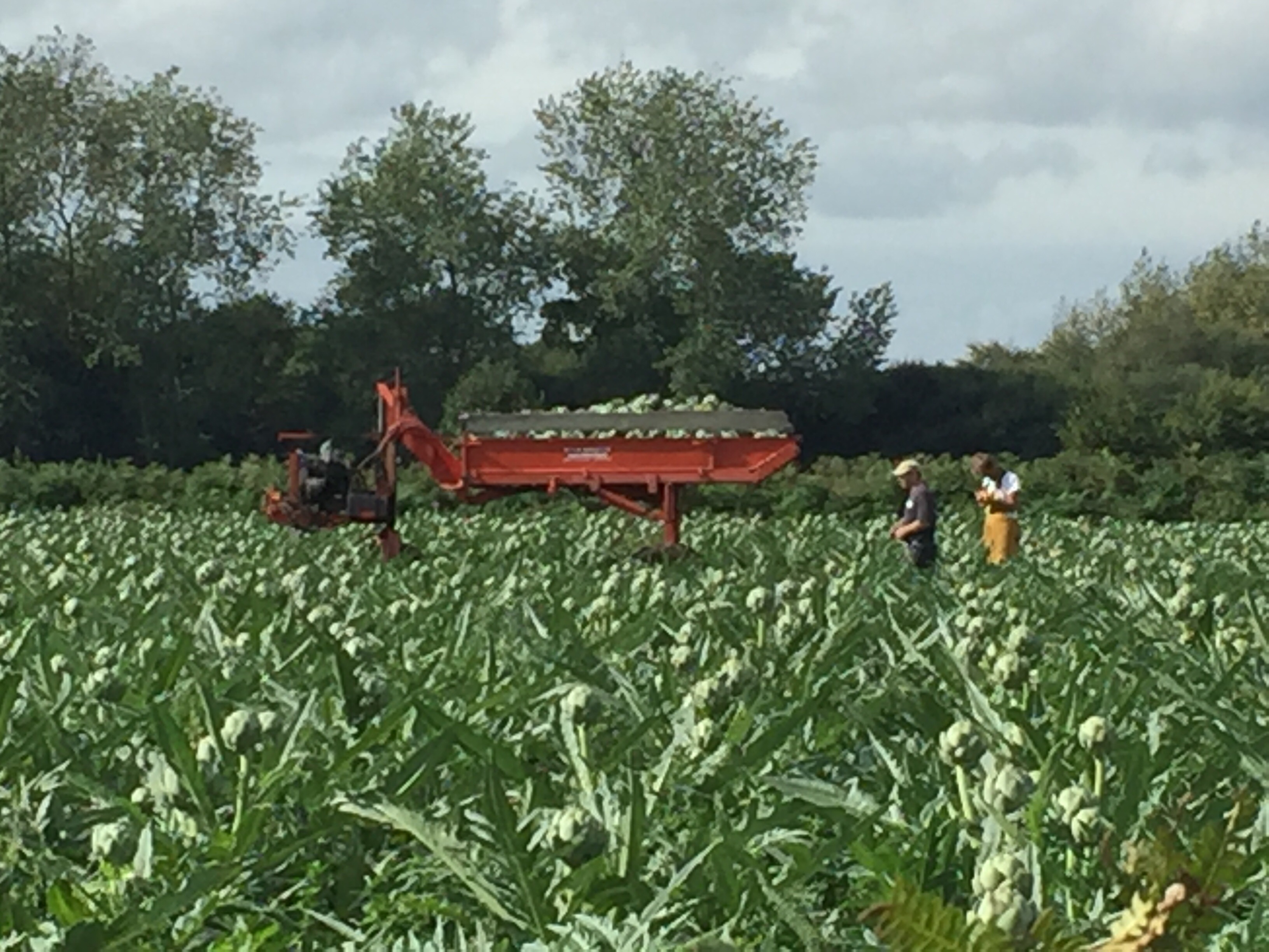 Ramassage des artichauts. La remorque avance toute seule et les deux suiveurs jettent les artichauts dessus. Nous avions vu passer un tracteur avec cette remorque très haute sans comprendre à quoi elle pouvait servir.