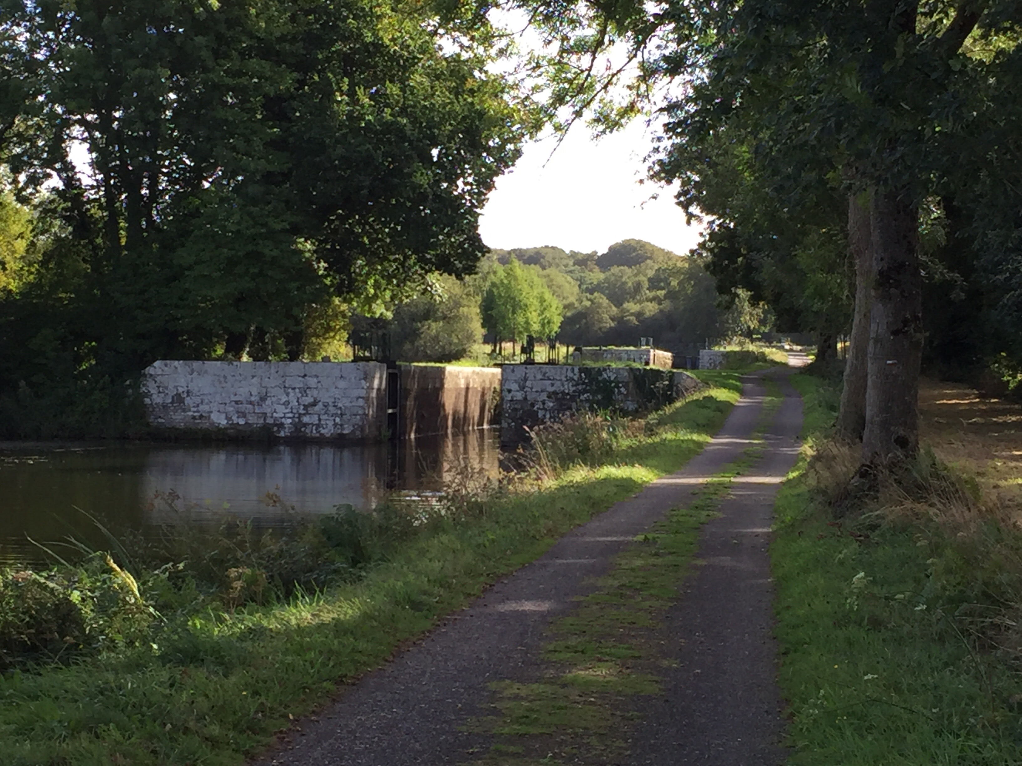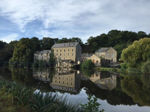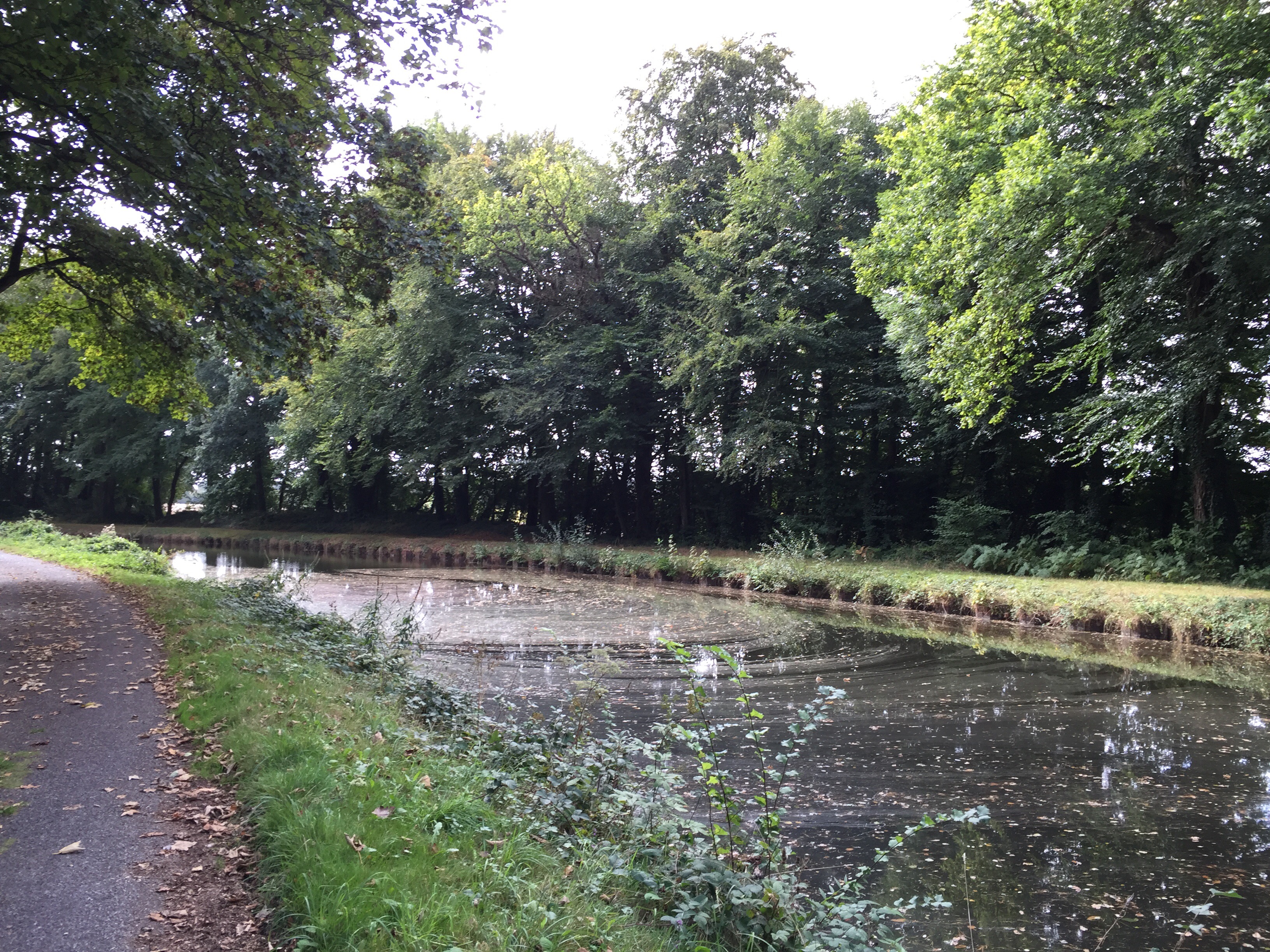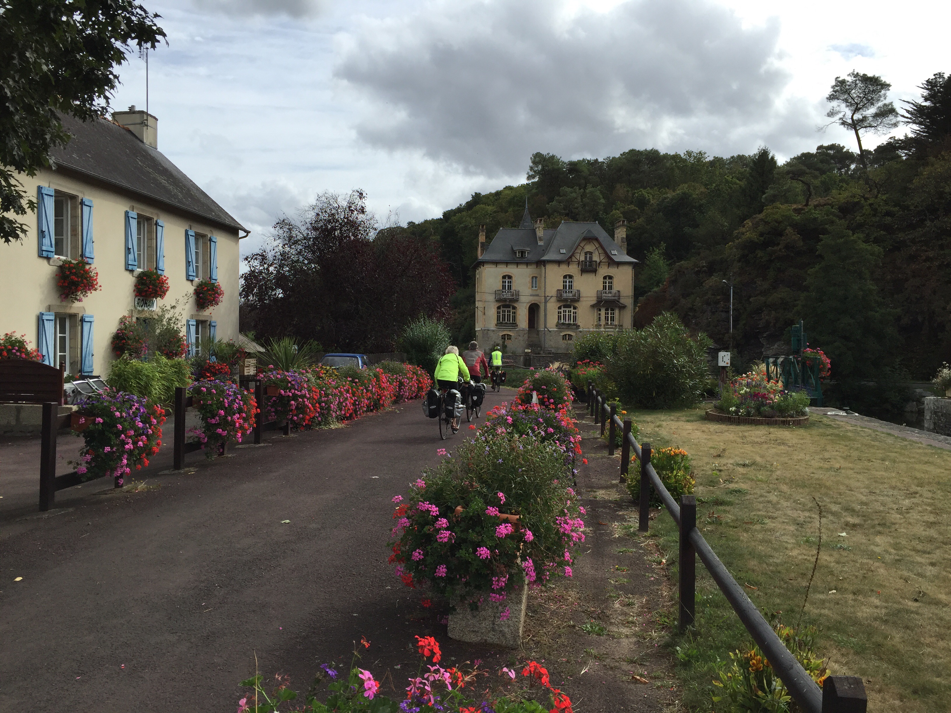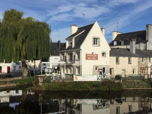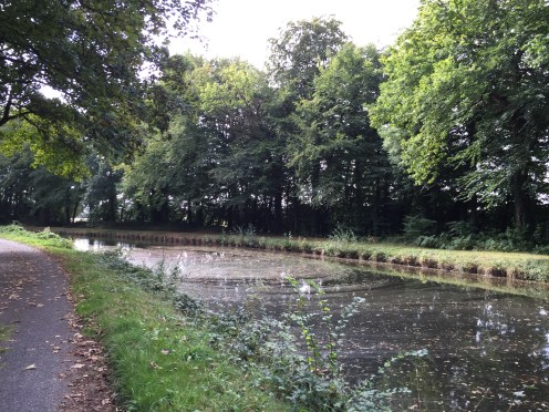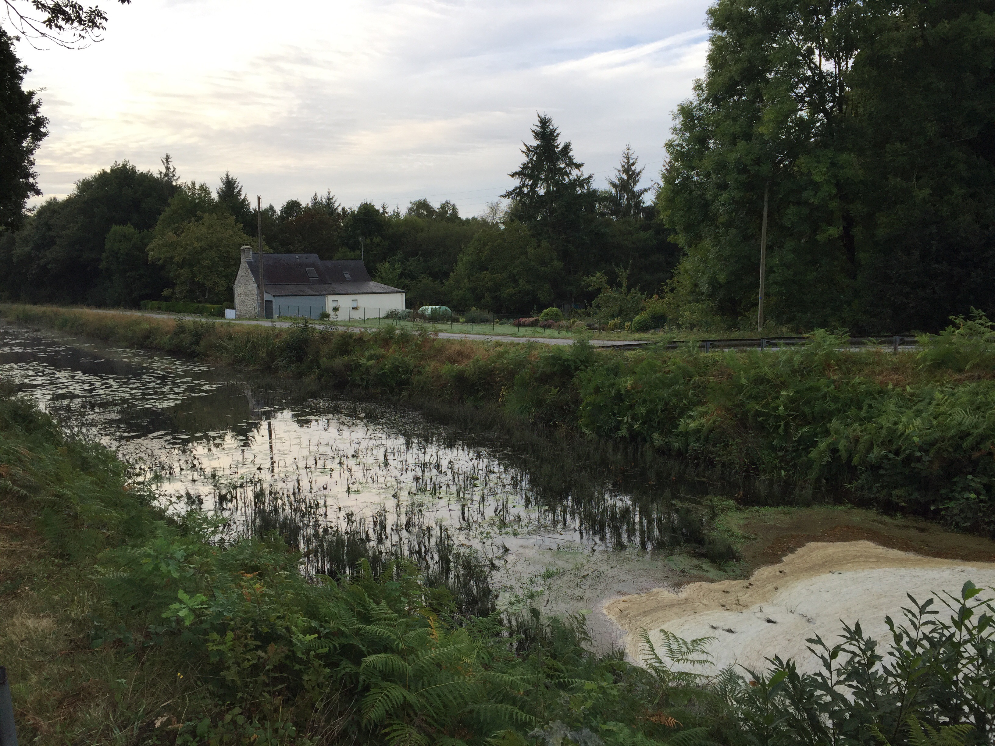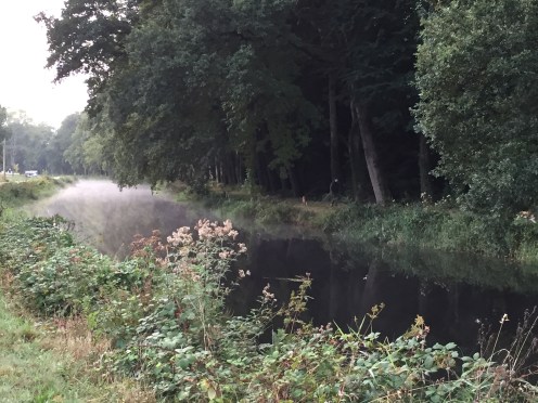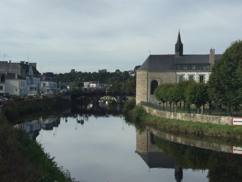 Donc, nous sommes très tôt sur le vélo et nous nous gelons !!! Il fait 12 degrés au départ, 10 lorsqu’on arrive au bord du canal et ce n’est pas la descente qui nous a réchauffés car en descendant le moteur ne chauffe pas !!!Yves a trouvé la solution pour les mains. La photo ne rend pas fidèlement la vapeur qui sort de l’eau. Là non plus cela ne doit pas être navigable. Sur le papier qui pend, il y a écrit : « vous pouvez vous asseoir ». Sympa !!!Une belle rencontre. Un Papé qui farfouille avec un bâton dans les herbes au bord du chemin. Il me montre son trésor. Hier il en a trouvé 3 kg !!! Une année exceptionnelle, c’est la première fois qu’il en trouve autant. La campagne environnante. Je ne pense pas à photographier autre chose que le canal. Pontivy. Certains vont reconnaître ce lieu. Nous y avons mangé un 15 août après avoir fait ?? km. Il n’y a que Danielle qui peut savoir le kilométrage si elle a gardé son compte-rendu de voyage avec l’année. L’hôtel de Roscoët. Dur, dur de faire une photo du château médiéval des Rohan, à Pontivy, à cause du soleil qui était en face. Et nous voilà repartis dans les côtes !!! Les écluses se succèdent à un rythme effréné !!! 54 écluses sur 20 km entre Pontivy et Rohan. Par chance, elles continuent à se succéder mais ça descend. Rohan, des bateaux !!! Les premiers que nous voyons. La halle aux grains en bois. Il en reste seulement 5 en Bretagne. La Chapelle Notre Dame de Bonne Encontre. L’écluse de Rohan.
