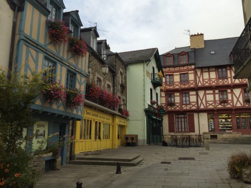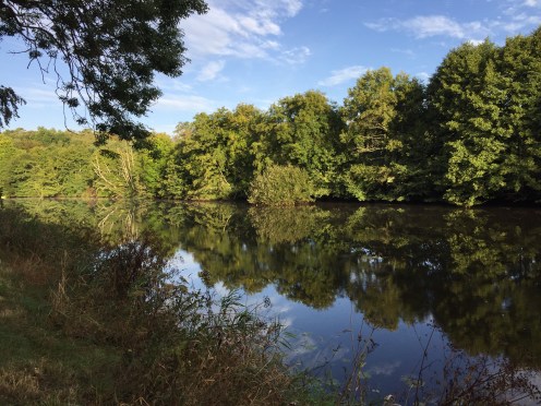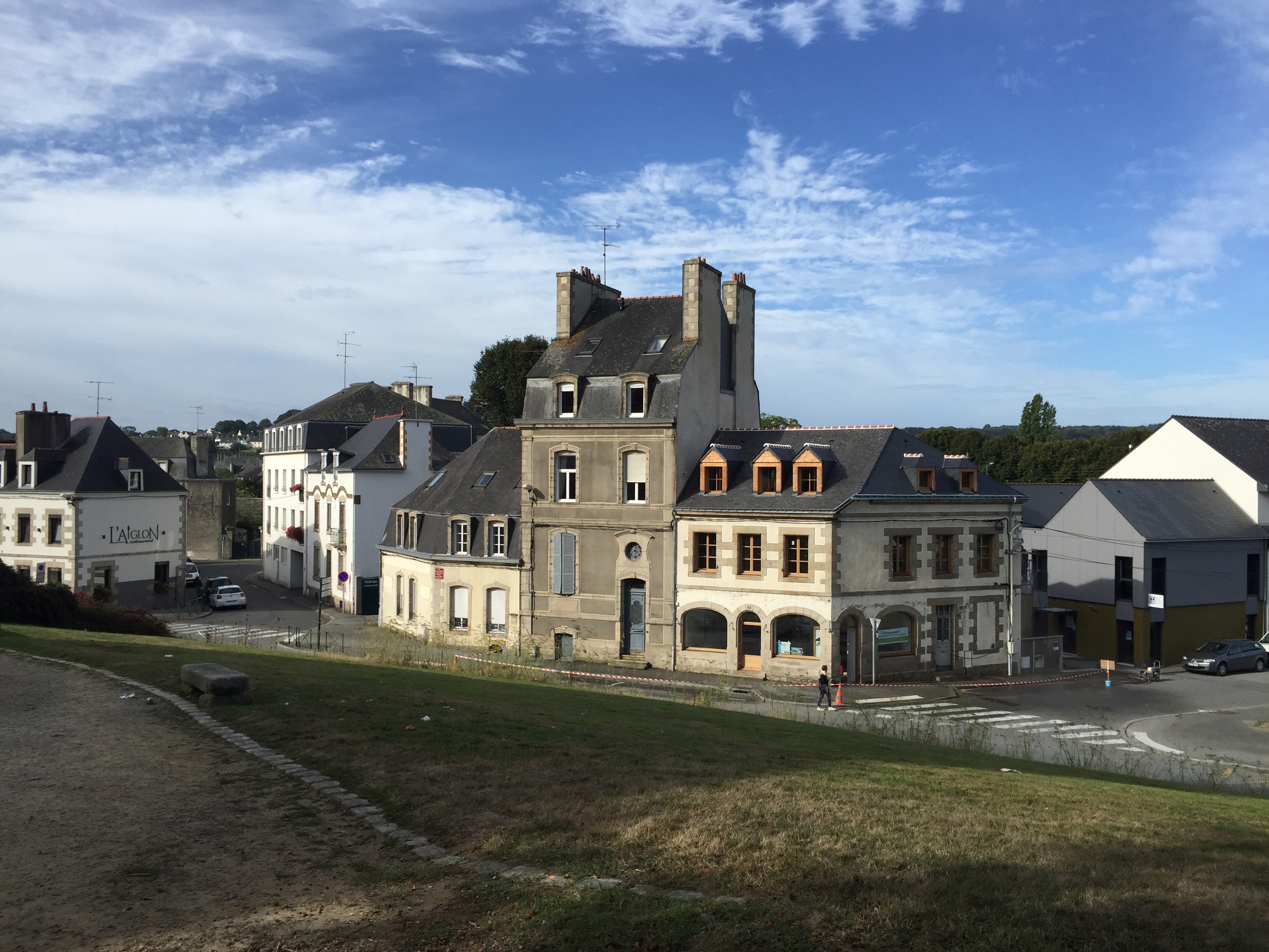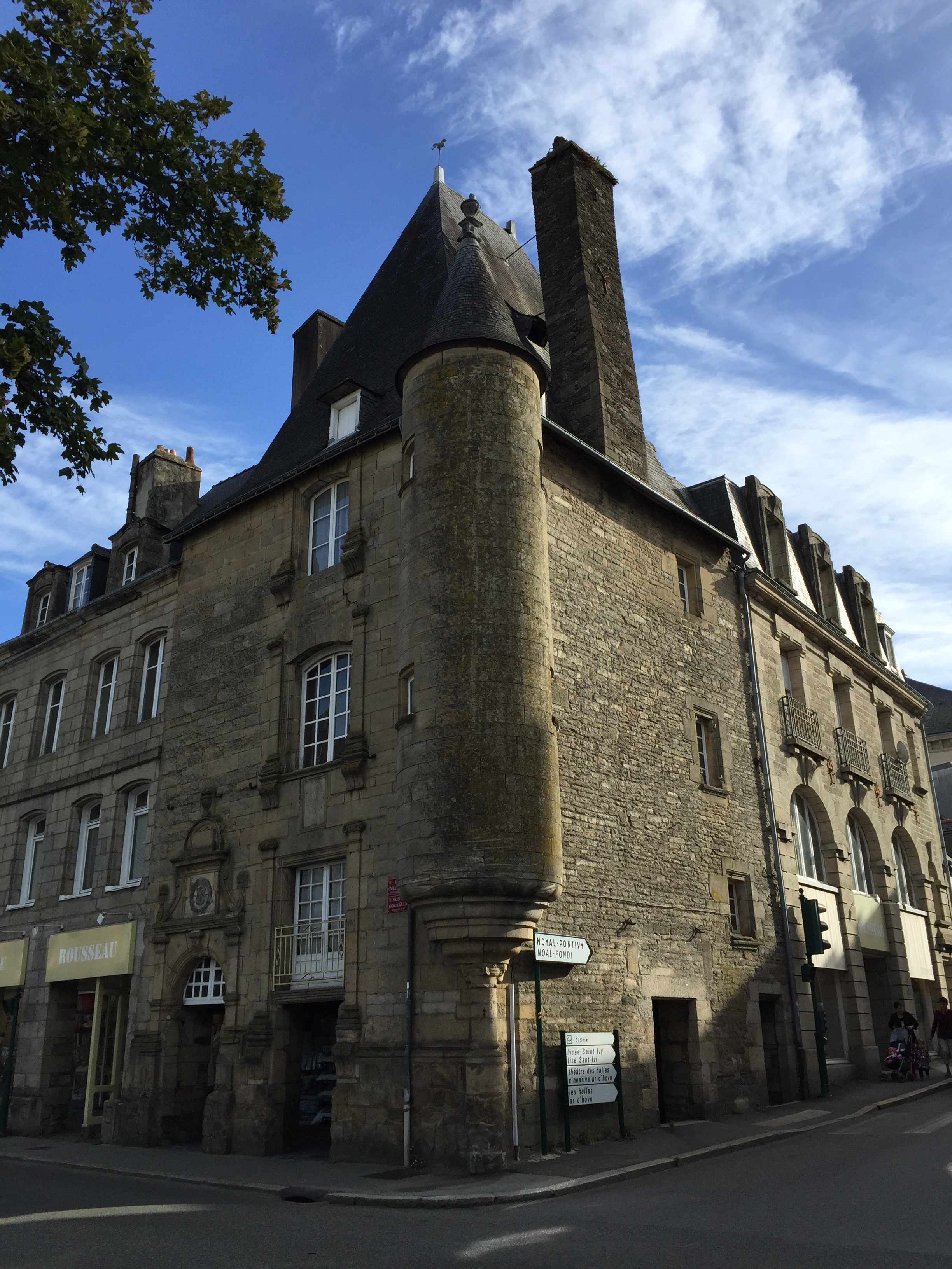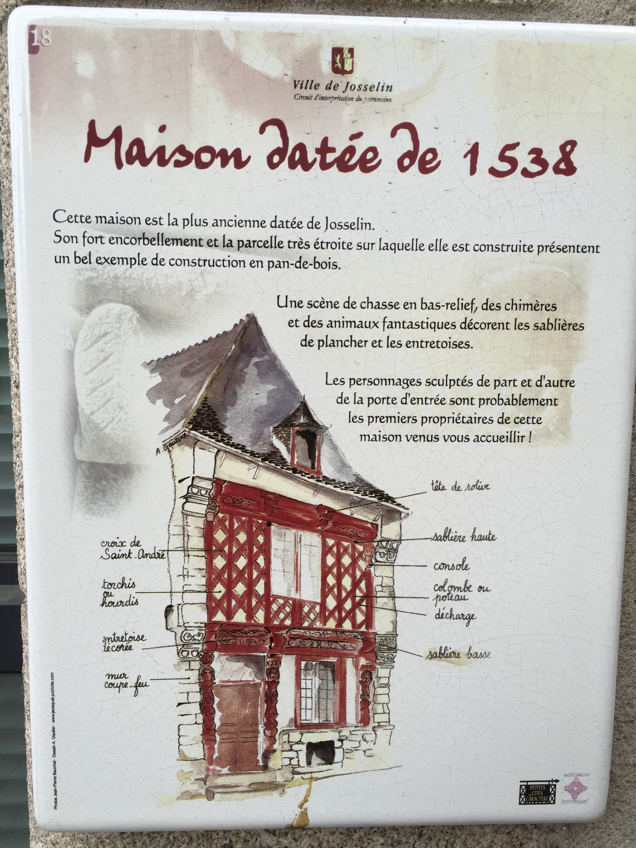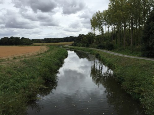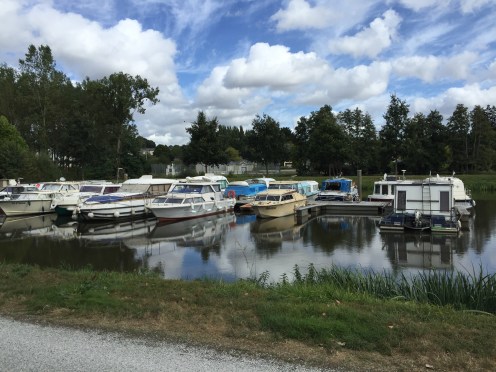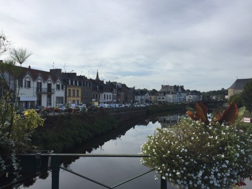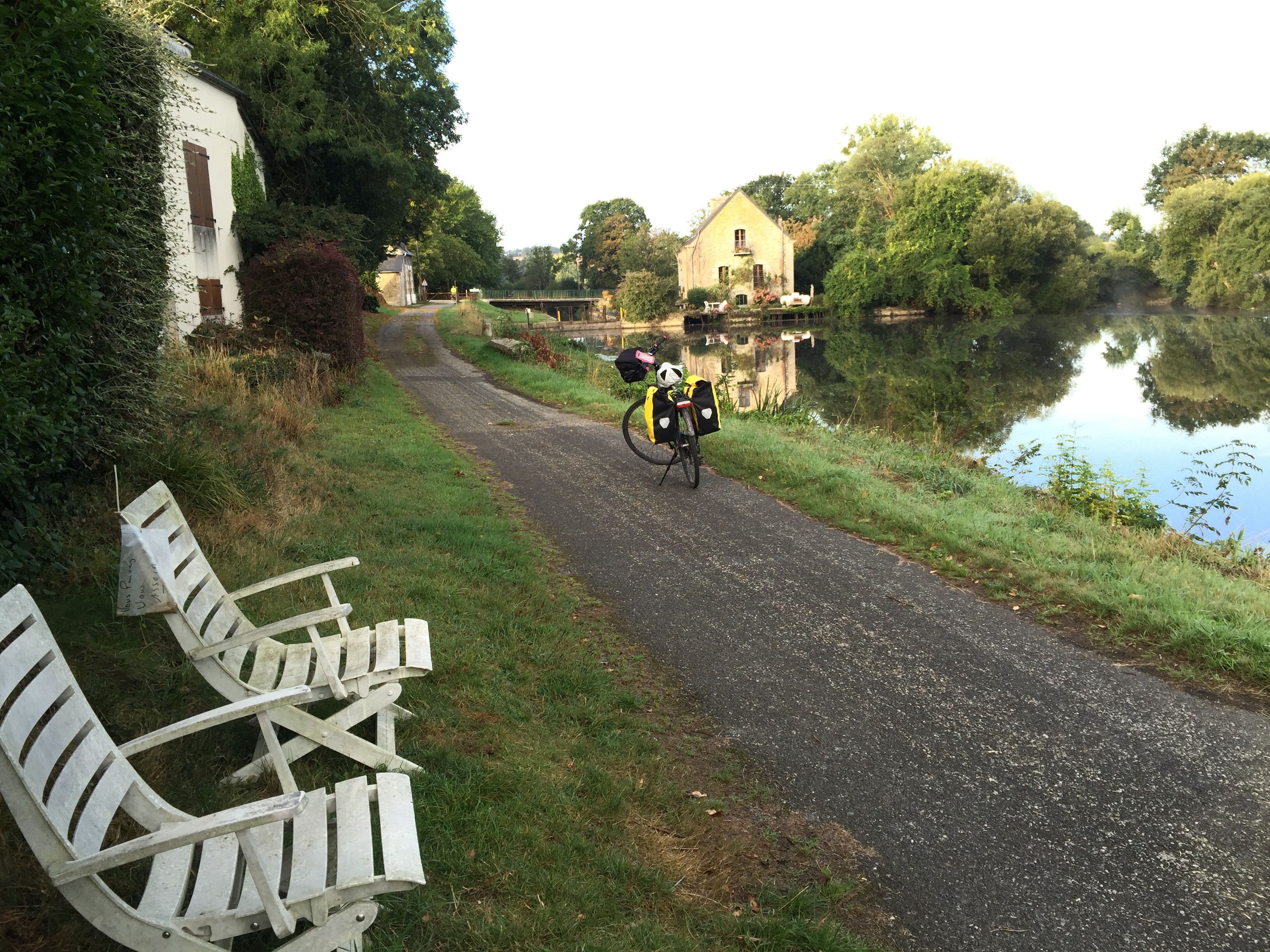 Donc, nous sommes très tôt sur le vélo et nous nous gelons !!! Il fait 12 degrés au départ, 10 lorsqu’on arrive au bord du canal et ce n’est pas la descente qui nous a réchauffés car en descendant le moteur ne chauffe pas !!!Yves a trouvé la solution pour les mains. La photo ne rend pas fidèlement la vapeur qui sort de l’eau. Là non plus cela ne doit pas être navigable. Sur le papier qui pend, il y a écrit : « vous pouvez vous asseoir ». Sympa !!!Une belle rencontre. Un Papé qui farfouille avec un bâton dans les herbes au bord du chemin. Il me montre son trésor. Hier il en a trouvé 3 kg !!! Une année exceptionnelle, c’est la première fois qu’il en trouve autant. La campagne environnante. Je ne pense pas à photographier autre chose que le canal. Pontivy. Certains vont reconnaître ce lieu. Nous y avons mangé un 15 août après avoir fait ?? km. Il n’y a que Danielle qui peut savoir le kilométrage si elle a gardé son compte-rendu de voyage avec l’année. L’hôtel de Roscoët. Dur, dur de faire une photo du château médiéval des Rohan, à Pontivy, à cause du soleil qui était en face. Et nous voilà repartis dans les côtes !!! Les écluses se succèdent à un rythme effréné !!! 54 écluses sur 20 km entre Pontivy et Rohan. Par chance, elles continuent à se succéder mais ça descend. Rohan, des bateaux !!! Les premiers que nous voyons. La halle aux grains en bois. Il en reste seulement 5 en Bretagne. La Chapelle Notre Dame de Bonne Encontre. L’écluse de Rohan.