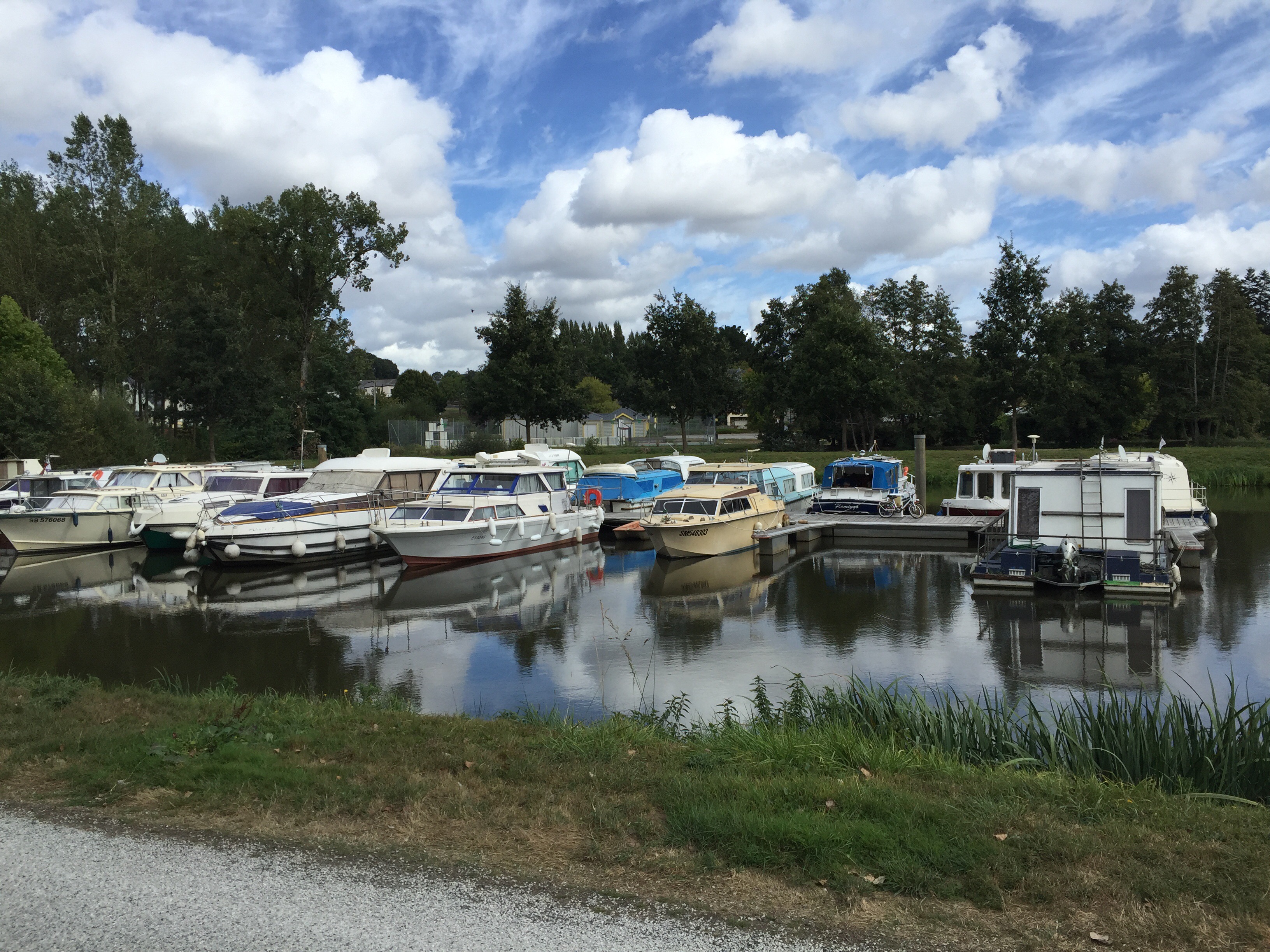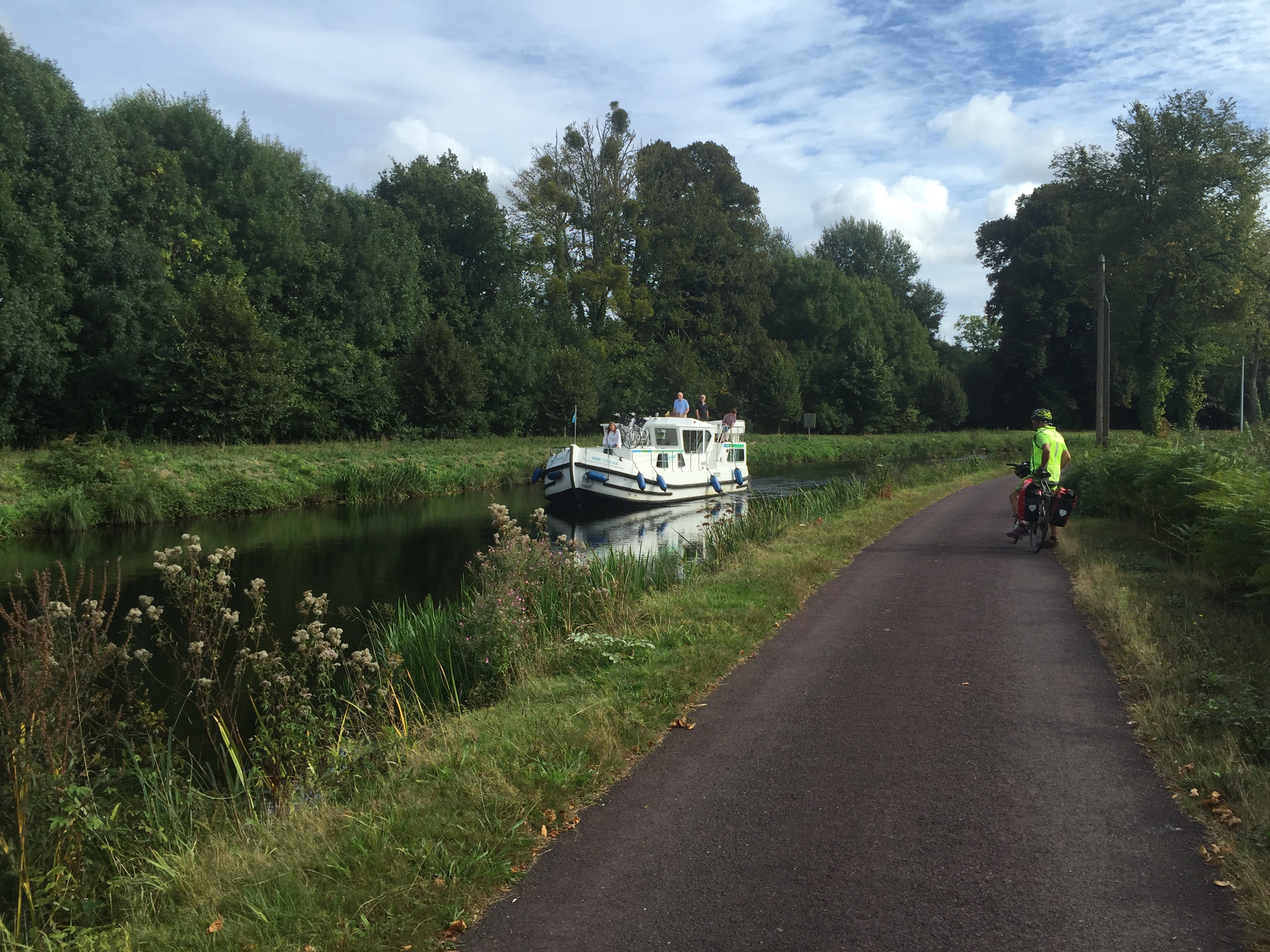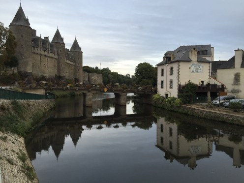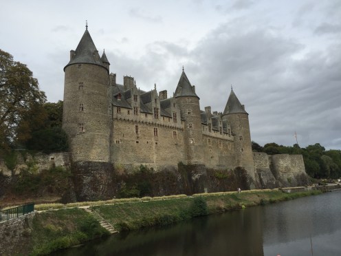 Sur la photo on aperçoit 2 cyclistes. Ils ont mangé à midi dans la même crêperie que nous. Nous les avons retrouvés ce soir à l’hôtel. Demain à Redon ils dorment aussi dans le même que nous. Coïncidence ou alors il n’y a peut-être pas beaucoup de choix !!! Hé oui ma Sophie, j’ai déjà réservé pour demain !!!Le trait clair sur la route correspond à un passage d’animaux. Il y en a énormément. L’aspect du canal change très souvent. Par moments il est large, étroit, sinueux, rectiligne …La première péniche que nous voyons circuler sur le canal. Le château de Josselin. Je crois que j’ai mis un peu, beaucoup de photos aujourd’hui. Internet est si rapide que c’est un régal de les importer.