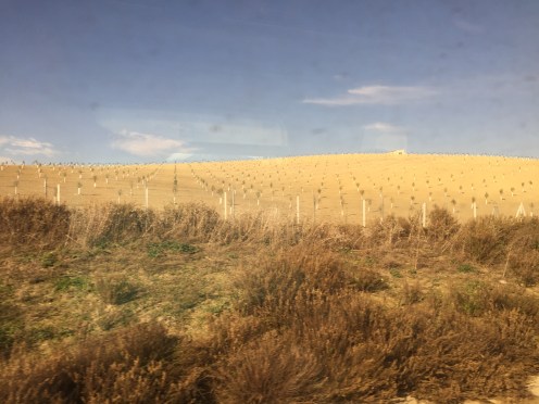 Photo du paysage que nous traversons. Là une plantation d’arbres. Beaucoup de champs ont été labourés, ça manque de verdure. Nous avons vu aussi beaucoup d’oliviers. Je n’ai pas fait de photo, ce n’est pas très facile d’en faire derrière les vitres du train !!!
