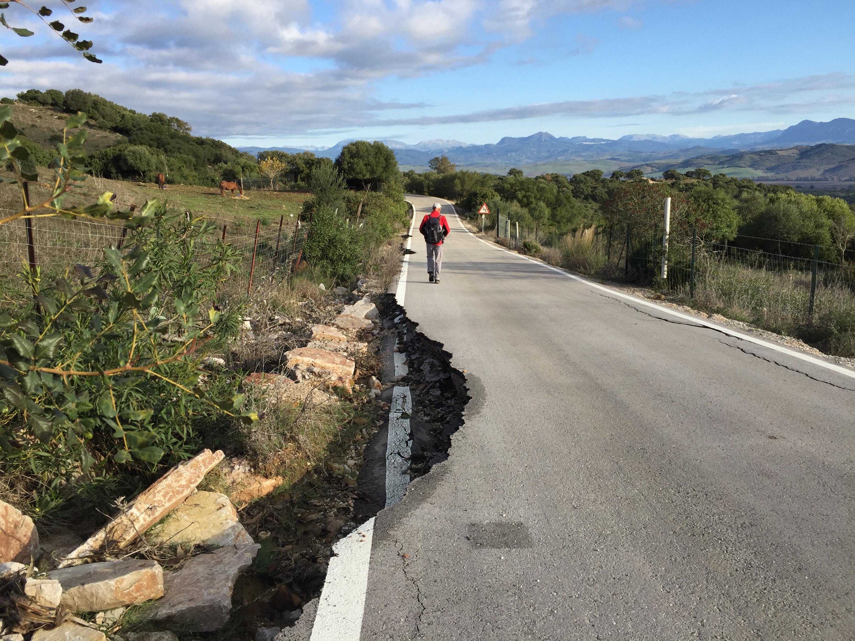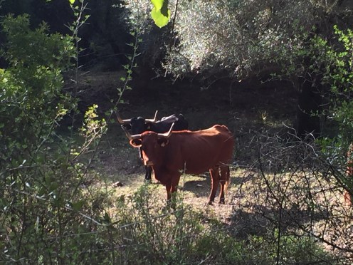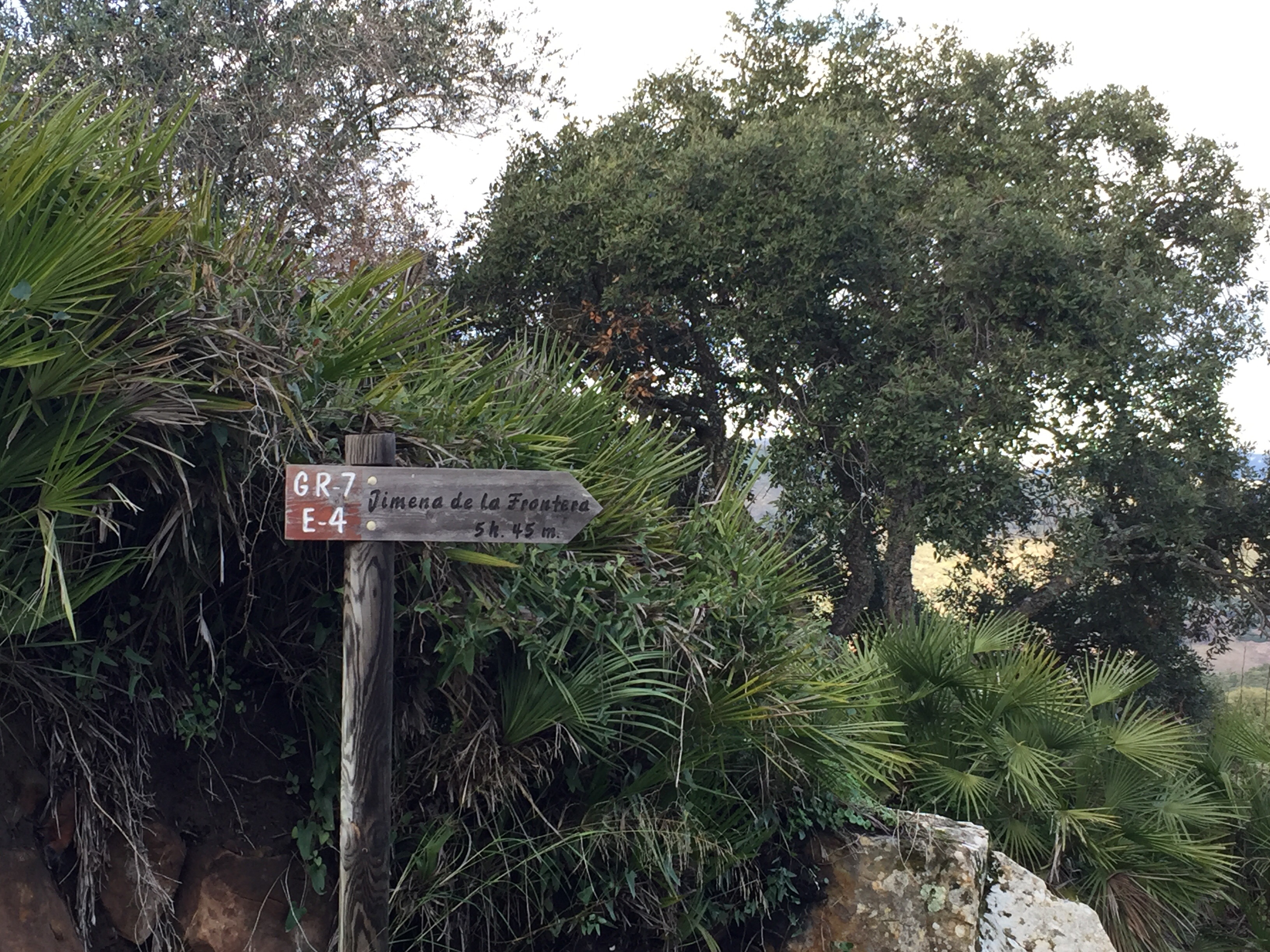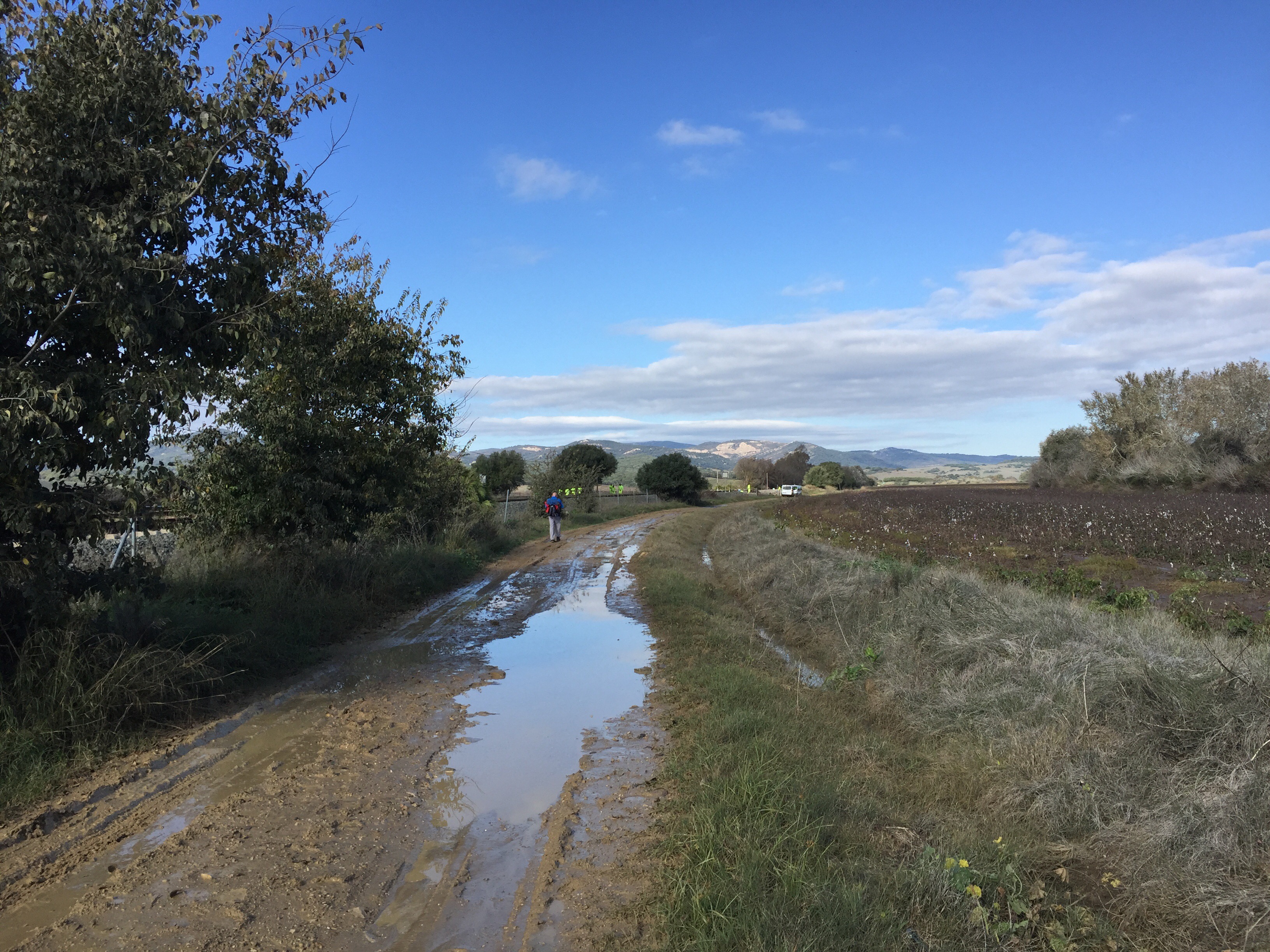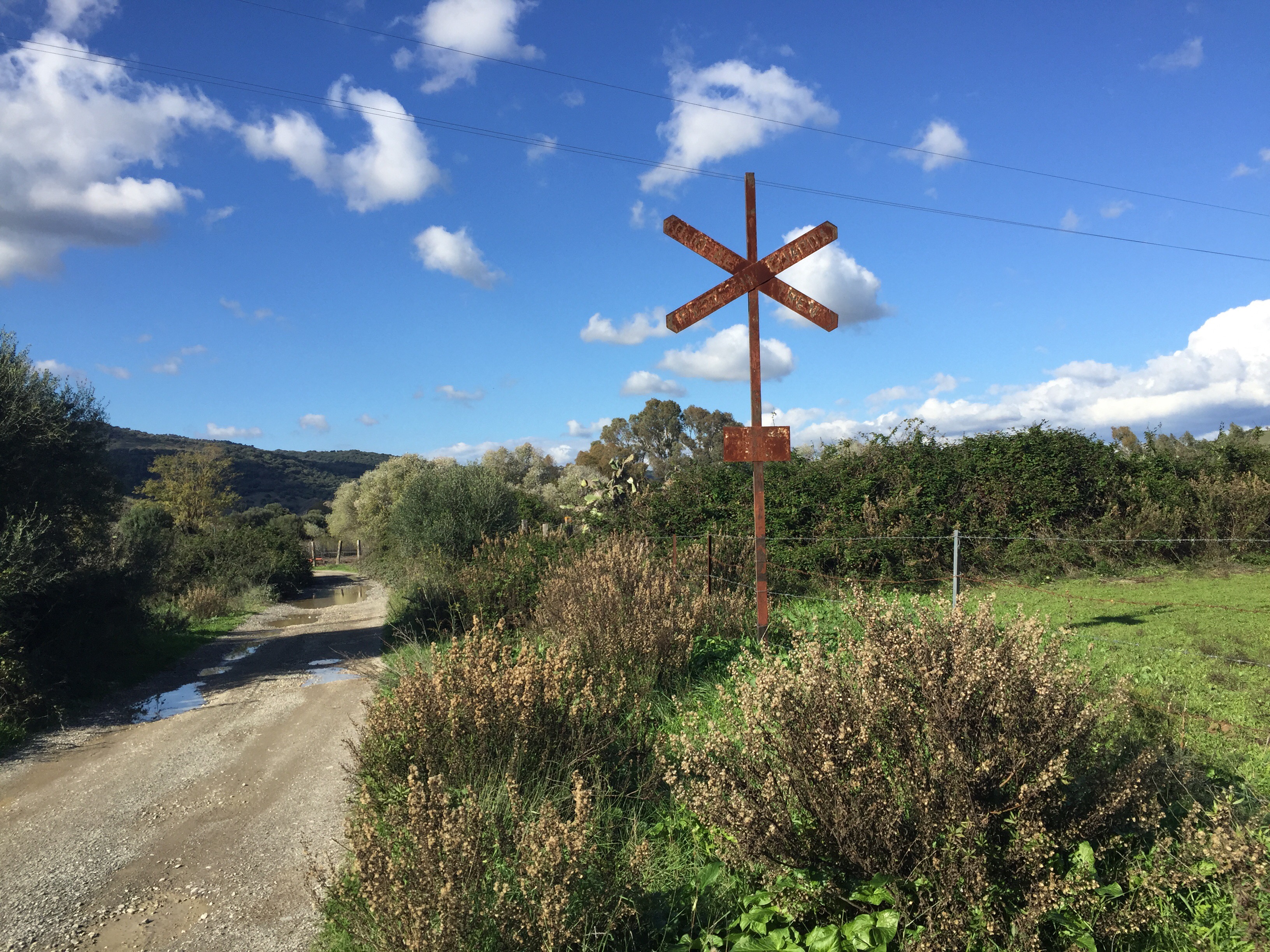 Castillo de Castellar – Jimena de la Frontera 22,7 kmLever du soleil depuis notre chambre. Je ne me lasse pas de photographier Gibraltar. Et c’est parti pour 5 h45 de marche. Départ sur une belle route avec un panneau cul-de-sac. Ça commence à se gâter !!!La route asphaltée s’arrête là, d’où le panneau cul-de-sac !!!Dimanche pendant l’orage ça devait être impraticable. Les cornes sont impressionnantes, heureusement qu’il y a un grillage !!!J’avance difficilement à cause des cailloux. À partir de là ça va être de plus en plus difficile d’avancer. On patauge dans la boue d’une semaine de pluie !!!Mais que se passe-t-il ??? Un agriculteur a labouré le GR !!!Par moments on s’enfonce jusqu’à la cheville. On dirait qu’il a semé des fèves. Où alors ce sont les restes de l’année précédente qui ont germé. A la sortie du champ mes chaussures pèsent une tonne. Changement de chemin, c’est pas mieux. Il est inondé par endroits et bordé de ronces. Par moments on est obligé de marcher sur les bords pour ne pas se mouiller, alors on s’égratigne. Il y a tout de même de très beaux passages. On dirait des panneaux d’un jeu de Lego !!! Ils sont vrais, on va traverser la voie ferrée qu’on a longé pendant plus de 10 km. Et enfin apercevoir Jimena à flanc de colline. Et c’est fini pour aujourd’hui !!!