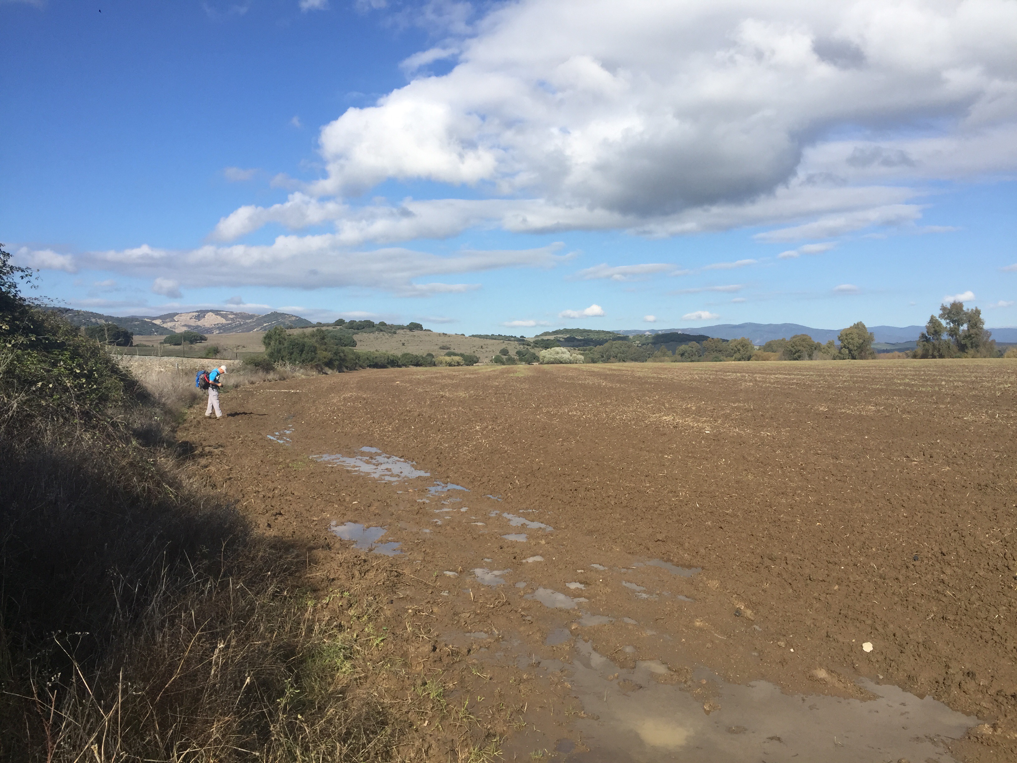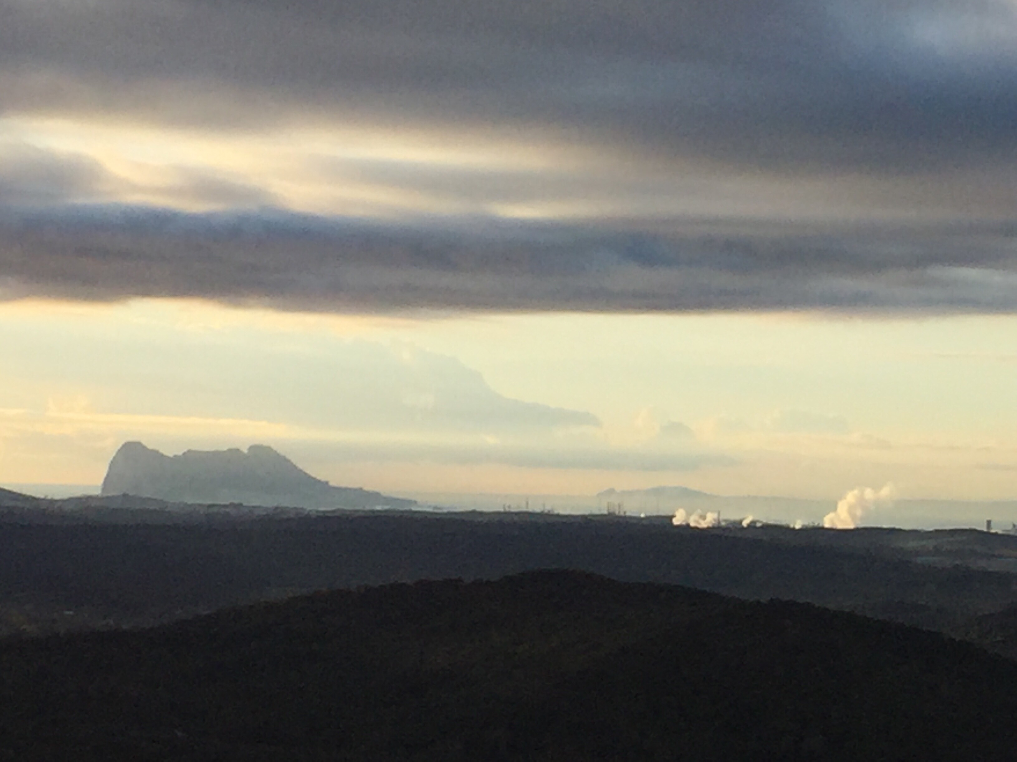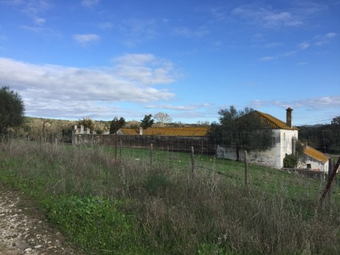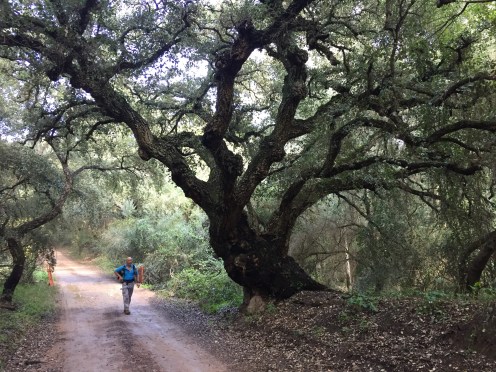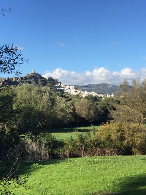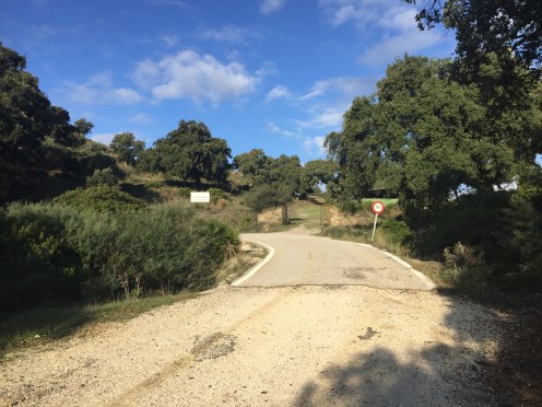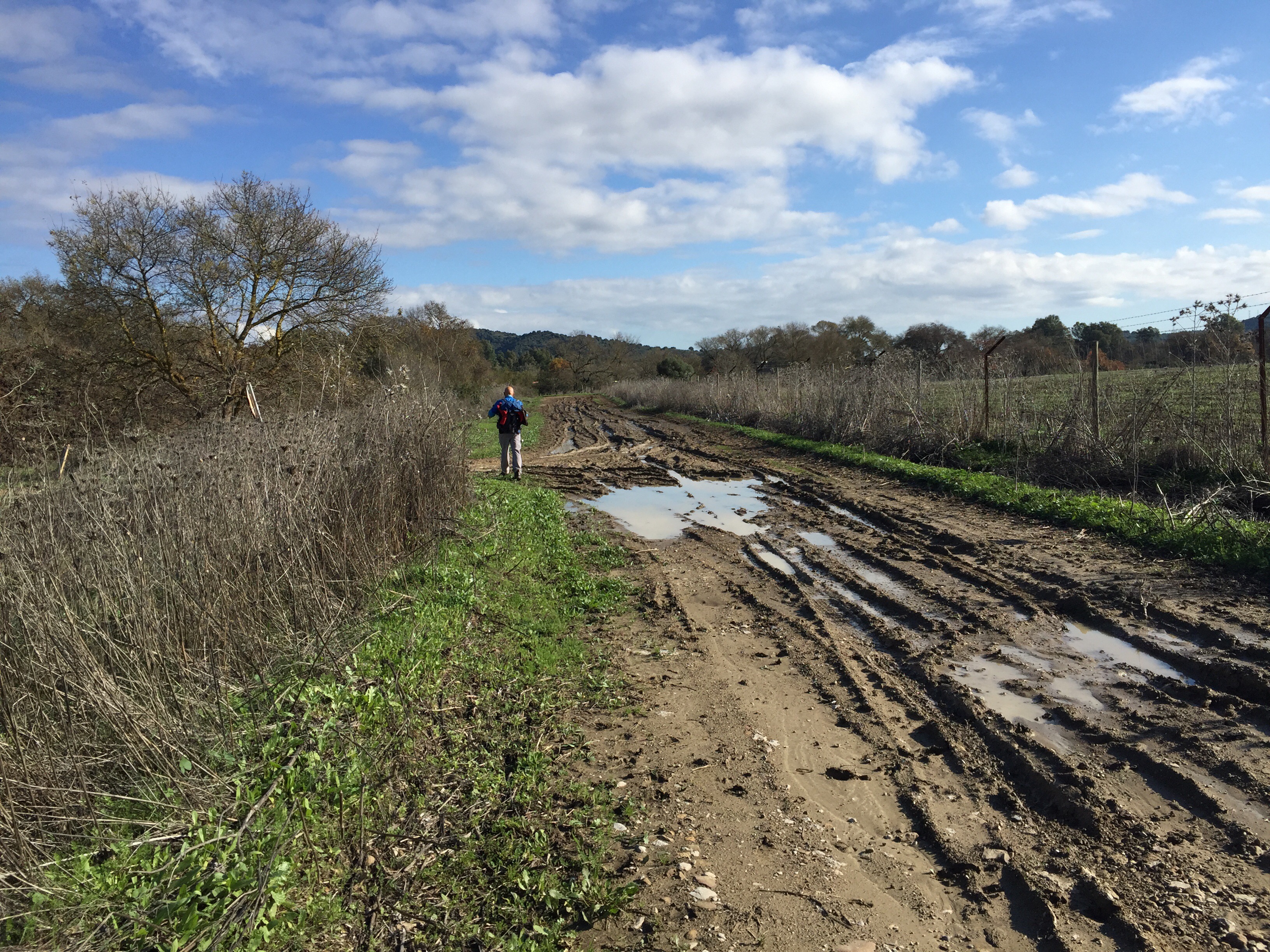 Castillo de Castellar – Jimena de la Frontera 22,7 kmLever du soleil depuis notre chambre. Je ne me lasse pas de photographier Gibraltar. Et c’est parti pour 5 h45 de marche. Départ sur une belle route avec un panneau cul-de-sac. Ça commence à se gâter !!!La route asphaltée s’arrête là, d’où le panneau cul-de-sac !!!Dimanche pendant l’orage ça devait être impraticable. Les cornes sont impressionnantes, heureusement qu’il y a un grillage !!!J’avance difficilement à cause des cailloux. À partir de là ça va être de plus en plus difficile d’avancer. On patauge dans la boue d’une semaine de pluie !!!Mais que se passe-t-il ??? Un agriculteur a labouré le GR !!!Par moments on s’enfonce jusqu’à la cheville. On dirait qu’il a semé des fèves. Où alors ce sont les restes de l’année précédente qui ont germé. A la sortie du champ mes chaussures pèsent une tonne. Changement de chemin, c’est pas mieux. Il est inondé par endroits et bordé de ronces. Par moments on est obligé de marcher sur les bords pour ne pas se mouiller, alors on s’égratigne. Il y a tout de même de très beaux passages. On dirait des panneaux d’un jeu de Lego !!! Ils sont vrais, on va traverser la voie ferrée qu’on a longé pendant plus de 10 km. Et enfin apercevoir Jimena à flanc de colline. Et c’est fini pour aujourd’hui !!!