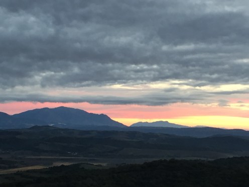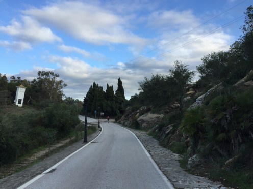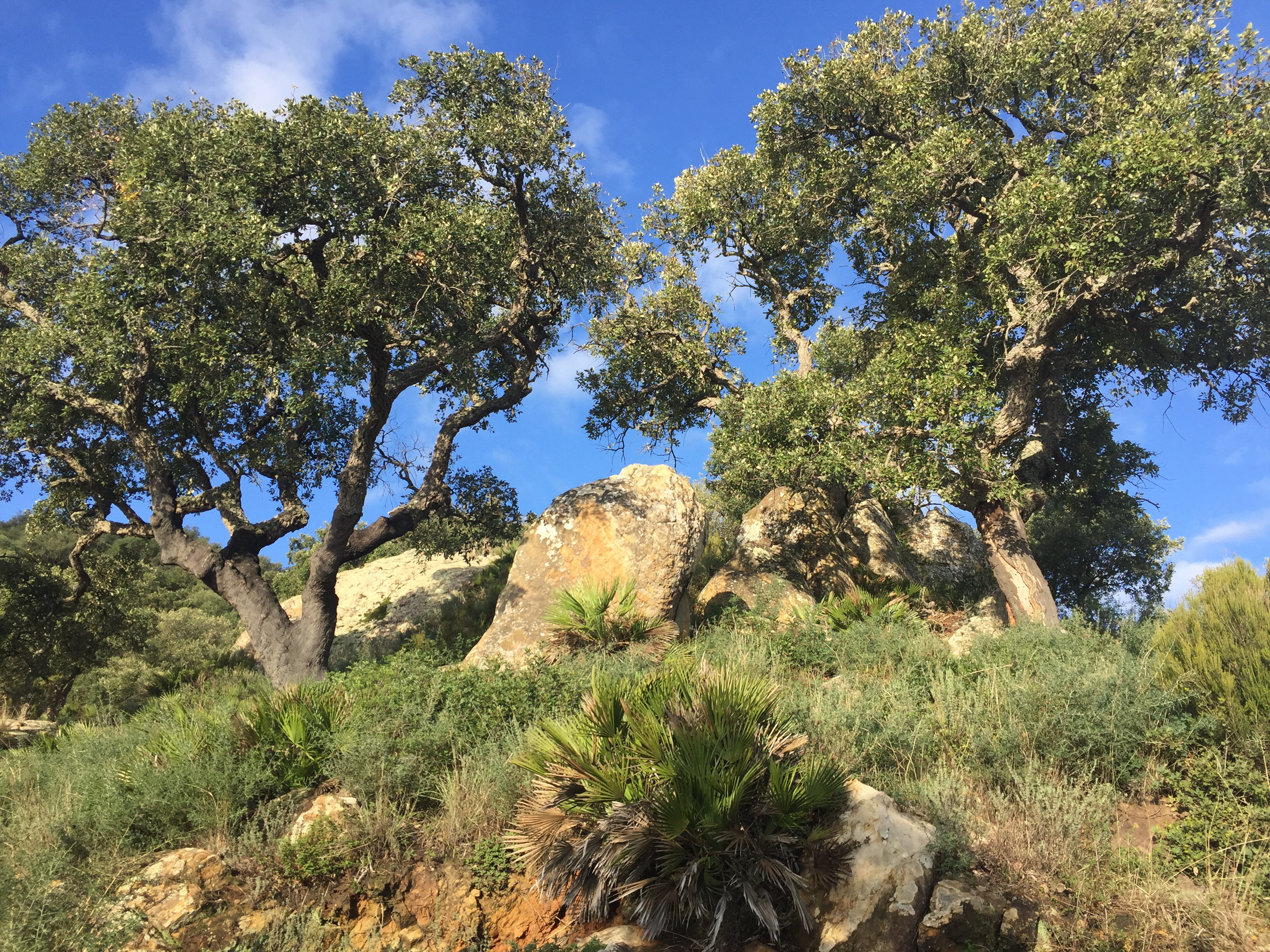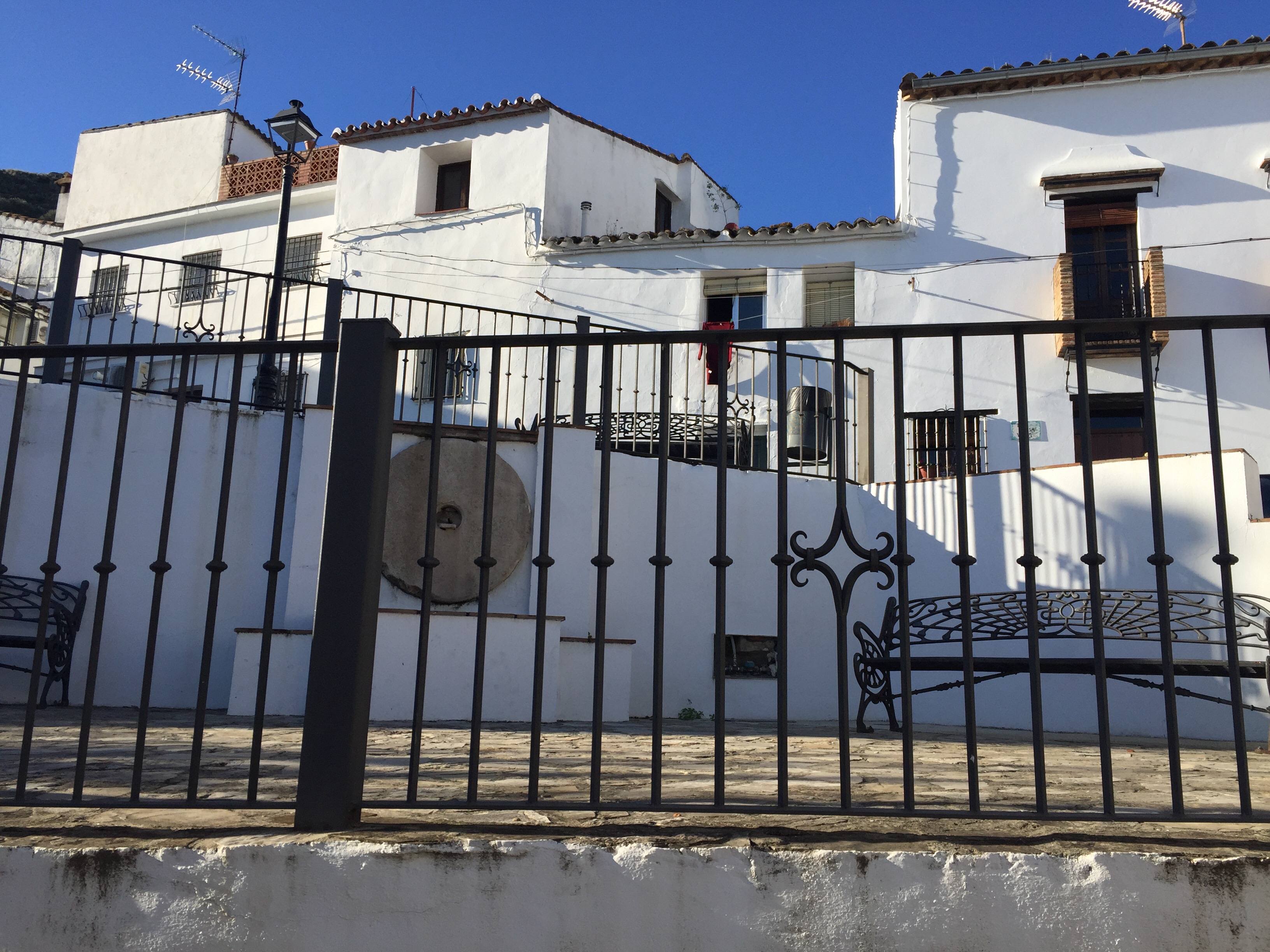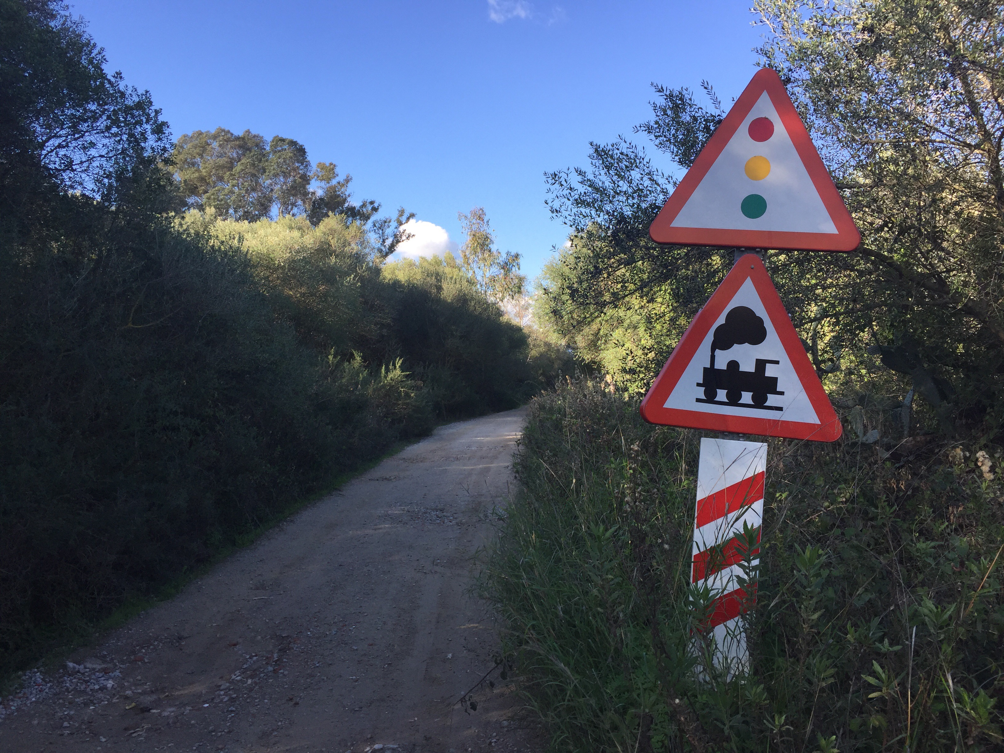 Castillo de Castellar – Jimena de la Frontera 22,7 kmLever du soleil depuis notre chambre. Je ne me lasse pas de photographier Gibraltar. Et c’est parti pour 5 h45 de marche. Départ sur une belle route avec un panneau cul-de-sac. Ça commence à se gâter !!!La route asphaltée s’arrête là, d’où le panneau cul-de-sac !!!Dimanche pendant l’orage ça devait être impraticable. Les cornes sont impressionnantes, heureusement qu’il y a un grillage !!!J’avance difficilement à cause des cailloux. À partir de là ça va être de plus en plus difficile d’avancer. On patauge dans la boue d’une semaine de pluie !!!Mais que se passe-t-il ??? Un agriculteur a labouré le GR !!!Par moments on s’enfonce jusqu’à la cheville. On dirait qu’il a semé des fèves. Où alors ce sont les restes de l’année précédente qui ont germé. A la sortie du champ mes chaussures pèsent une tonne. Changement de chemin, c’est pas mieux. Il est inondé par endroits et bordé de ronces. Par moments on est obligé de marcher sur les bords pour ne pas se mouiller, alors on s’égratigne. Il y a tout de même de très beaux passages. On dirait des panneaux d’un jeu de Lego !!! Ils sont vrais, on va traverser la voie ferrée qu’on a longé pendant plus de 10 km. Et enfin apercevoir Jimena à flanc de colline. Et c’est fini pour aujourd’hui !!!