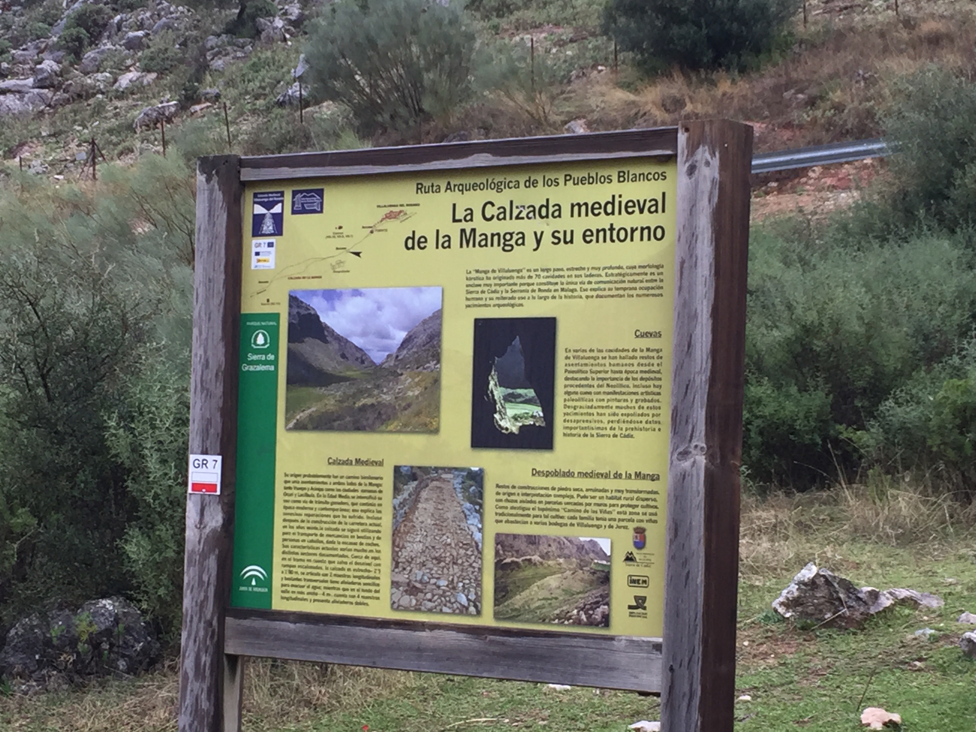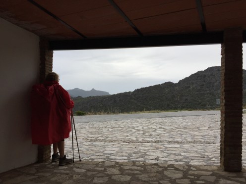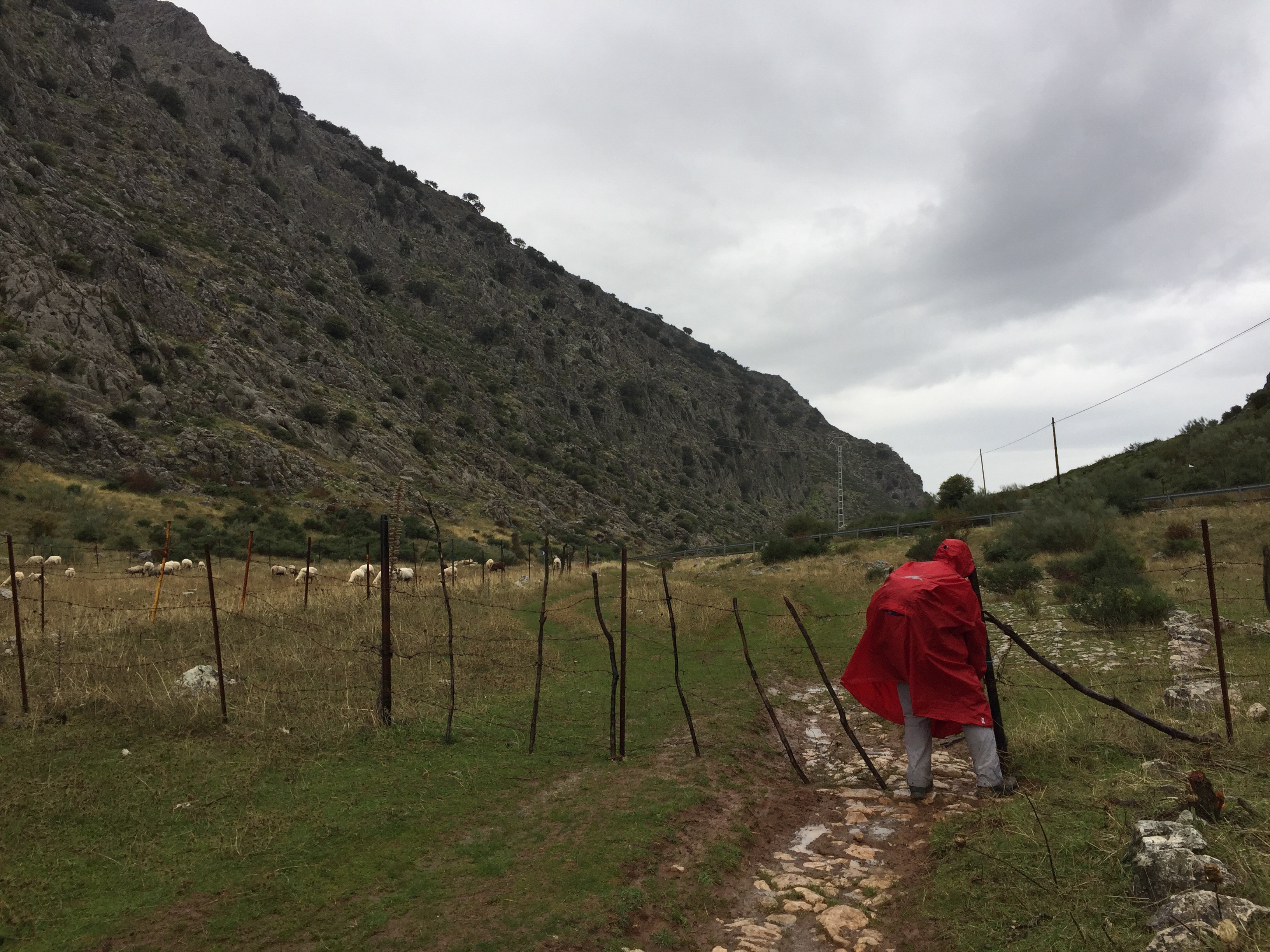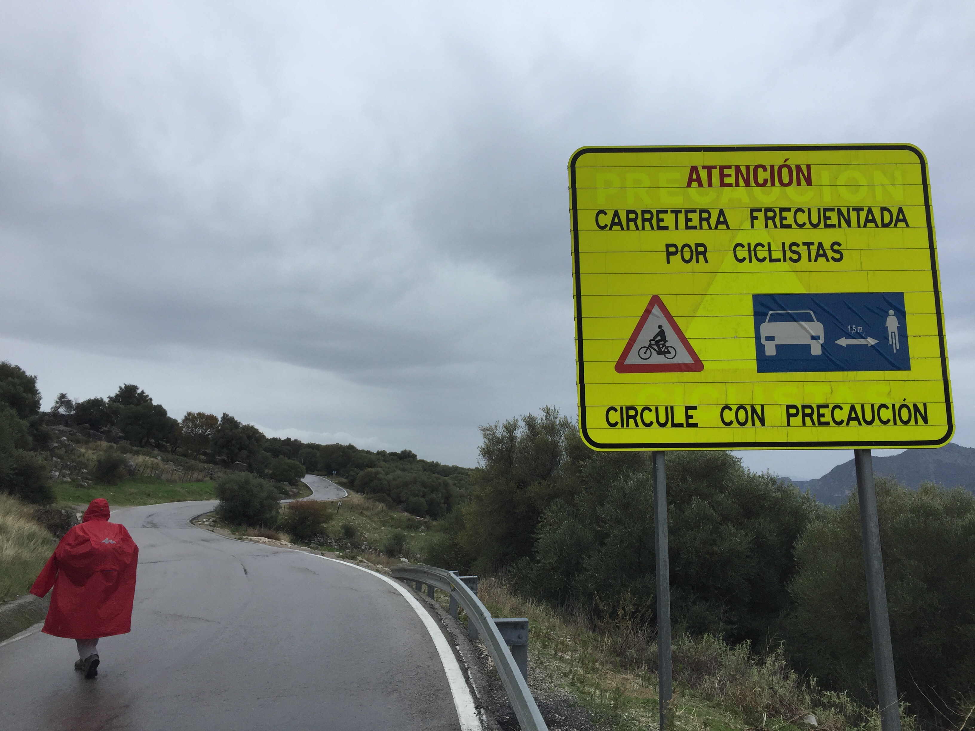 Lorsque nous sommes arrivés à Benaocaz il n’y avait plus de marque du GR. Nous avons regardé les traces GPS du Caminaire le site où je récupère le trajet mais lui, il avait évité le village. Donc on voulu regarder sur le livre où il y a le GR. Pas de livre dans nos sacs. Appel de notre logeuse qui l’avait trouvé et qui me propose de m’envoyer le livre dans une voiture pour la modique somme de 20 €. Moralité, quand on n’a pas de tête on a des sous !!!Si on ne voit pas le panneau, c’est grave !!! Ce n’est pas comme nos panneaux français « de partageons la route ». Cette fois-ci c’est une chaussée médiévale. Elle est pas belle l’épingle à linge pour tenir la capuche sur la casquette ??? Il pleut depuis Benaocaz. Juste une petite pluie fine qui ne nous gêne pas du tout. Là le GR n’est pas terrible !!! En dévers sous la route…Par contre l’entrée de Villaluenga est royale pour 480 habitants !!!Le mur d’escalade. 15 h 45 repas de midi !!!