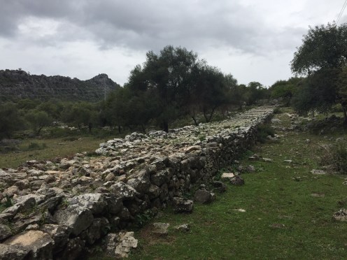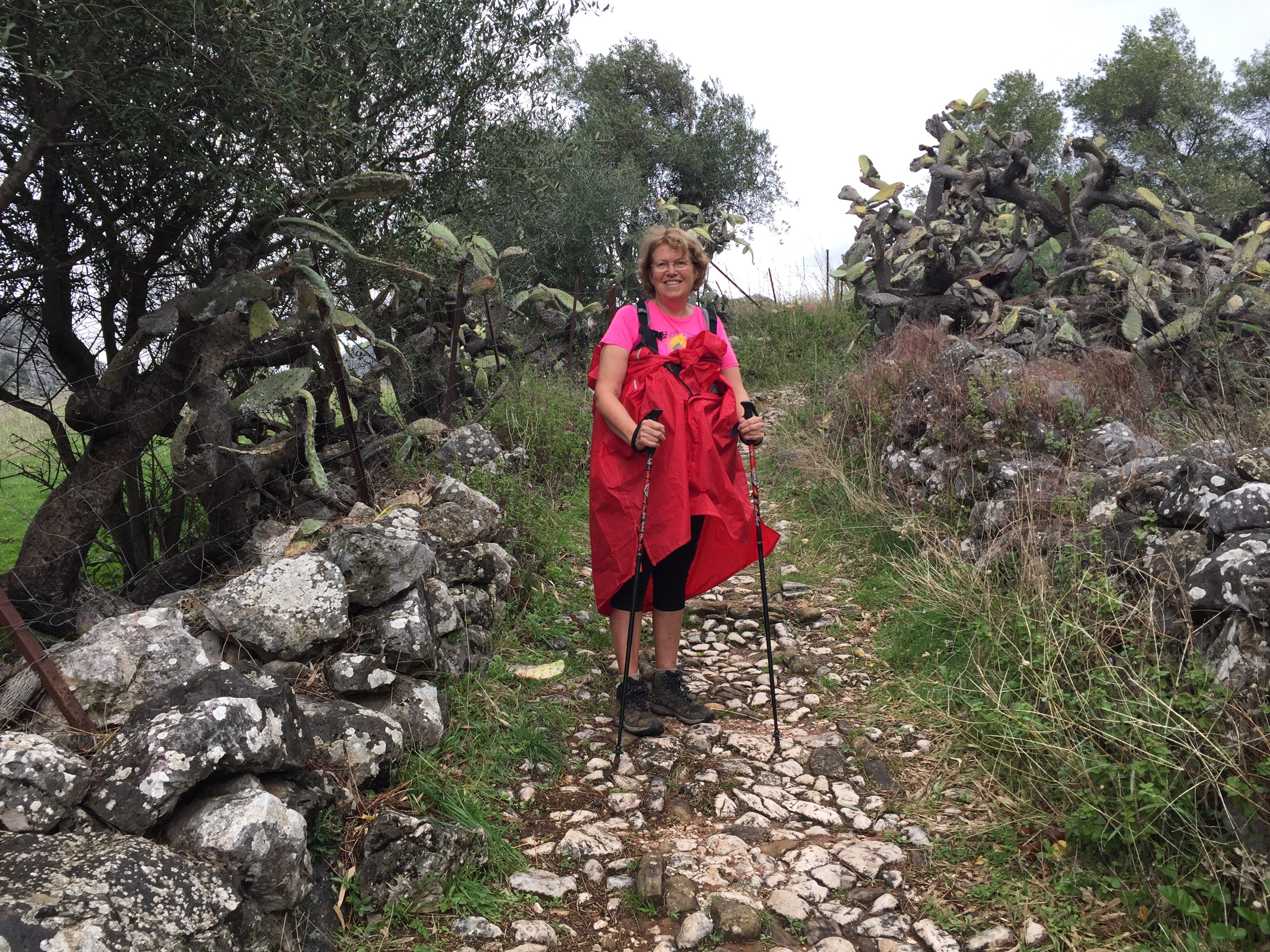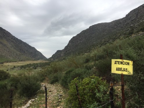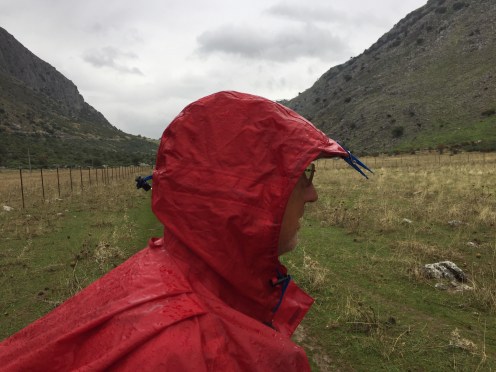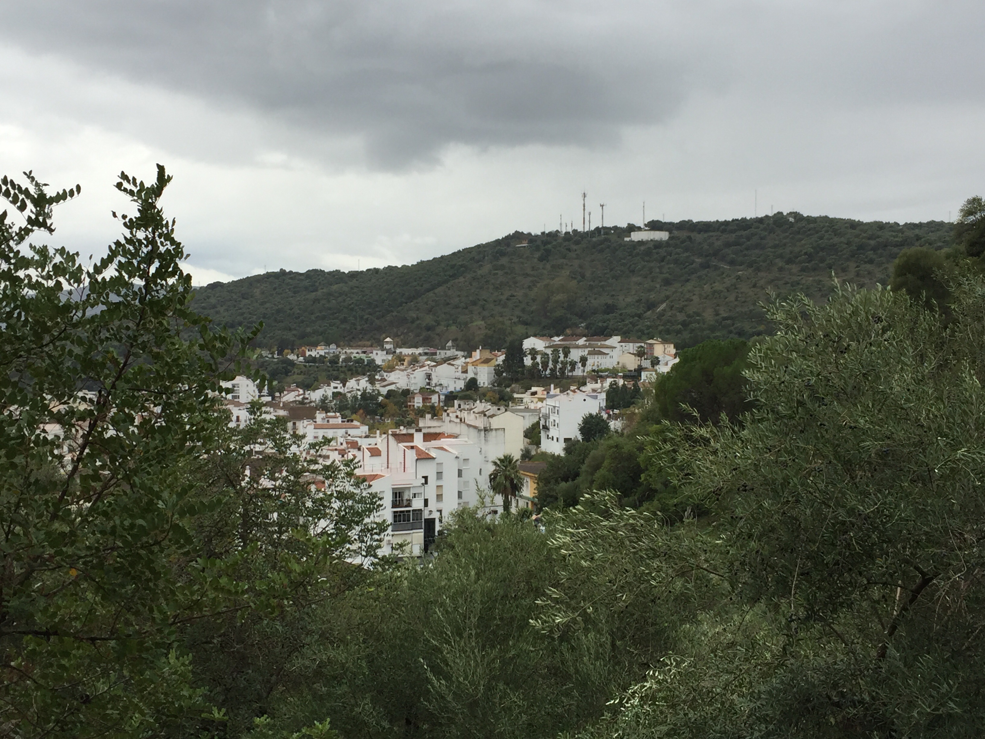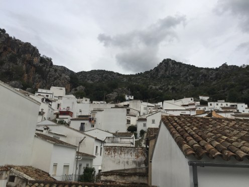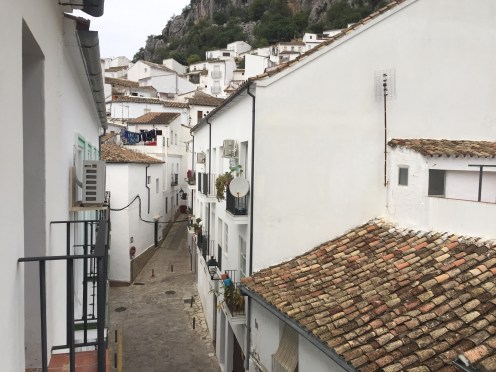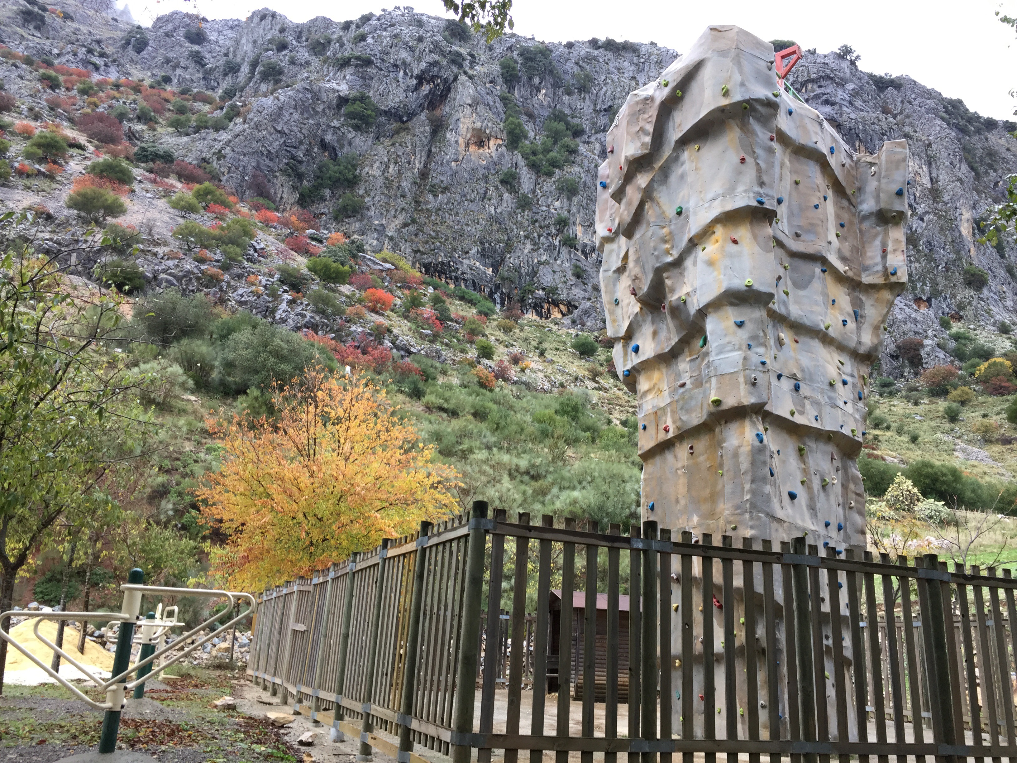Lorsque nous sommes arrivés à Benaocaz il n’y avait plus de marque du GR. Nous avons regardé les traces GPS du Caminaire le site où je récupère le trajet mais lui, il avait évité le village. Donc on voulu regarder sur le livre où il y a le GR. Pas de livre dans nos sacs. Appel de notre logeuse qui l’avait trouvé et qui me propose de m’envoyer le livre dans une voiture pour la modique somme de 20 €. Moralité, quand on n’a pas de tête on a des sous !!!Si on ne voit pas le panneau, c’est grave !!! Ce n’est pas comme nos panneaux français « de partageons la route ». Cette fois-ci c’est une chaussée médiévale. Elle est pas belle l’épingle à linge pour tenir la capuche sur la casquette ??? Il pleut depuis Benaocaz. Juste une petite pluie fine qui ne nous gêne pas du tout. Là le GR n’est pas terrible !!! En dévers sous la route…Par contre l’entrée de Villaluenga est royale pour 480 habitants !!!Le mur d’escalade. 15 h 45 repas de midi !!!