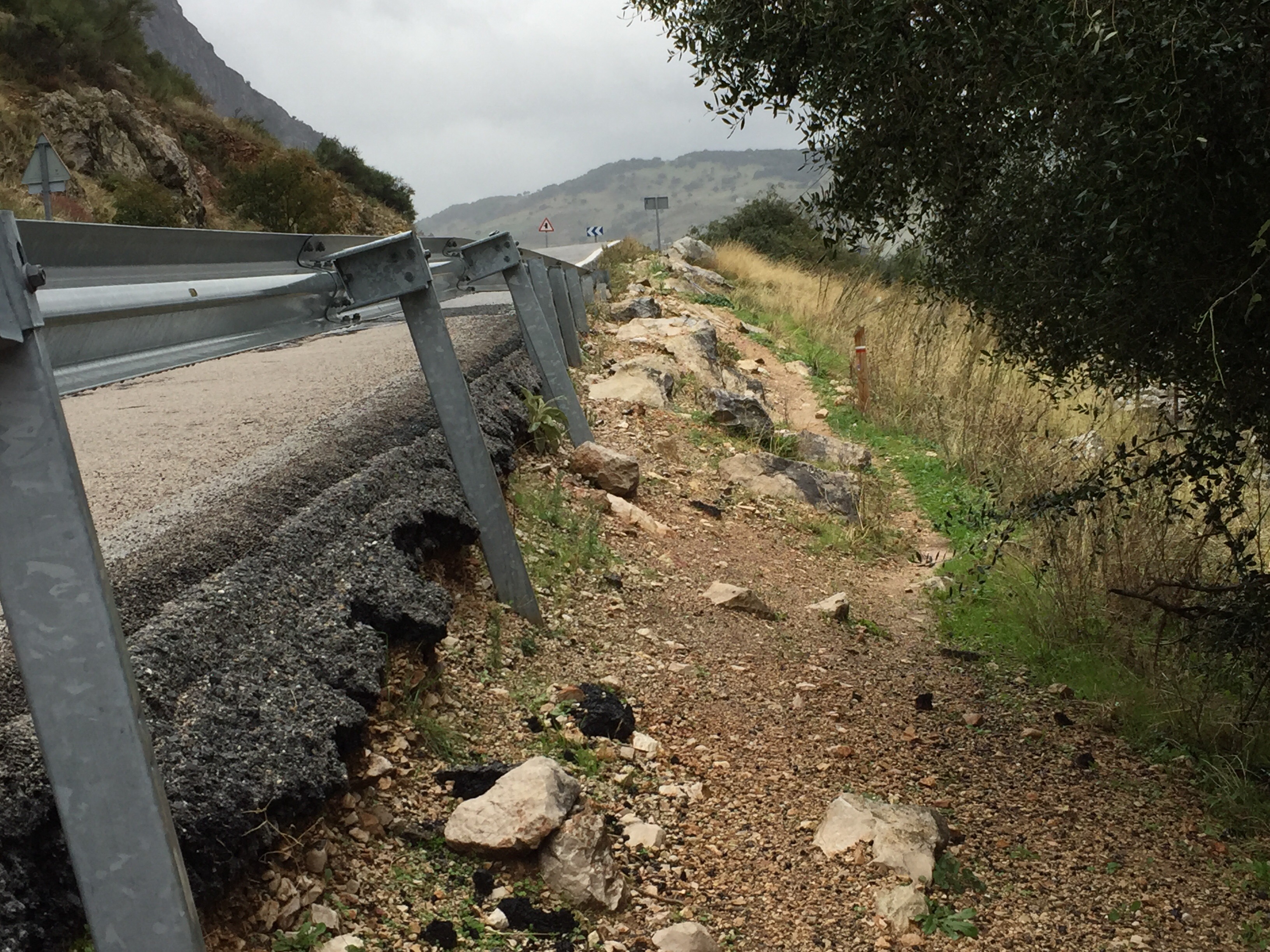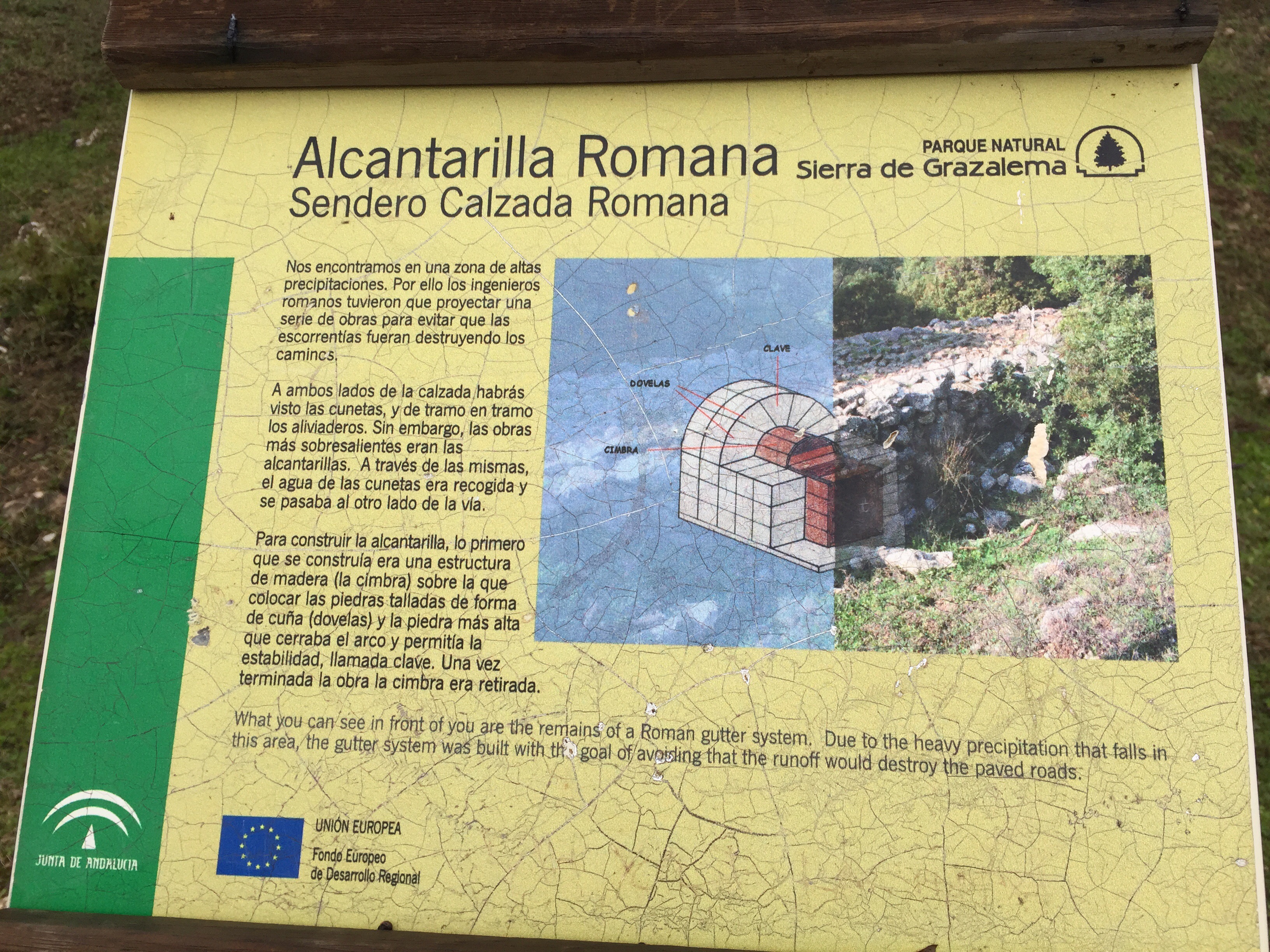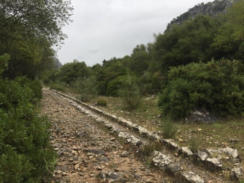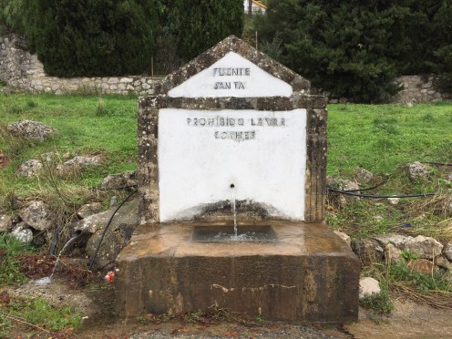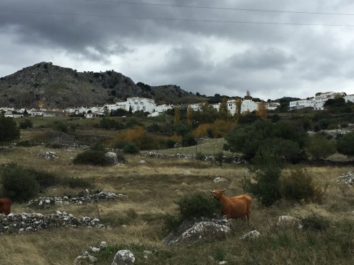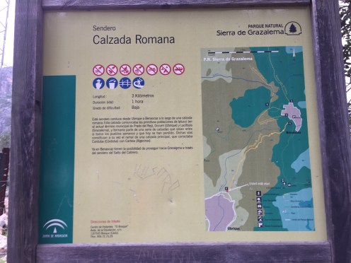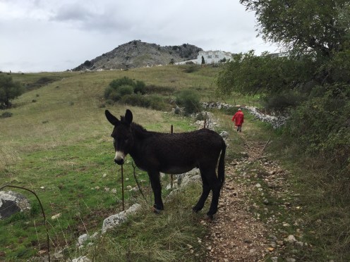 Pendant ce temps là, j’attends devant le cabinet d’un podologue. C’est 10 h30, il ouvre à 10 h, il y a déjà une personne qui attend devant moi. Lorsque Yves revient nous partons. Tant pis je ne lui montrerai pas mon ampoule qui va mieux mais surtout mon ongle qui est plein de sang !!!Au loin Ubrique. 3 km de montée sur une chaussée romaine. La chaussée est surélevée par endroits. On a même l’explication de la fabrication des caniveaux. Arrivée à Benaocaz. Nouveauté sur moi, des bâtons !!! Yves me les a fait acheter, hier soir, pour soulager mon pied. Tout seul au bord du chemin. Le pauvre, il est attaché. Et là, qu’est-ce que je fais ??? J’attends une voiture qui doit me porter le livre que j’ai oublié à l’hostal !!!