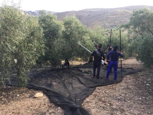 Ça fait deux jours que nous entendons des tronçonneuses. Erreur, ce sont des outils pour faire vibrer les branches et tomber les olives. Le kilo d’olive leur est payé entre 0,60 et 0,70€ !!! C’est pas grand chose !!!