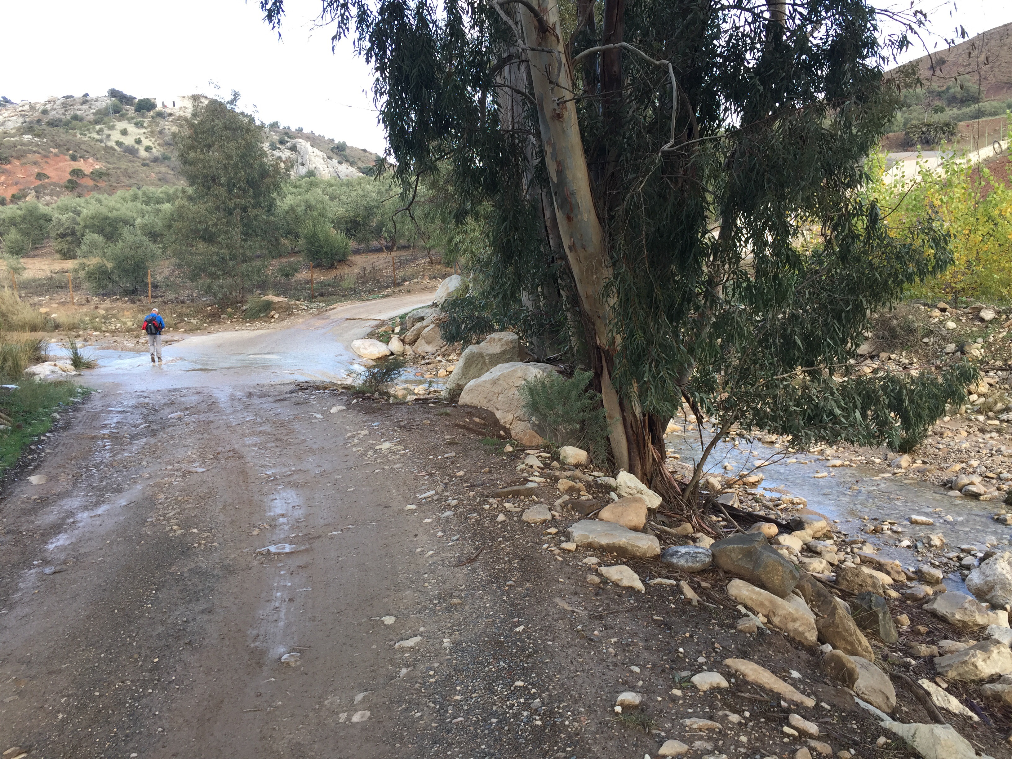 Nous débutons sur la route qui va à Antequera. Ensuite nous tournons à droite vers une ferme. Aujourd’hui aucune indication du GR. Heureusement que nous avons les traces GPS récupérées sur le site du Caminaire. Nous verrons seulement une croix rouge et blanche au 6ème kilomètre, tellement mal placée que nous ne savions même pas quel chemin elle nous interdisait.