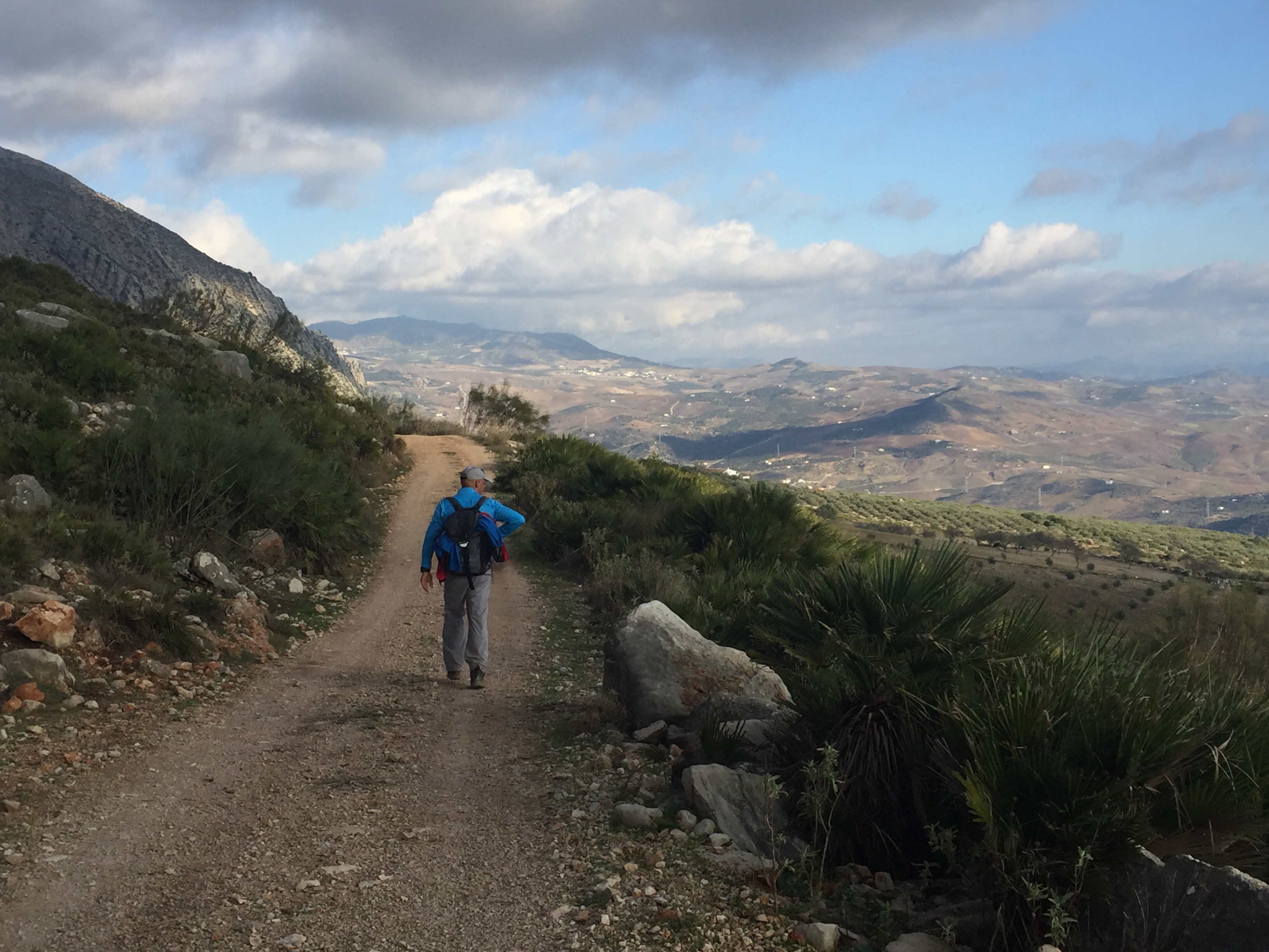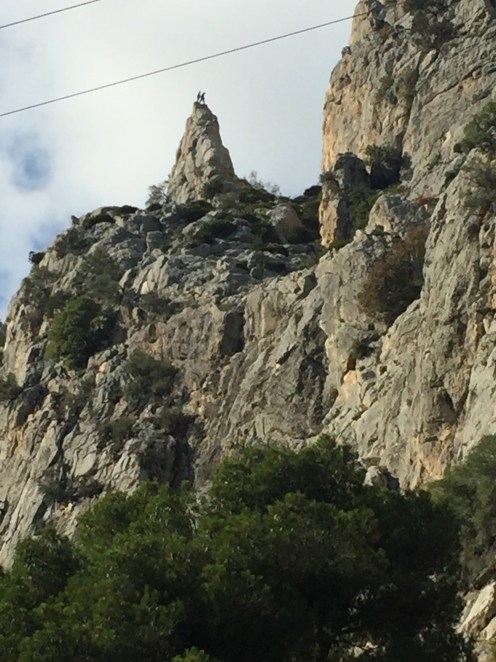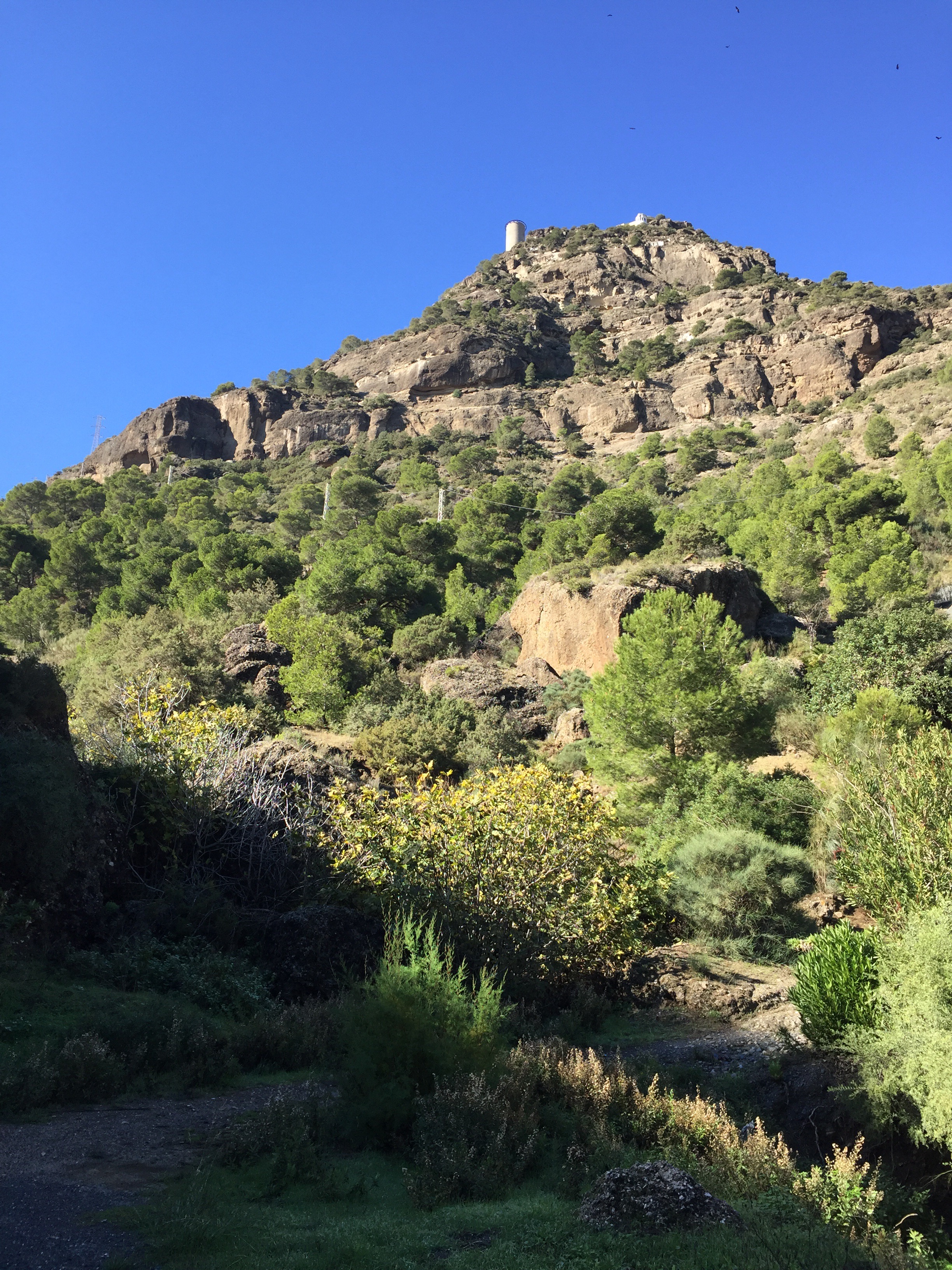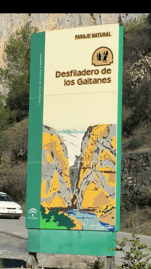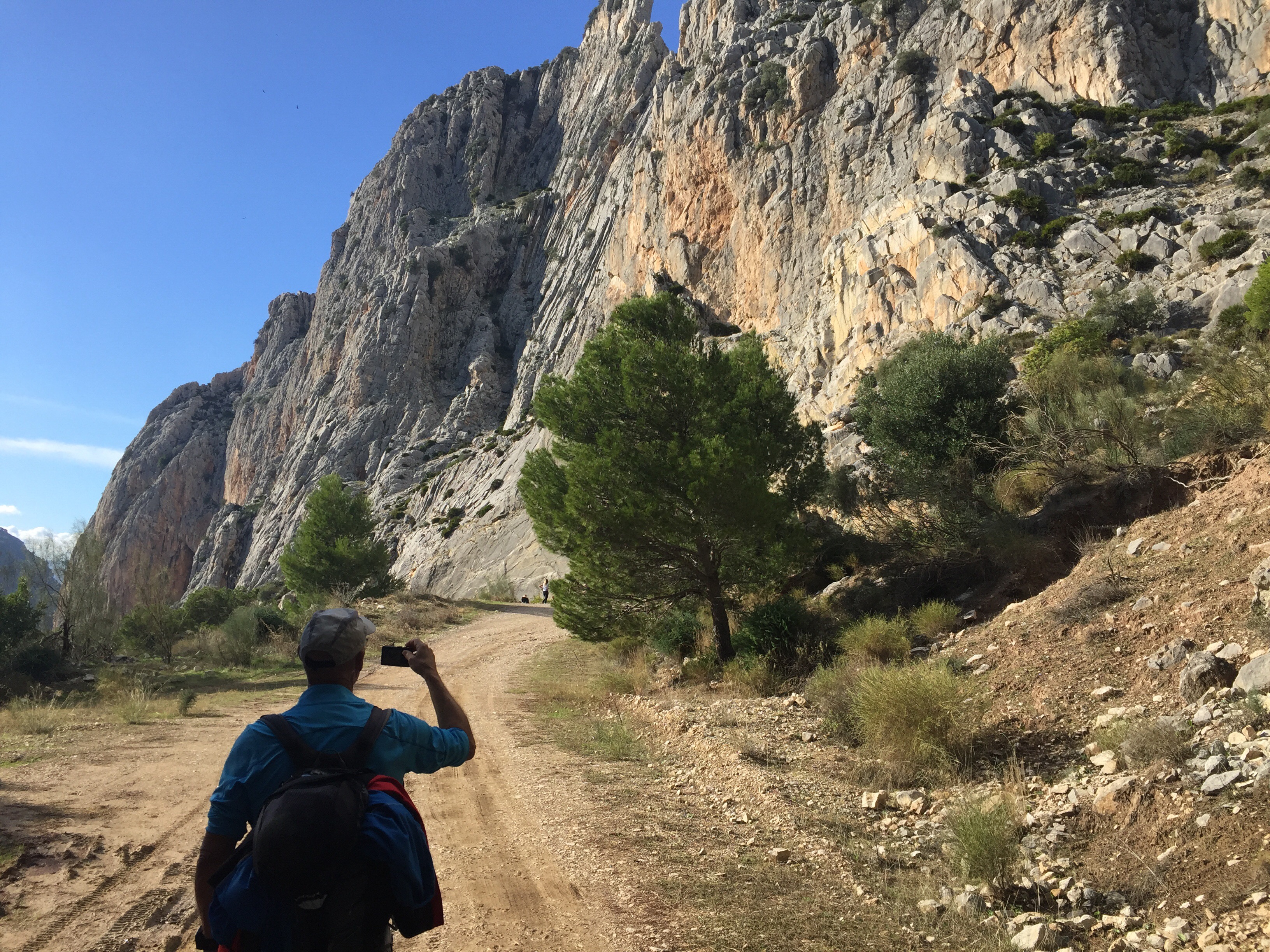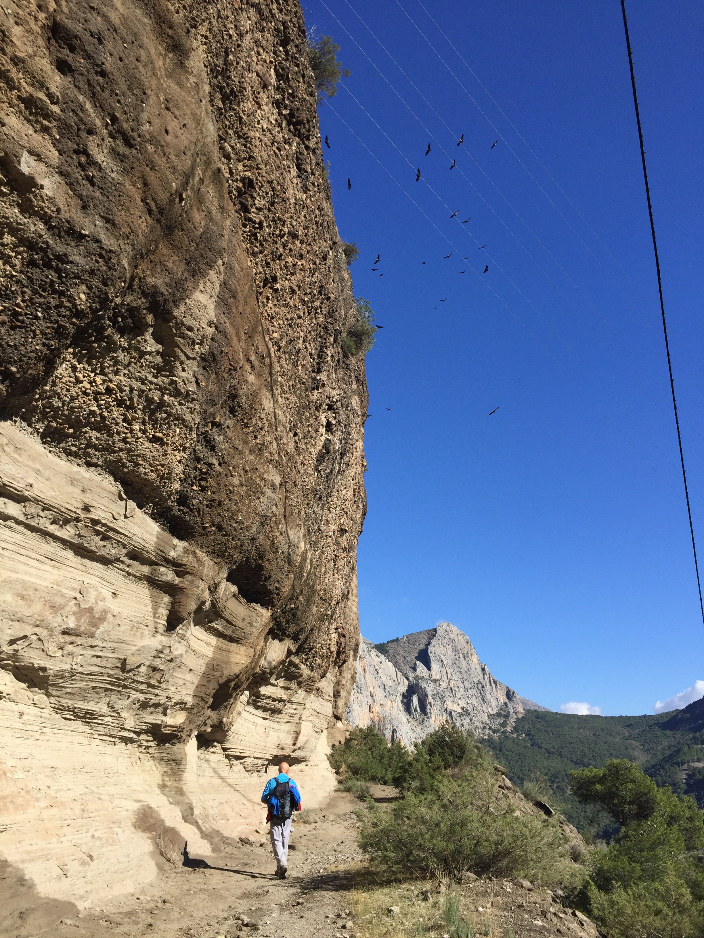 https://m.youtube.com/watch?v=ZmDhRvvs5XwA partir de là nous allons faire une descente interminable sur un sentier en très mauvais état, jusqu’à El Chorro. C’est à El Chorro qu’il y a l’accès au Caminito del Rey. Les rapaces tournent au dessus de nos têtes !!!Tout à l’heure nous étions là-haut au niveau de la tour. Je suis ravie d’avoir mes bâtons pour m’aider dans les descentes.  C’est dans ce défilé qu’il y a le Caminito. Nous n’irons pas jusque-là, ça aurait fait 4 km de plus. Un peu long pour moi. Nous préférons faire une pose dans un bar pour manger. Excellente idée car après, ça monte, ça monte, c’est interminable et il fait chaud. Yves n’a que son T-shirt à manches longues !!! C’est exceptionnel, il n’a plus qu’une couche au lieu des trois habituelles !!!Le paysage est très beau. De grandes falaises, sur lesquelles on voit des gens qui font de l’escalade. Et oui jour férié, nous avons rencontré beaucoup de promeneurs. En haut du petit rocher pointu il y a deux personnes !!!Soudainement, le paysage change nous montions dans une forêt de pins, nous voilà au milieu d’oliviers cultivés. La vue est grandiose. Ça continue à descendre, on ne sait pas si on aperçoit Valle de Abdalajis. Ce qui est rassurant c’est qu’il y a de plus en plus de maisons. Enfin nous sommes arrivés !!!