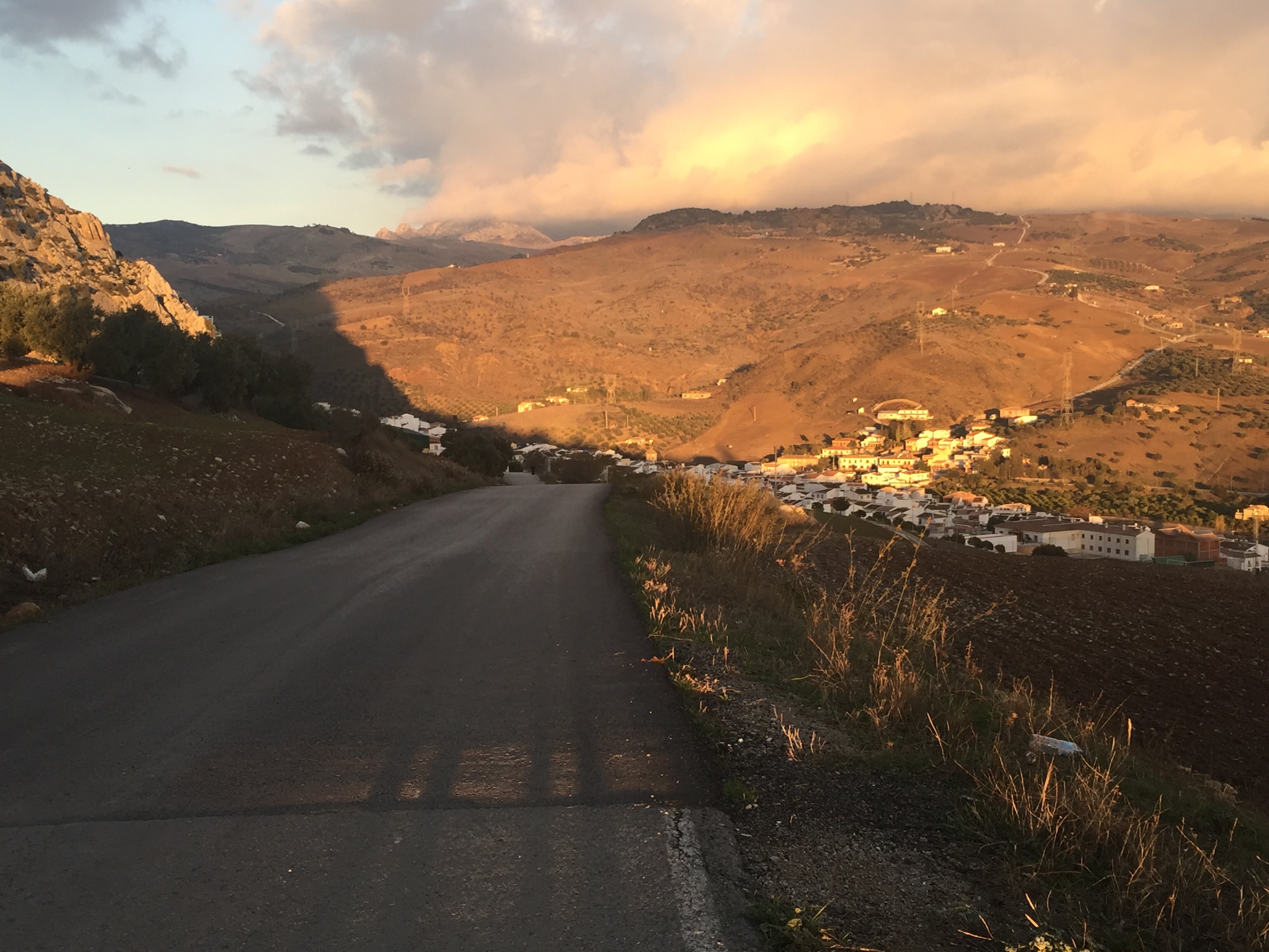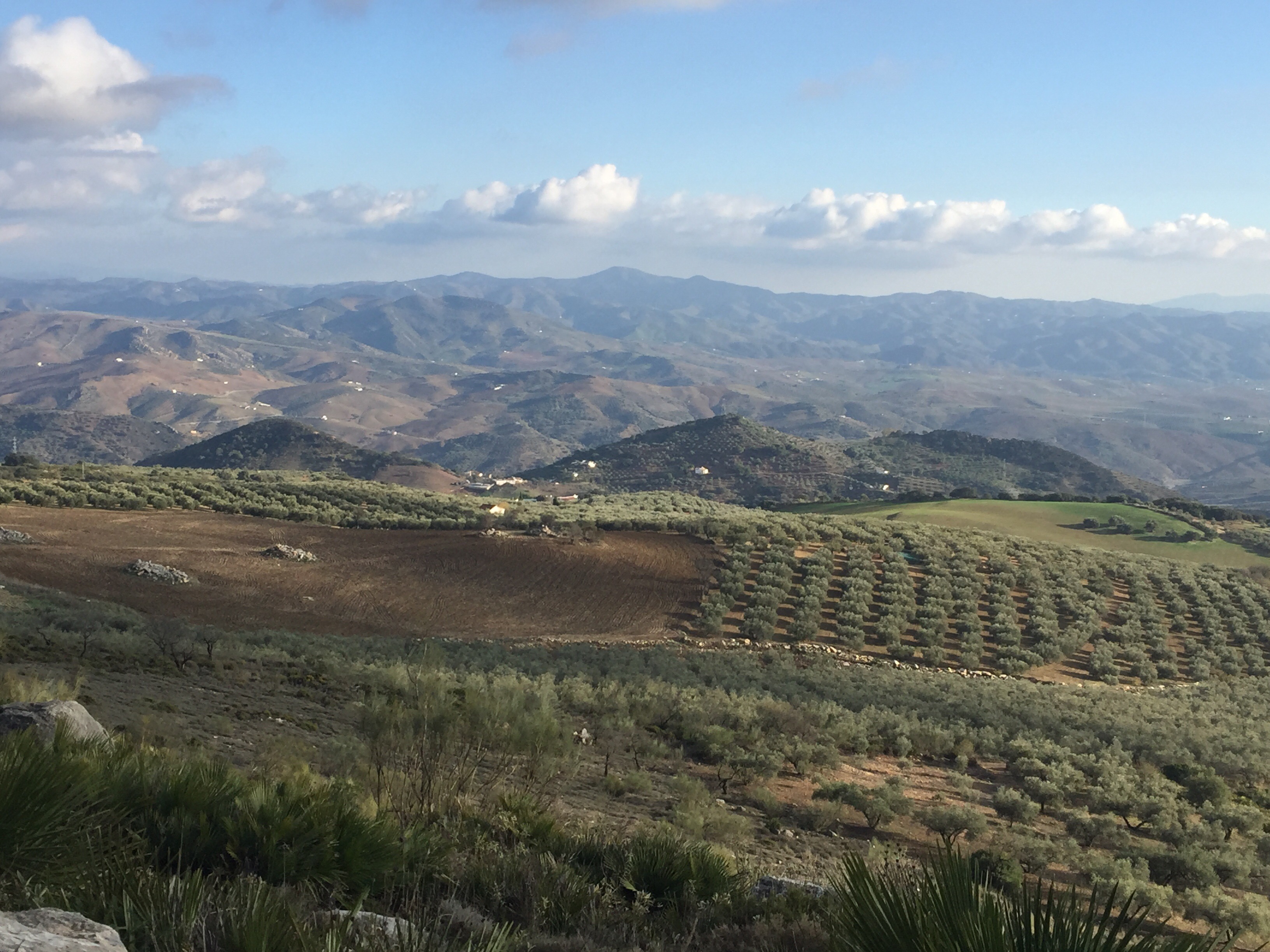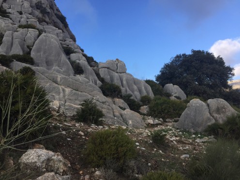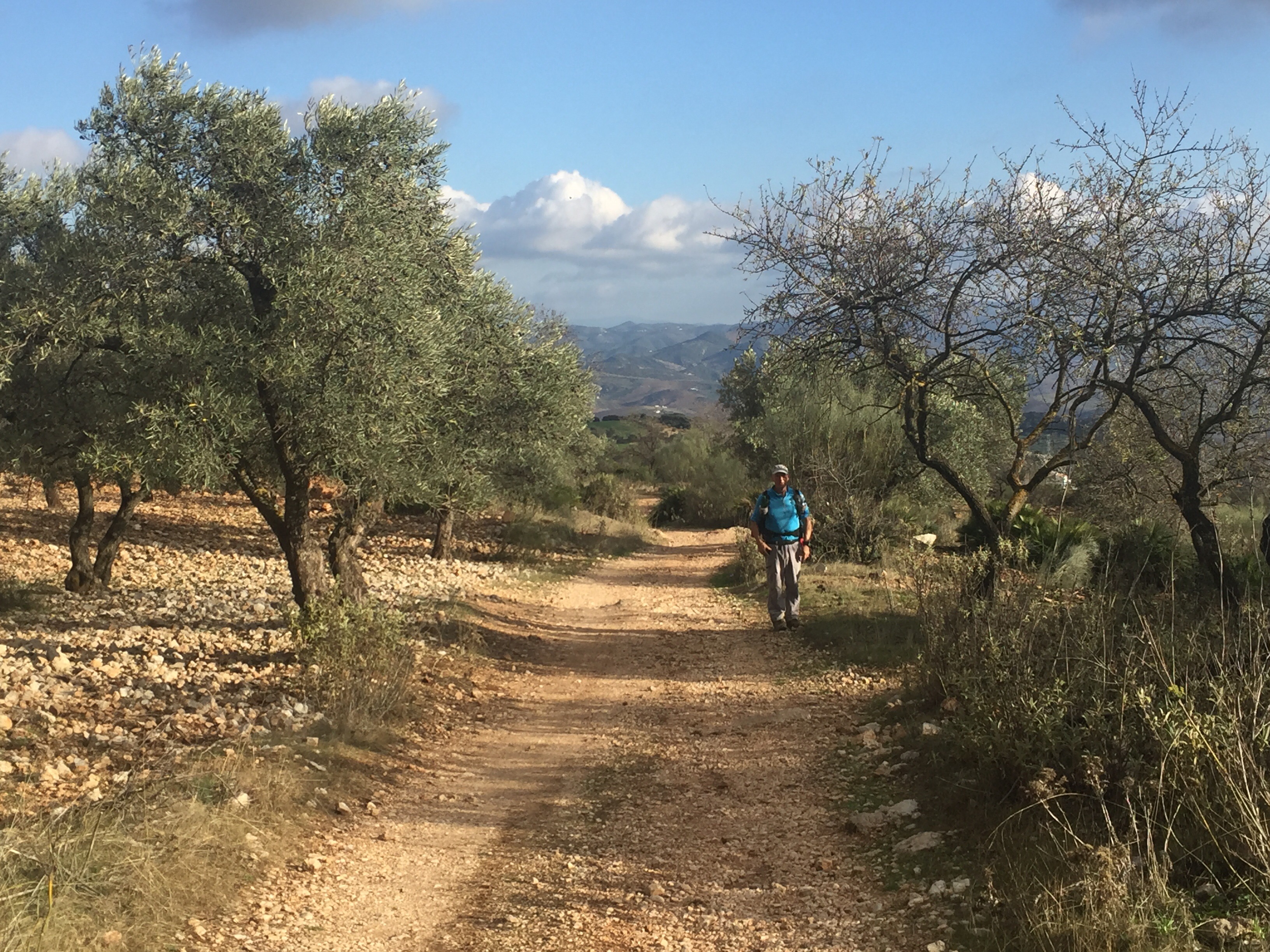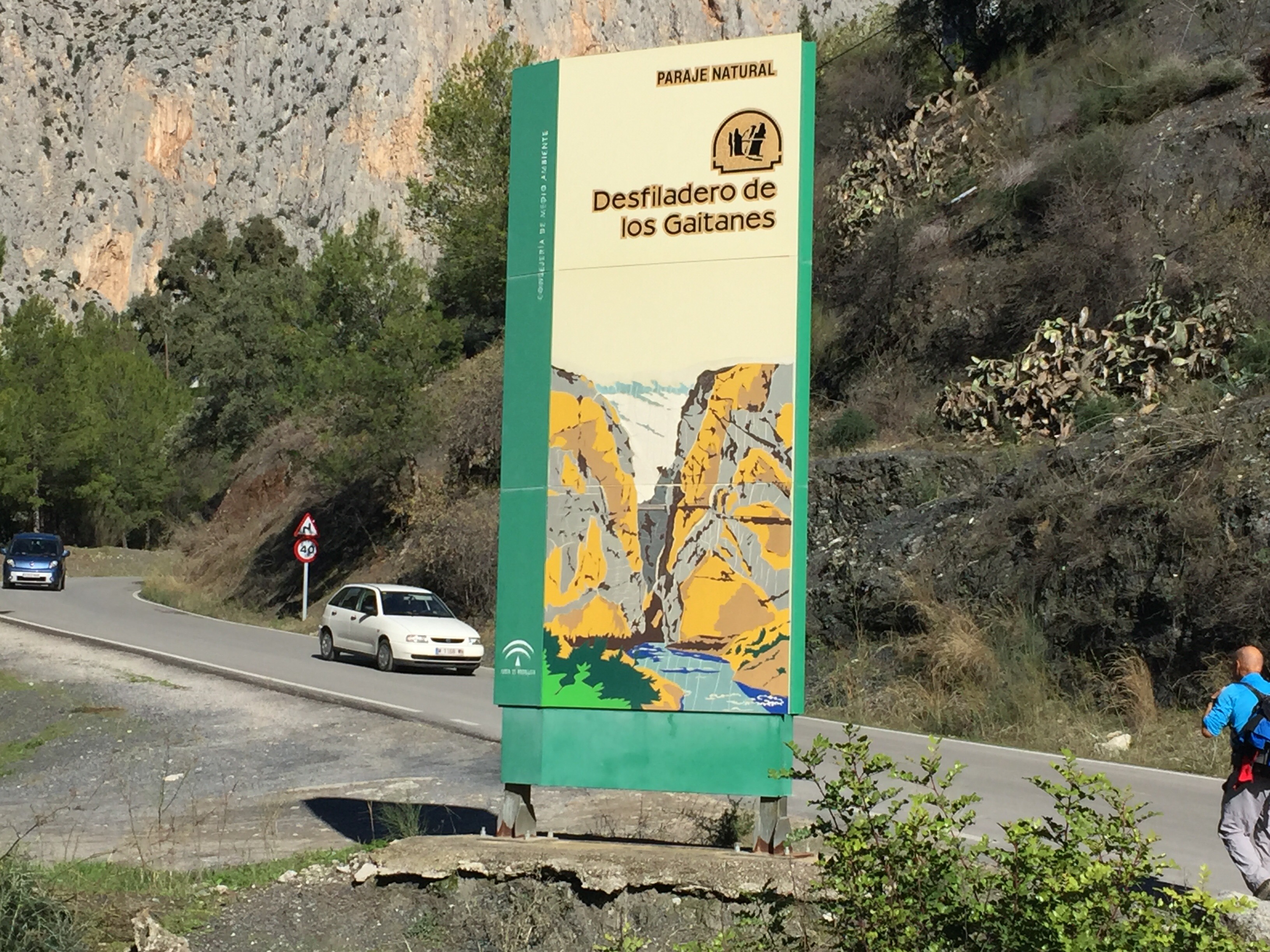 https://m.youtube.com/watch?v=ZmDhRvvs5XwA partir de là nous allons faire une descente interminable sur un sentier en très mauvais état, jusqu’à El Chorro. C’est à El Chorro qu’il y a l’accès au Caminito del Rey. Les rapaces tournent au dessus de nos têtes !!!Tout à l’heure nous étions là-haut au niveau de la tour. Je suis ravie d’avoir mes bâtons pour m’aider dans les descentes.  C’est dans ce défilé qu’il y a le Caminito. Nous n’irons pas jusque-là, ça aurait fait 4 km de plus. Un peu long pour moi. Nous préférons faire une pose dans un bar pour manger. Excellente idée car après, ça monte, ça monte, c’est interminable et il fait chaud. Yves n’a que son T-shirt à manches longues !!! C’est exceptionnel, il n’a plus qu’une couche au lieu des trois habituelles !!!Le paysage est très beau. De grandes falaises, sur lesquelles on voit des gens qui font de l’escalade. Et oui jour férié, nous avons rencontré beaucoup de promeneurs. En haut du petit rocher pointu il y a deux personnes !!!Soudainement, le paysage change nous montions dans une forêt de pins, nous voilà au milieu d’oliviers cultivés. La vue est grandiose. Ça continue à descendre, on ne sait pas si on aperçoit Valle de Abdalajis. Ce qui est rassurant c’est qu’il y a de plus en plus de maisons. Enfin nous sommes arrivés !!!